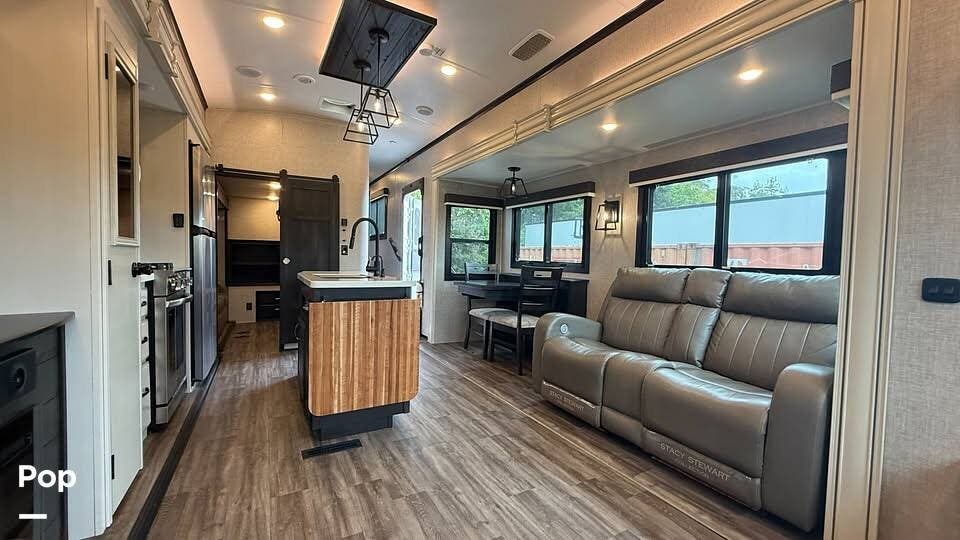 The living area is open and spacious, made brighter by large, dark-tinted safety-glass windows. Featuring vinyl flooring throughout and generous LED lighting with accent lights above slideouts.