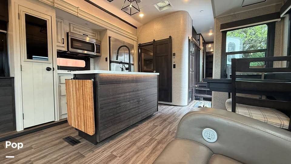 One of the standout features is the mid-level bonus room, which includes a tri-fold hide-a-bed sofa, an overhead bunk, and, above that, a loft. This tri-level arrangement provides versatile sleeping or lounging space, ideal for guests and kids, and can be converted as needed.