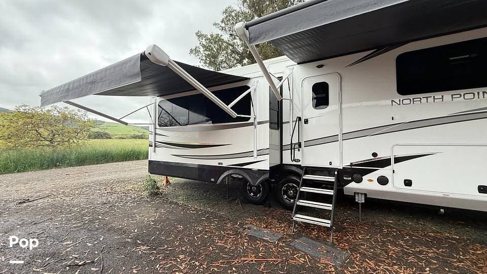 2023 North Point 377RLBH -- premium full-profile fifth wheel with four slideouts, dual electric awnings, and a bonus mid-den with a loft. This model offers robust construction, a high-capacity climate package, and flexible living & sleeping areas, making it ideal for extended stays or full-time use.