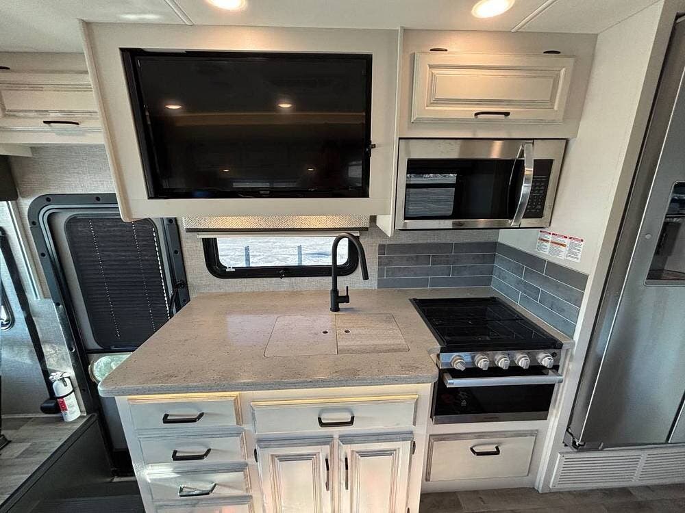 The kitchen is fully equipped with a residential refrigerator, a Furrion all-in-one cooktop and oven, a full-size microwave, and a stainless steel sink with LED-lit solid-surface countertops. Whether you are making a quick breakfast before hitting the road or cooking a full dinner at your campsite, this kitchen handles it all.