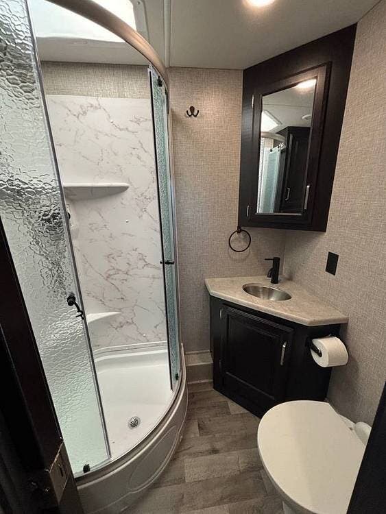 Rest is just as impressive as the rest of the rig. The rear master suite features a 72x80 King Bed with nightstands that include USB ports and wireless charging. For the kids or grandkids, the 36A has bunk beds with built-in tablet holders, plus an optional drop-down overhead bunk in the cab area that holds up to 750 pounds -- giving you even more sleeping capacity when the whole crew comes along. With two full bathrooms -- including a 32x32 front shower and a 30x36 rear shower -- morning routines are a breeze even with a full house on board.
