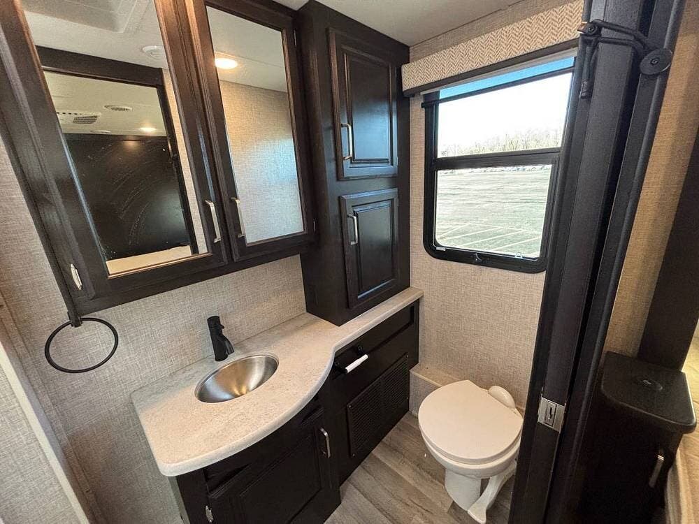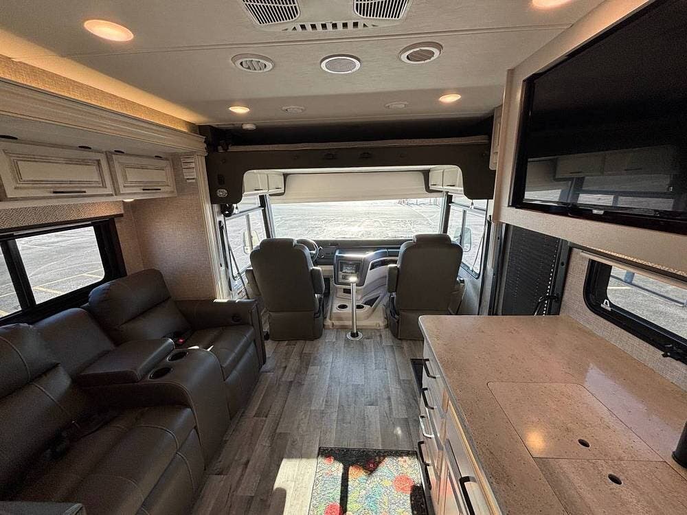 Under the hood, this motorhome is just as capable as it is comfortable. The Ford F53 chassis is powered by a 7.3-liter V8 engine with 335 horsepower and 468 foot-pounds of torque, paired with a smooth 6-speed TorqShift automatic transmission. The JRIDE Plus suspension package -- which includes Bilstein shocks, Koni shock absorbers, heavy-duty stabilizer bars, and Michelin commercial-grade tires -- makes this one of the smoothest-riding Class A coaches you can buy.