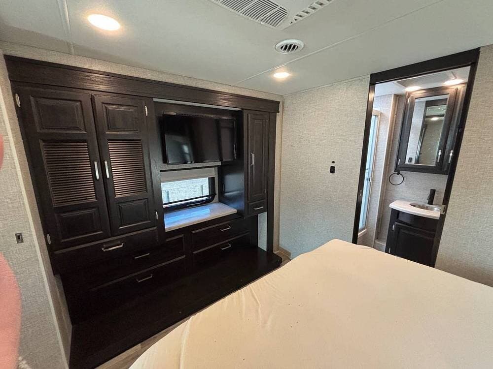 The outside entertainment center adds even more fun to your stays, with an LED smart TV on a swivel bracket and exterior speakers perfect for evenings under the stars beneath the 12-foot electric awning.