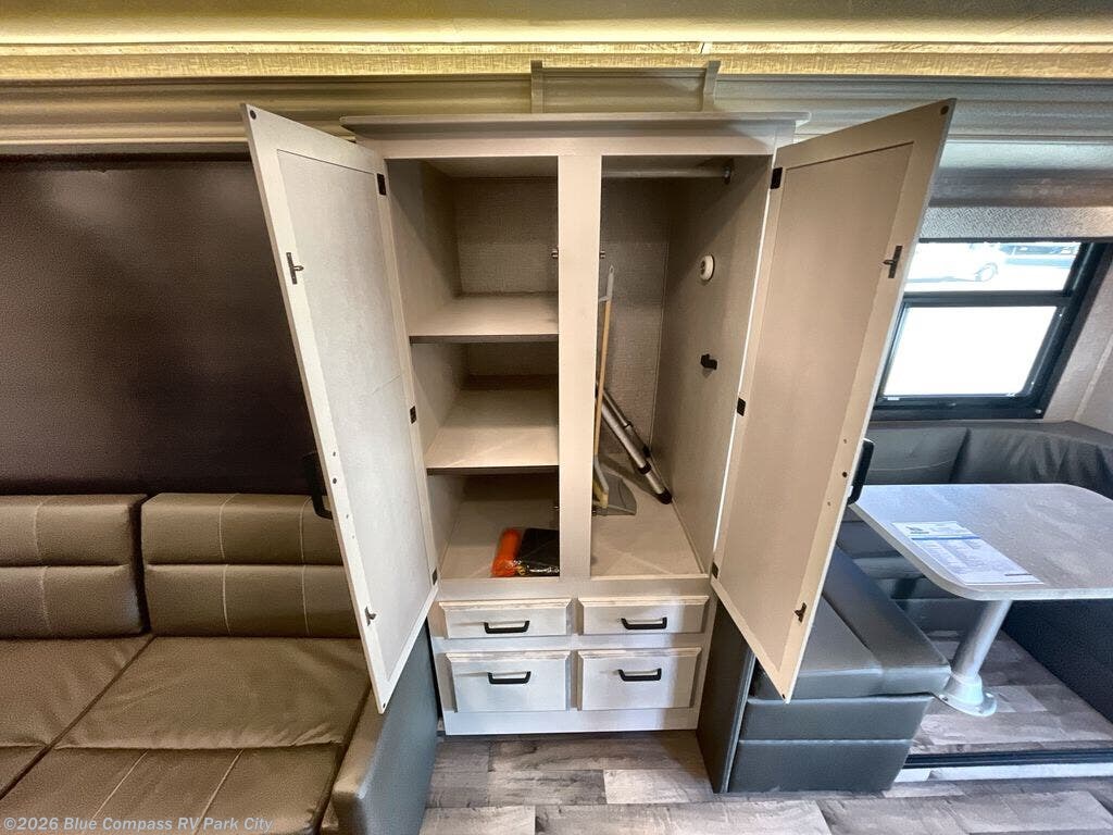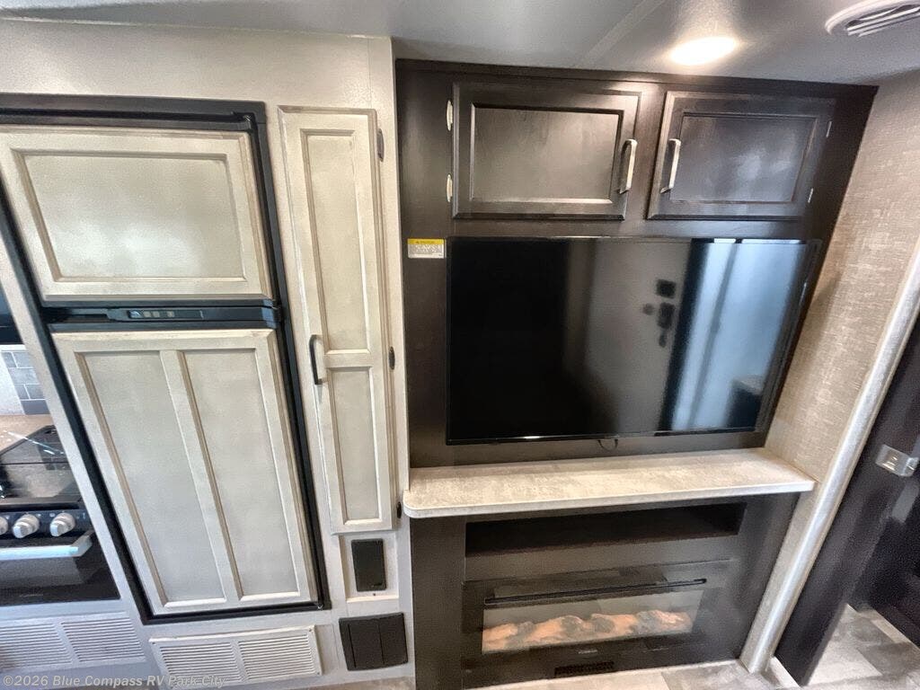 Enjoy a versatile space with the queen Murphy bed and sofa combination which allows you to relax and watch the 50" LED HD Smart Fire TV with a fireplace. The rear full bathroom is spacious, and provides extra counter space, linen storage, plus a space savings sliding door. The cook will love the galley kitchen with everything nearby including a residential-size microwave, a pantry and the 8 cu. ft. refrigerator. The cook can use the outside kitchen as well. Dine at the U-shaped dinette or while outside sitting under the 19' electric awning, yet you might chose the theater seating option if you like that type of comfort. And the cab over bunk is sure to be a popular place to sleep when you have guests.