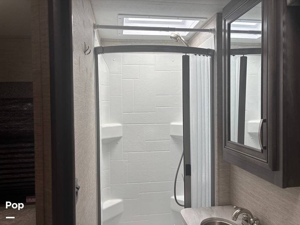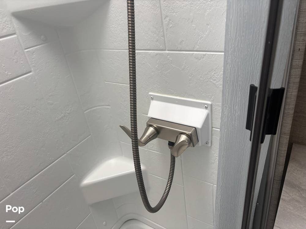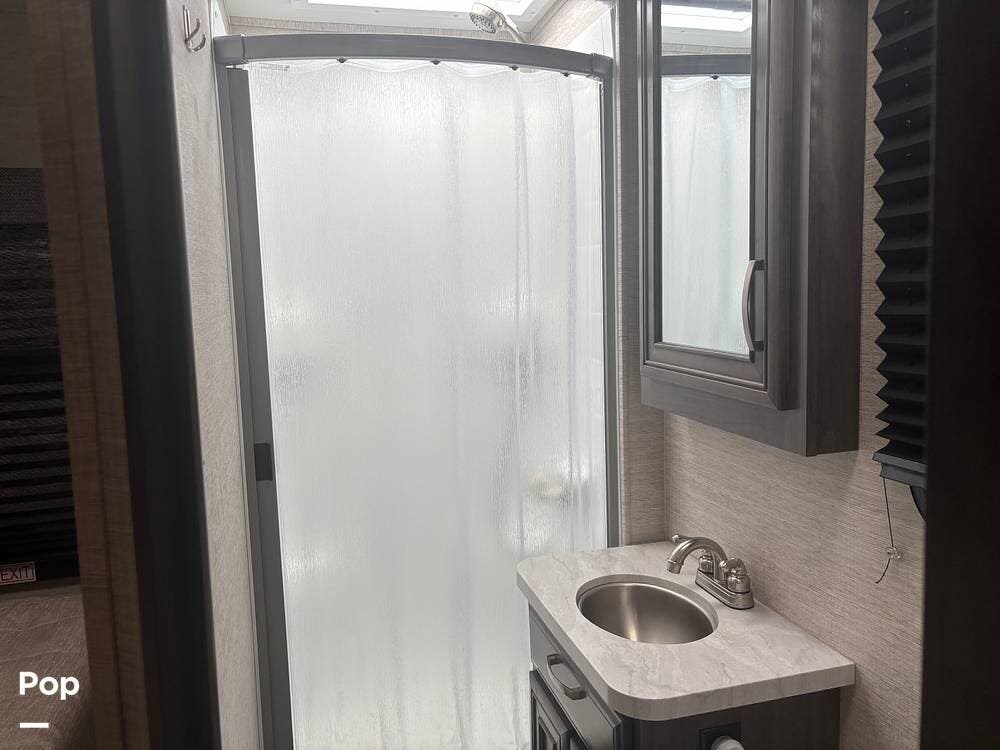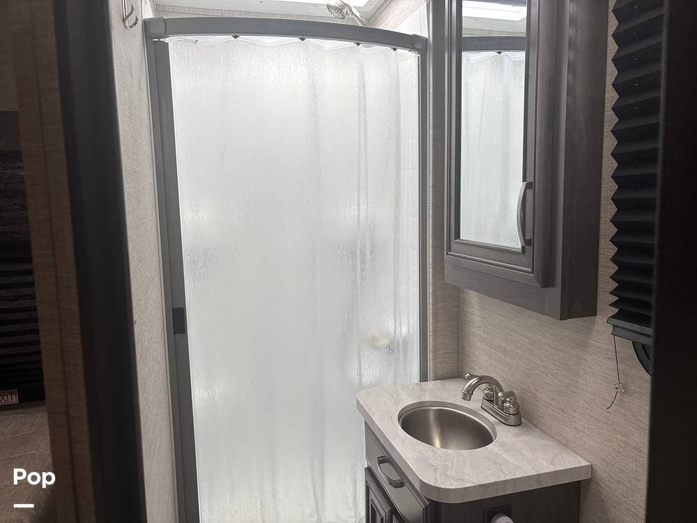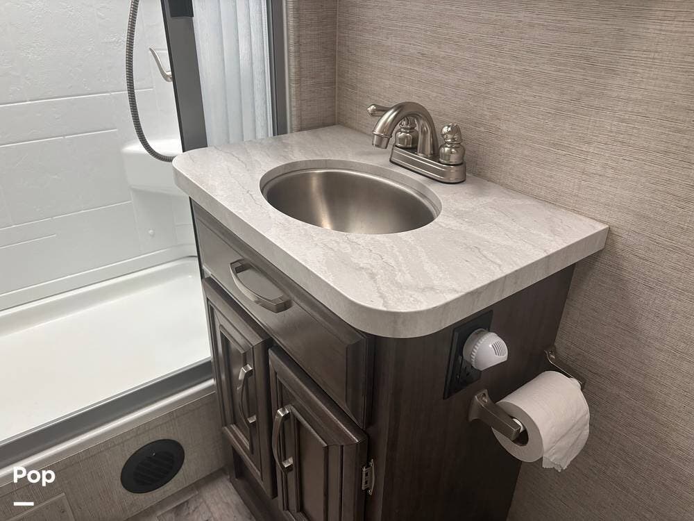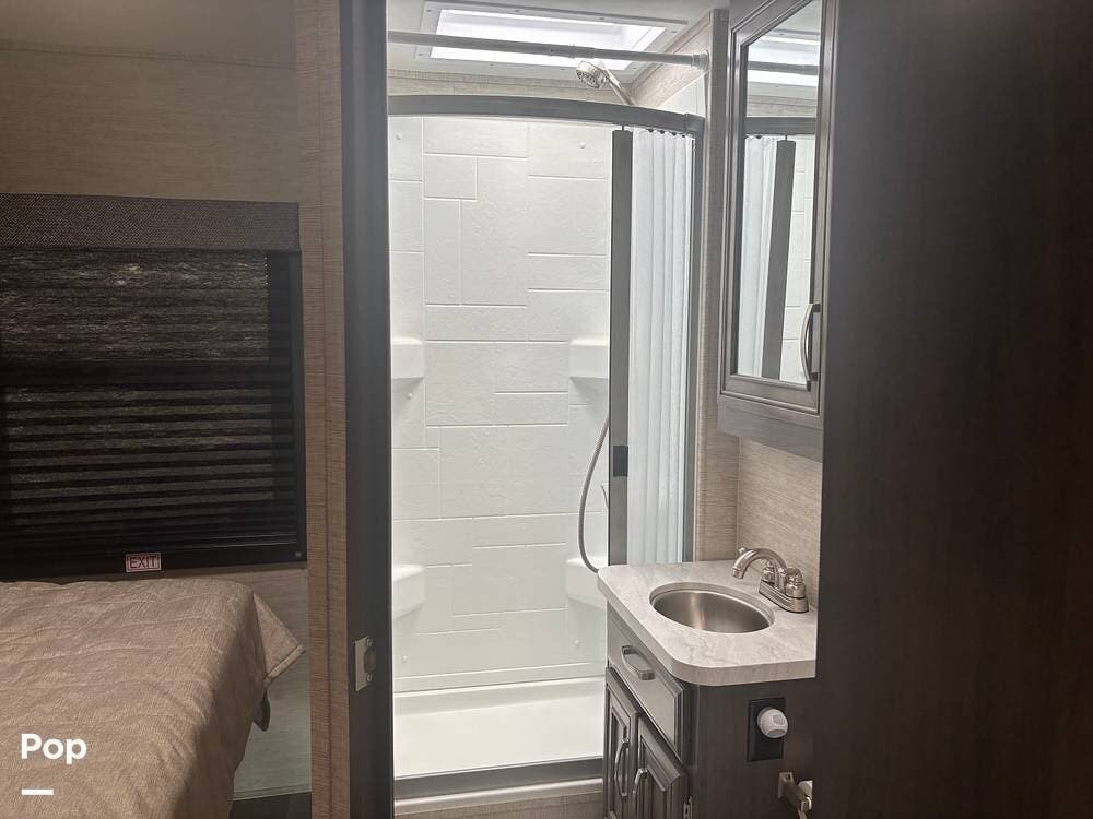 The bathroom provides a convenient shower, sink, and toilet, while the coach's holding tanks and fresh water capacity support extended camping.