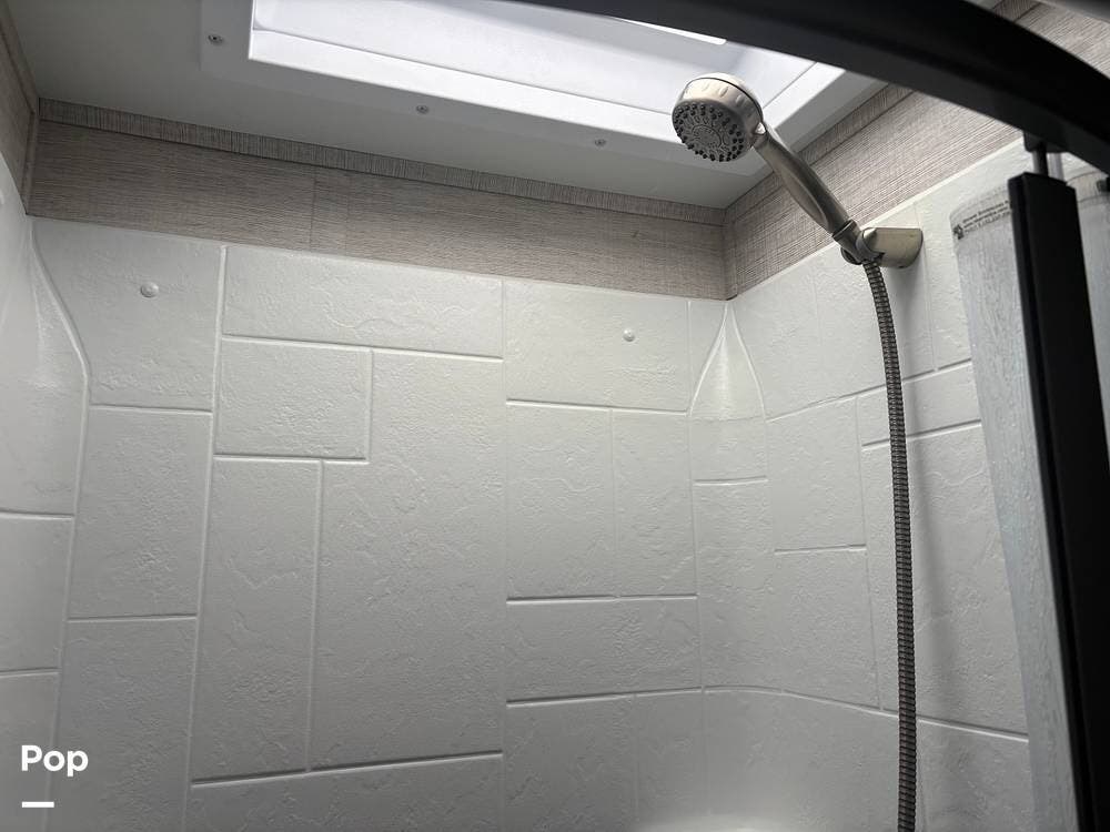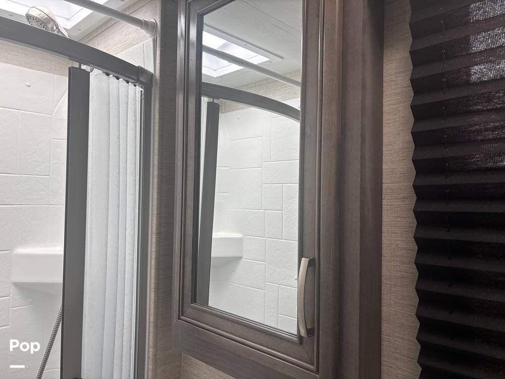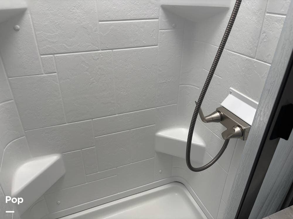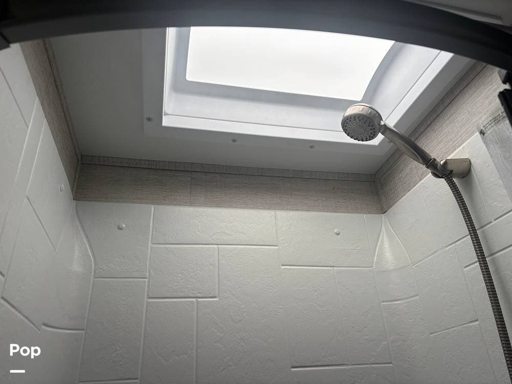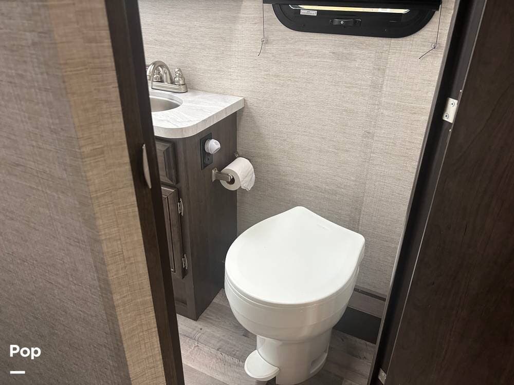 The bathroom provides a convenient shower, sink, and toilet, while the coach's holding tanks and fresh water capacity support extended camping.