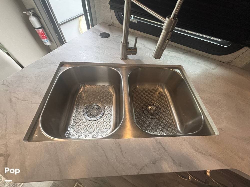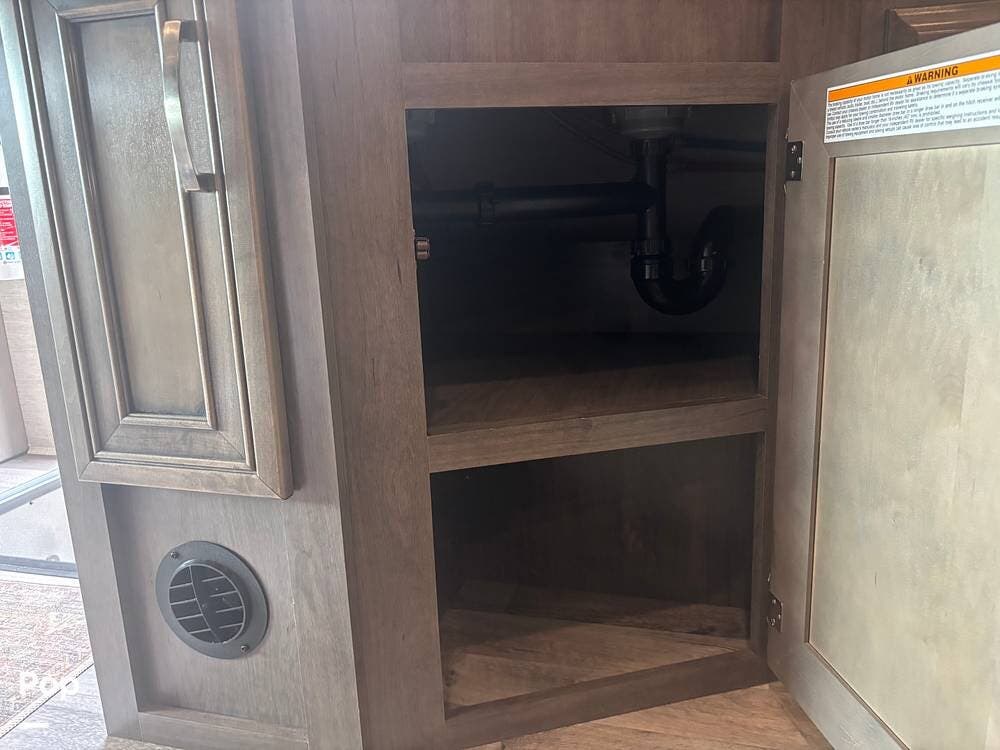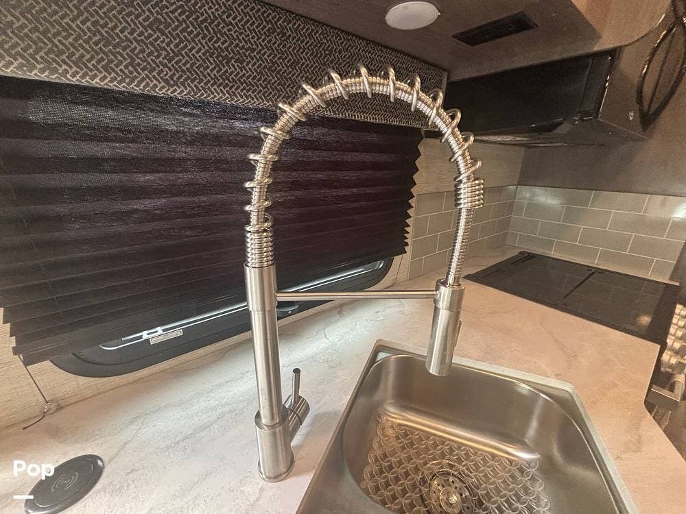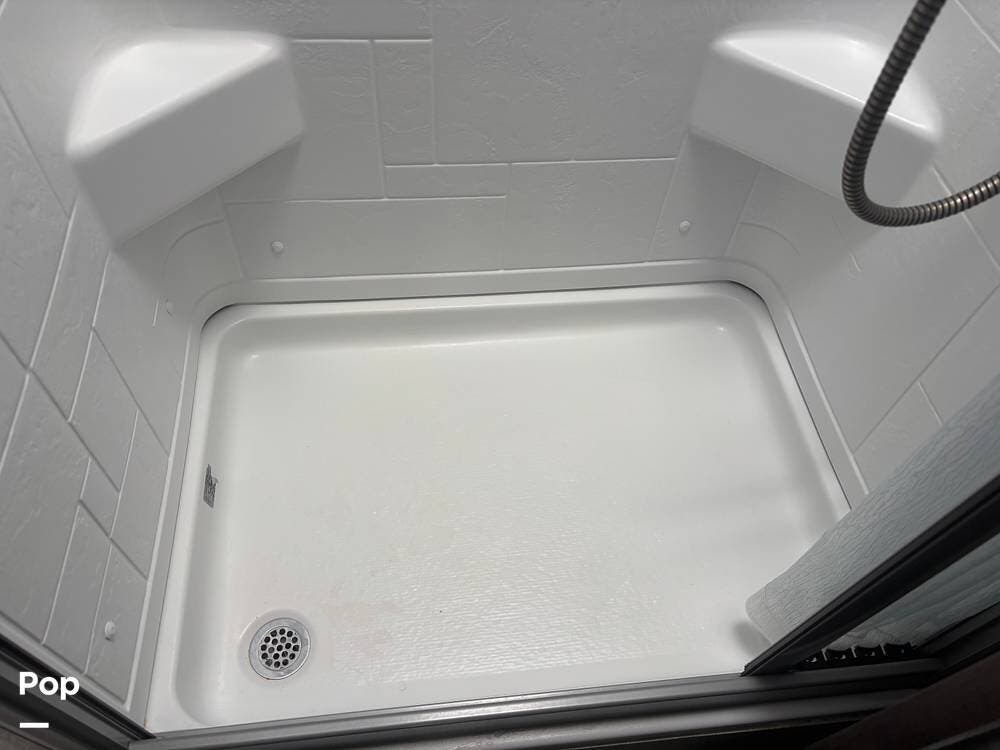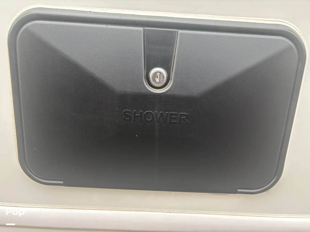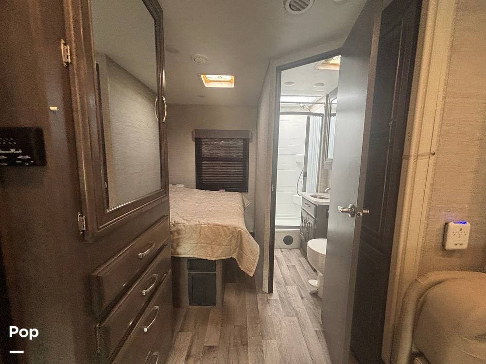 The bathroom provides a convenient shower, sink, and toilet, while the coach's holding tanks and fresh water capacity support extended camping.