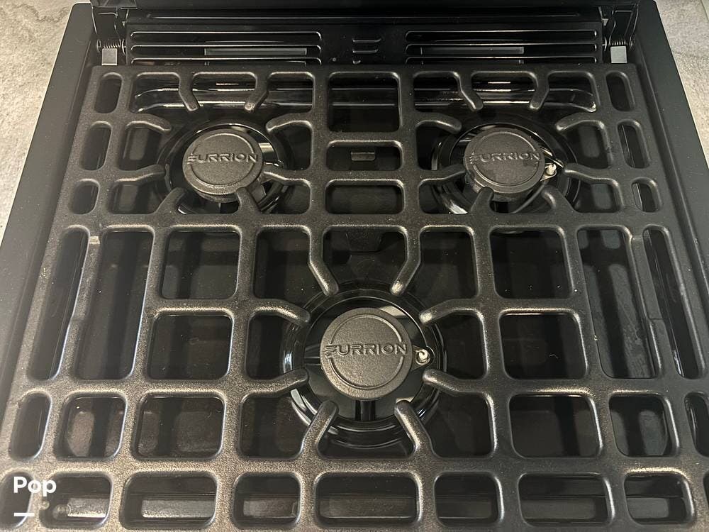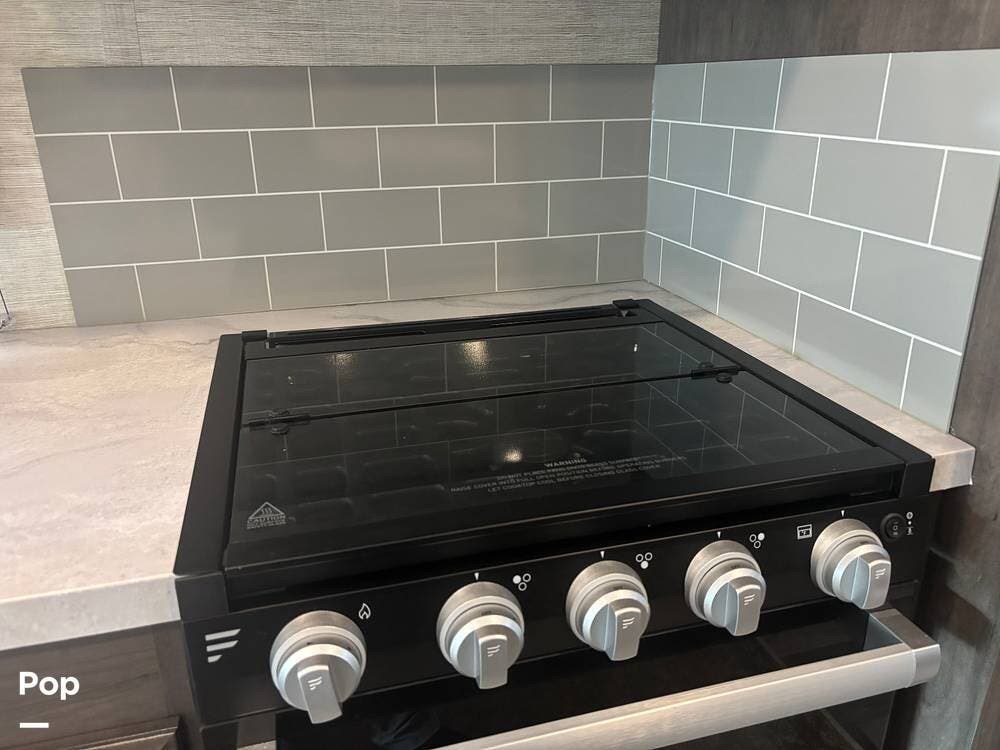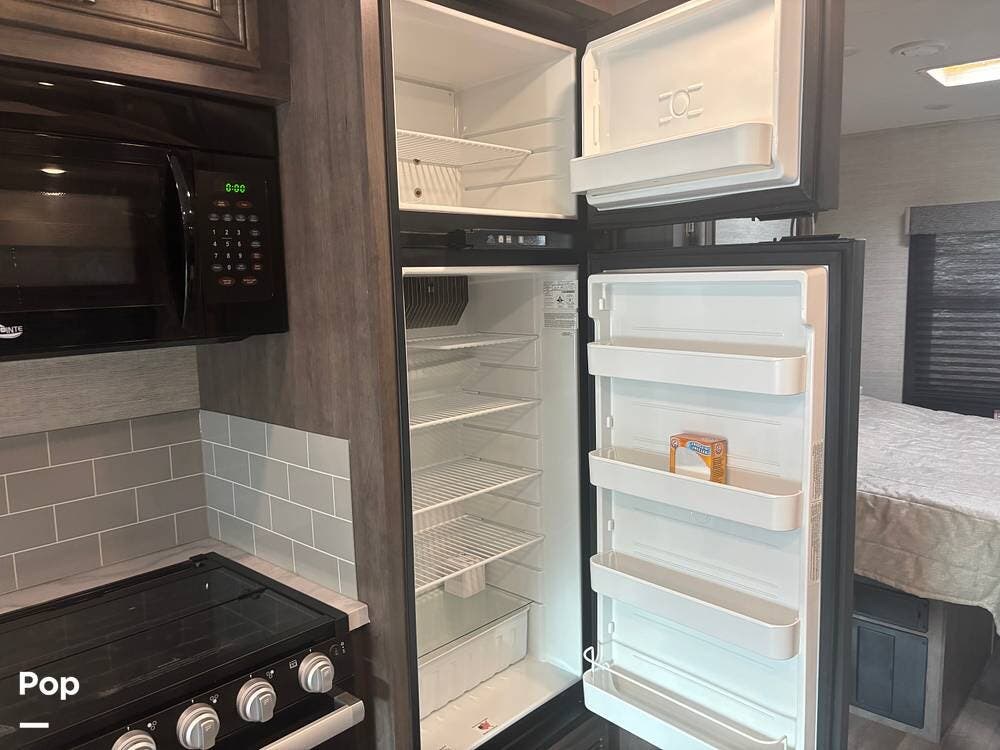 The kitchen is well-equipped with an 8-cubic-foot double-door refrigerator, a three-burner cooktop, a microwave, and ample cabinet storage. The living area includes a television and comfortable seating, creating a welcoming space to relax after a day of travel.
