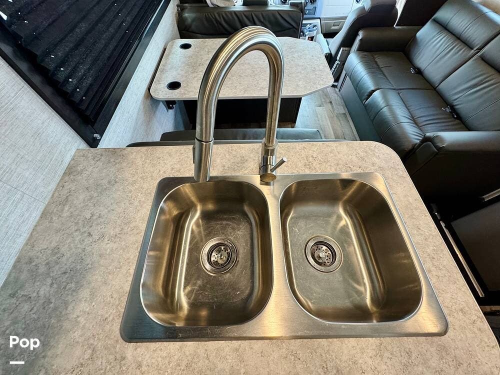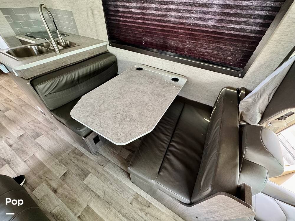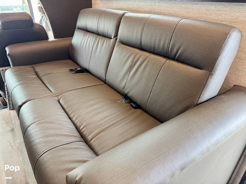 The kitchen is outfitted with a refrigerator, stove, microwave, and plenty of counter space for real cooking, making meals feel like home instead of a compromise. The dinette and sofa invite conversation and relaxation, and easily transform into additional sleeping areas when extra guests join the journey.