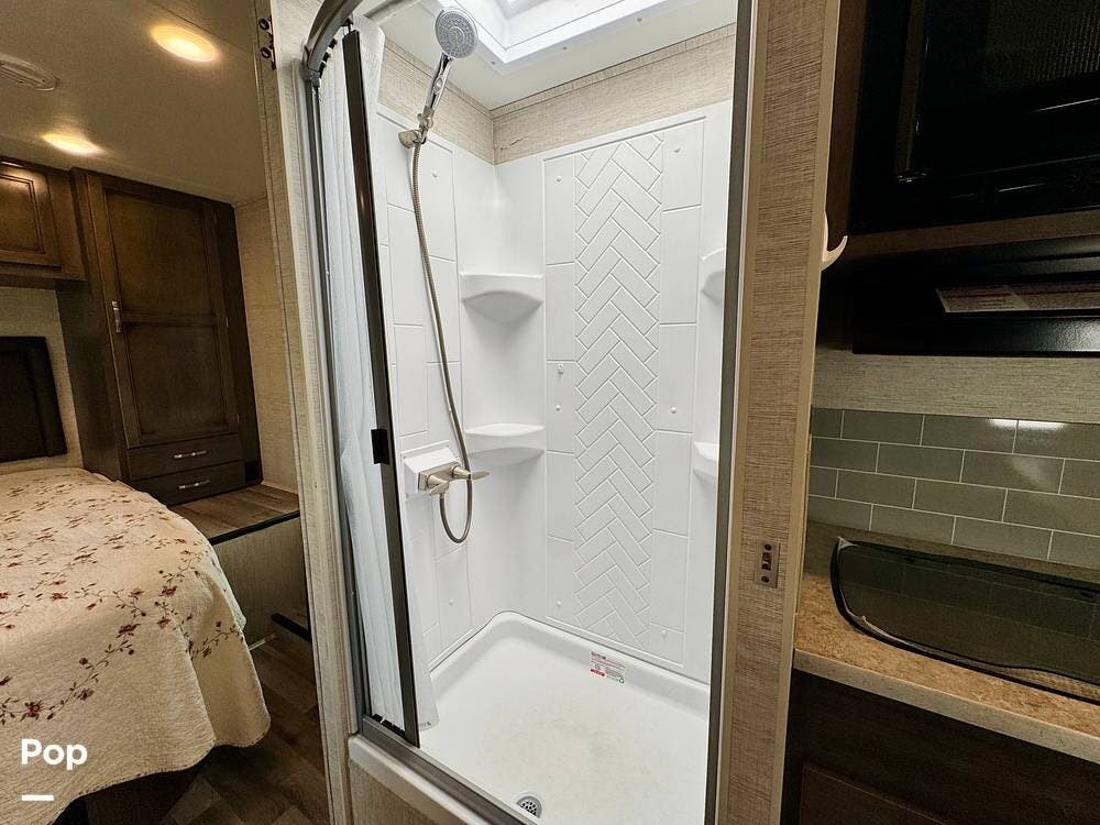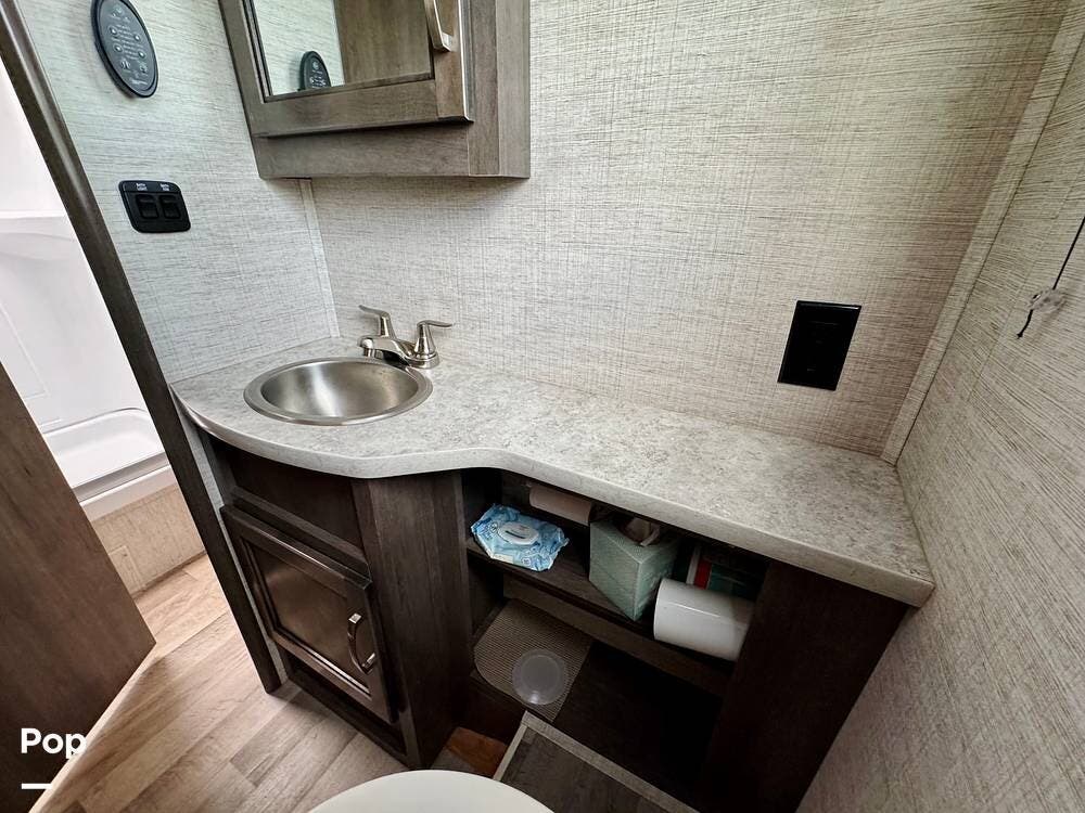 The bathroom delivers practicality and convenience with a full shower, toilet, and sink, creating a simple retreat after days spent exploring the outdoors.