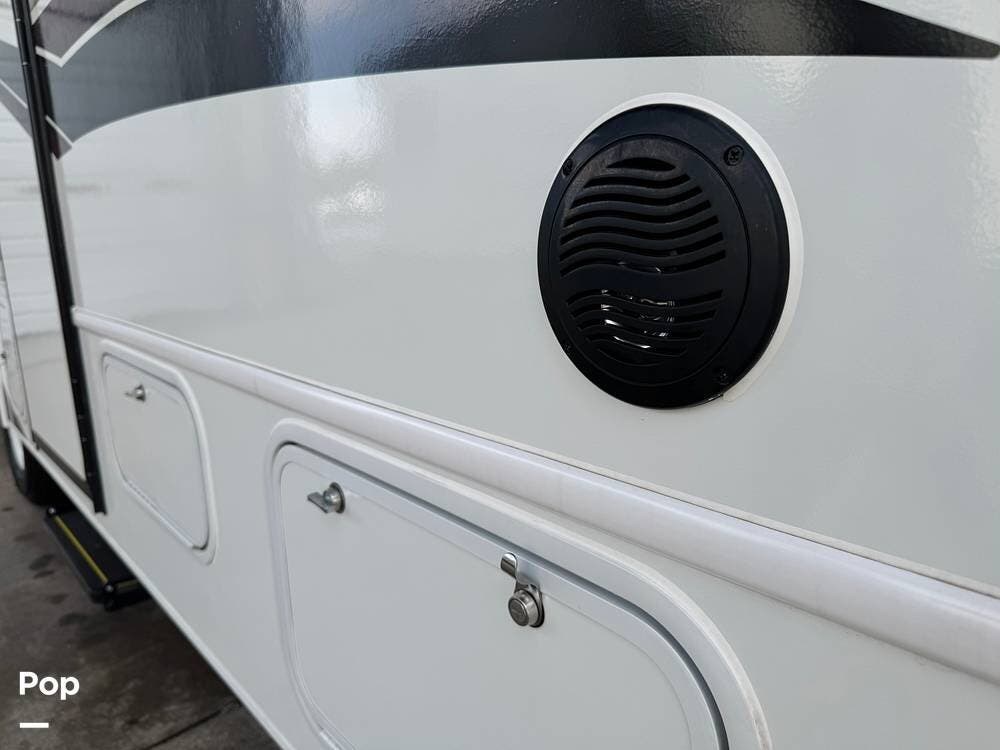 Its exterior presents a clean, modern silhouette built with Jayco's reputation for durability, offering smooth handling and confidence on every mile. Large windows flood the interior with daylight and frame the landscapes you pass, while the power awning and outdoor entertainment system make the transition from driving to unwinding easy.