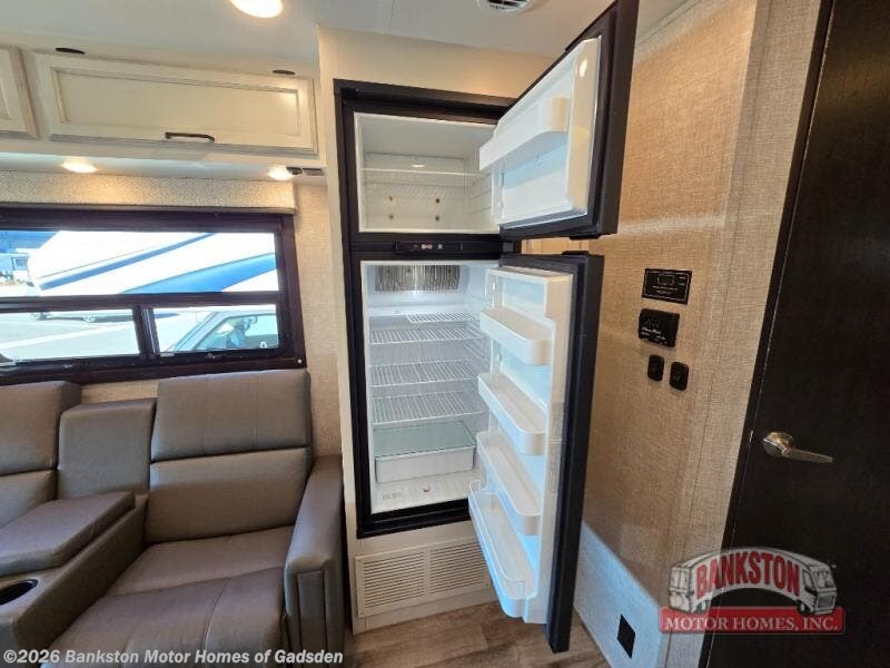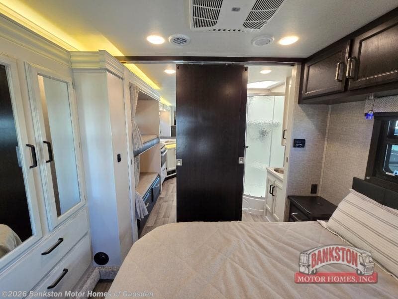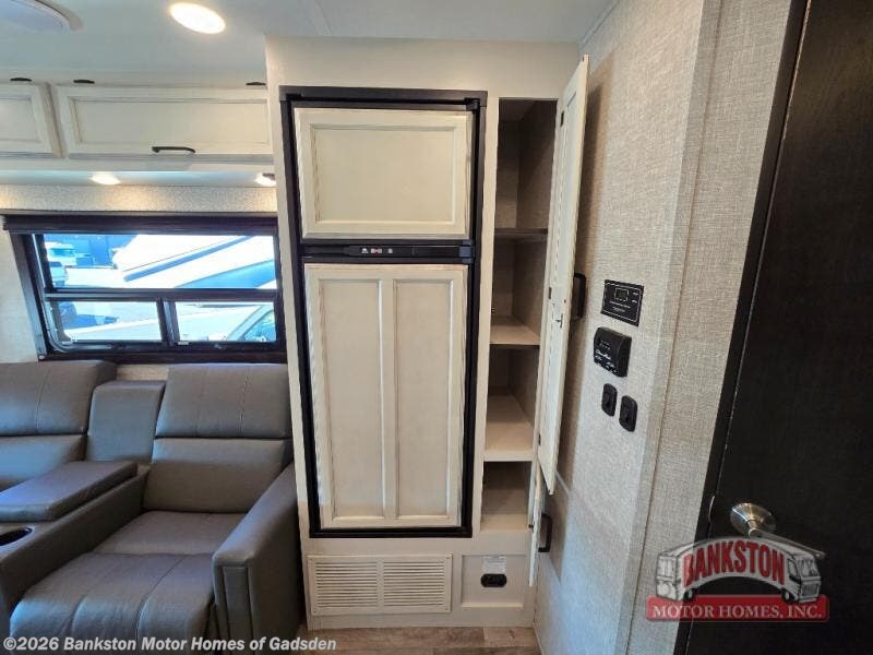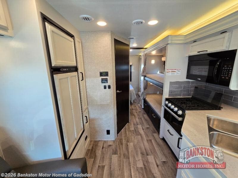 Searching for an RV to travel with family and friends? This coach offers up to seven sleeping spaces when you utilize the queen bed, the bunk beds, the cab over bunk and the furniture. The private master bedroom is in the rear and has access to the double entry bathroom, and the bunk beds are just across from the main entrance which is convenient. The kitchen provides a Furrion all-in-one cooktop and oven, a residential-size microwave and an 8 cu. ft. refrigerator, plus a pantry. You can dine at the Jayco exclusive, easy-operation legless dinette table or while sitting on the sofa. You might like to add the theater seating option in place of the sofa if you prefer that setup. And the cab seats swivel for more seating.
