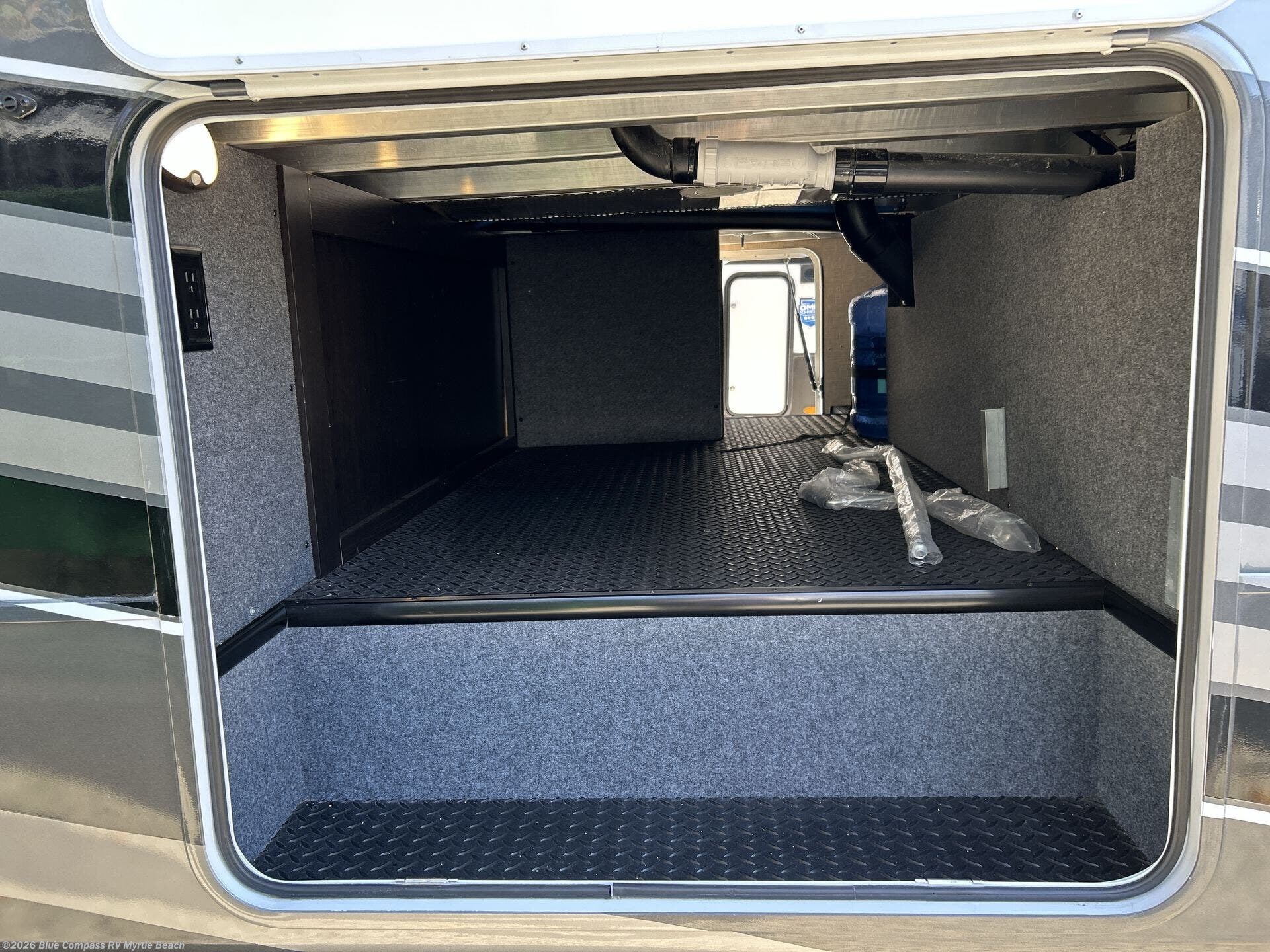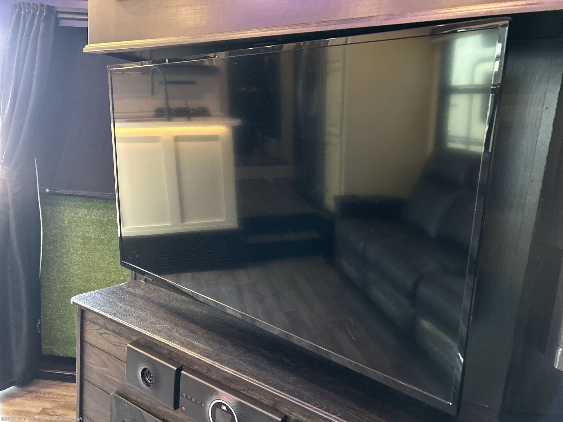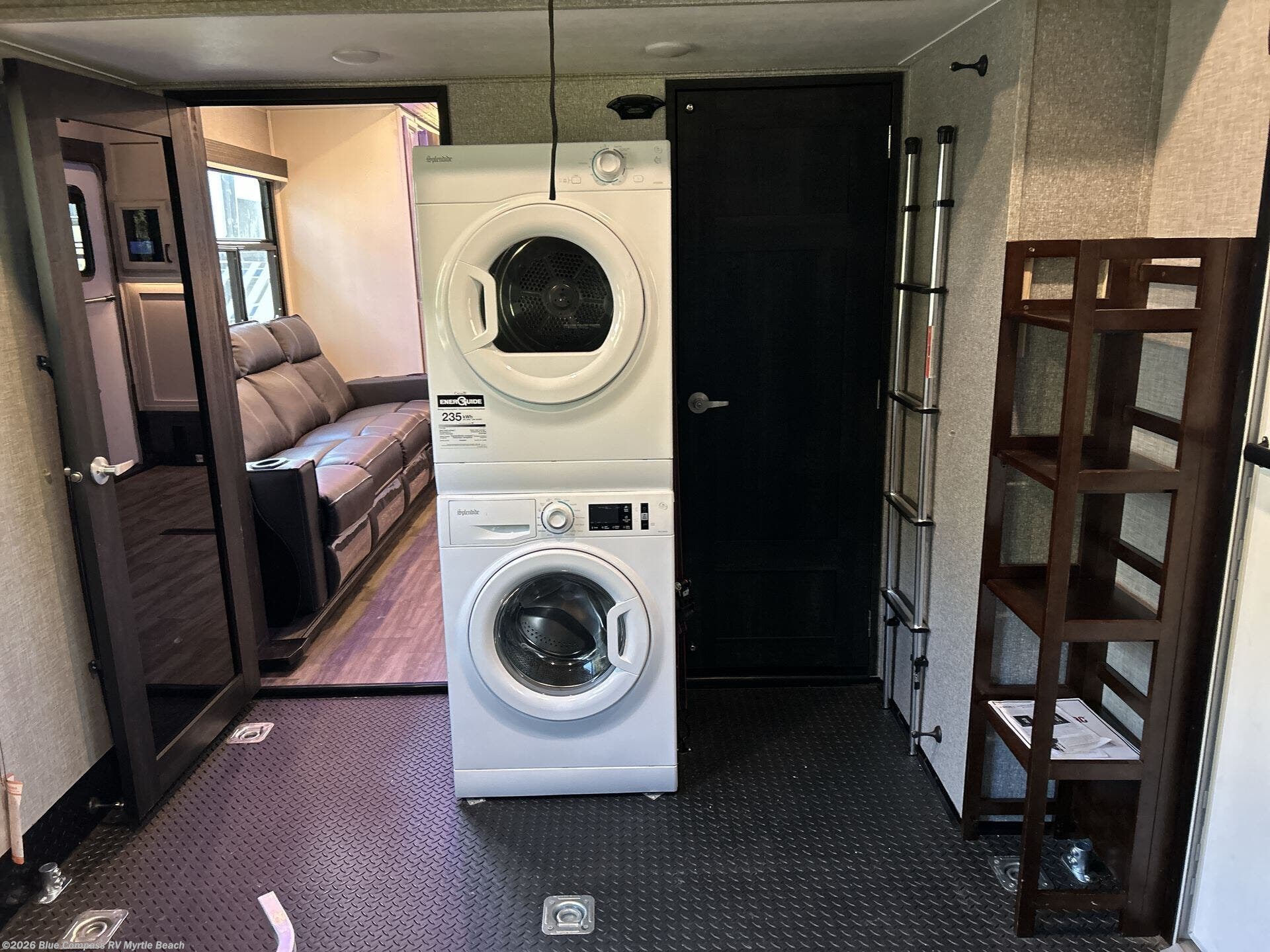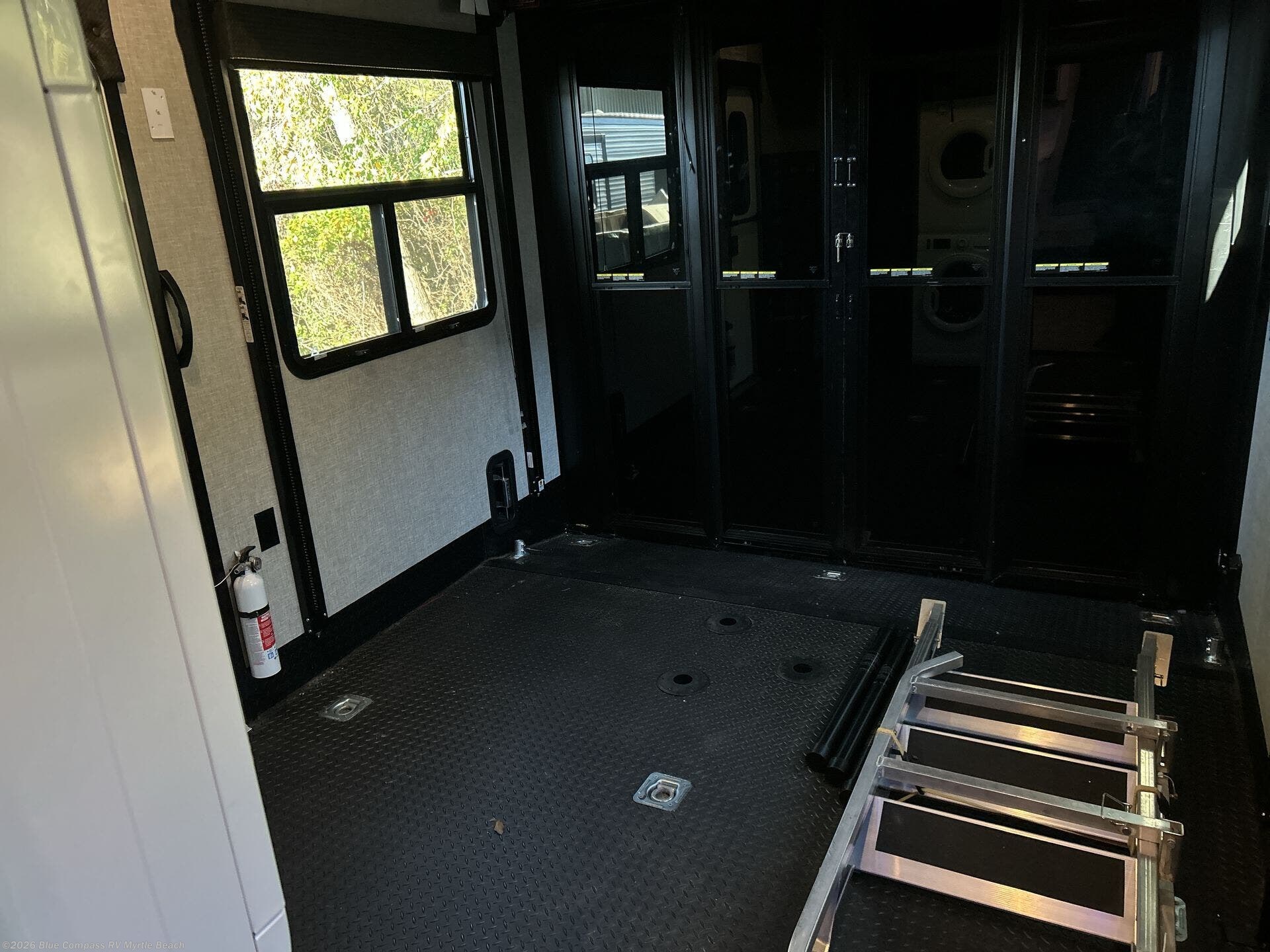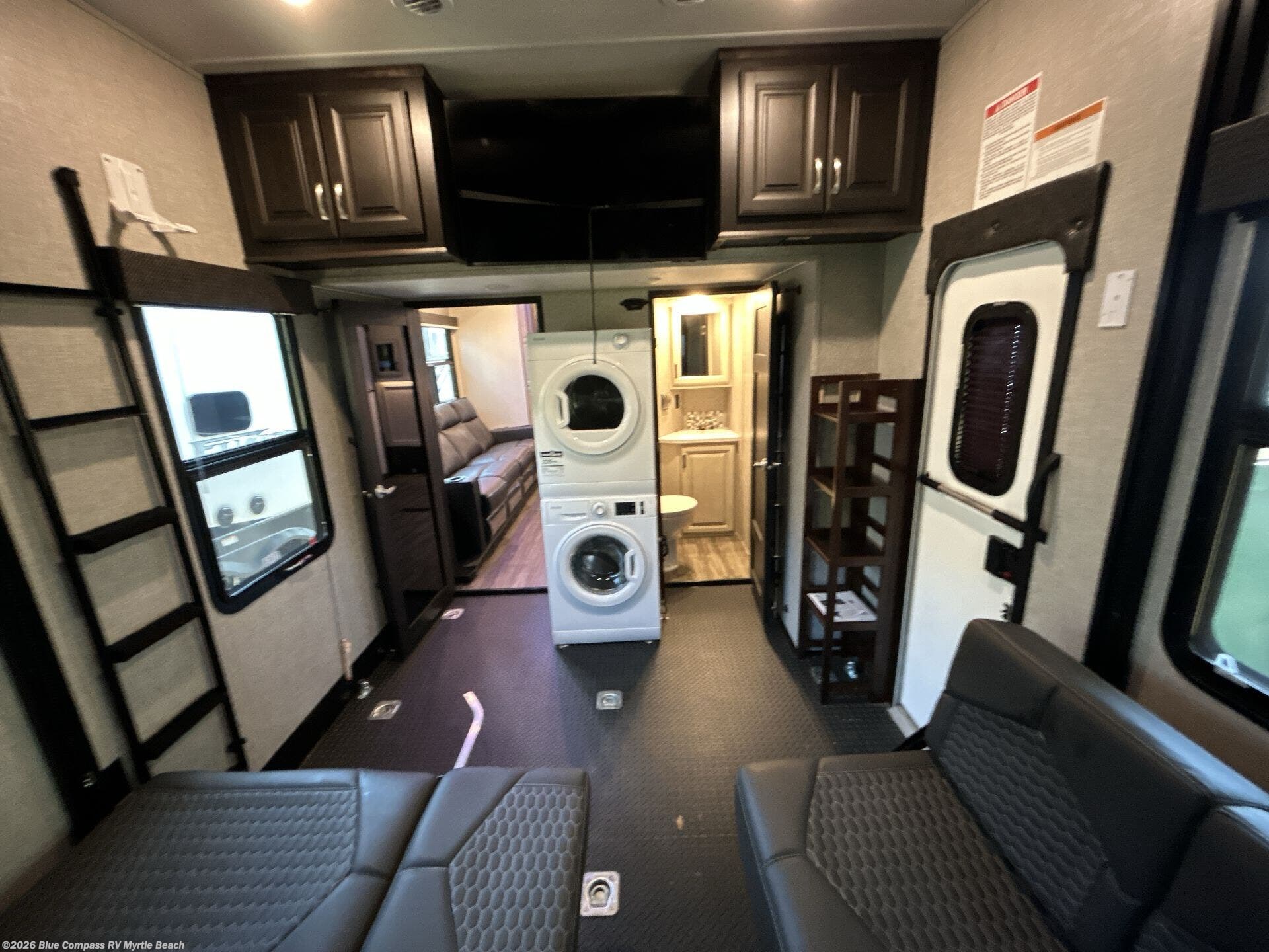 It's time to enjoy your toys and outdoor fun in this toy hauler! This separate garage offers an electric queen bed above rear convertible sofas, a second entry door, a half bath plus a place to add a washer/dryer option if you like. Your friends can have their own space when they join you. And the party deck will be a popular hangout everywhere you go! The separate living and kitchen area offers patio doors to get to the side patio party deck with an exterior TV so you can relax above ground while outdoors. Back inside you will have a SuperSofa with heat, massage, recliners, cupholders and LED lighting to enjoy while watching the Smart LED HDTV with a fireplace below. The chef will have a U-shaped countertop with all the kitchen amenities such as a 30" residential microwave, and the refrigerator is just a few steps away. Everyone can take turns getting cleaned up in the inventive side-aisle bath with a walk-in shower. The front master bedroom has a walk-around king bed for all-around comfort, plus a slide out with a dresser and two wardrobes that stretches into the hallway.