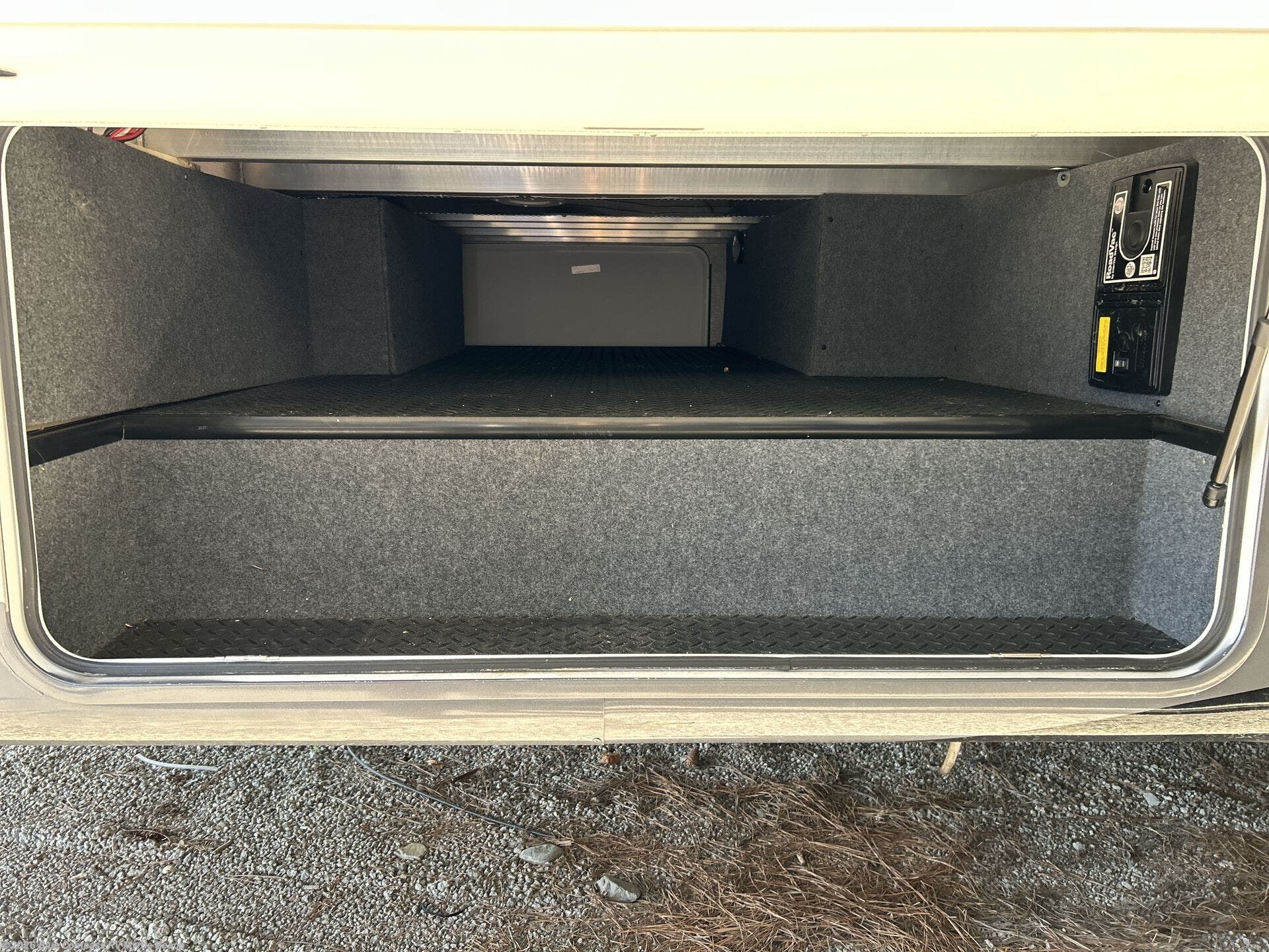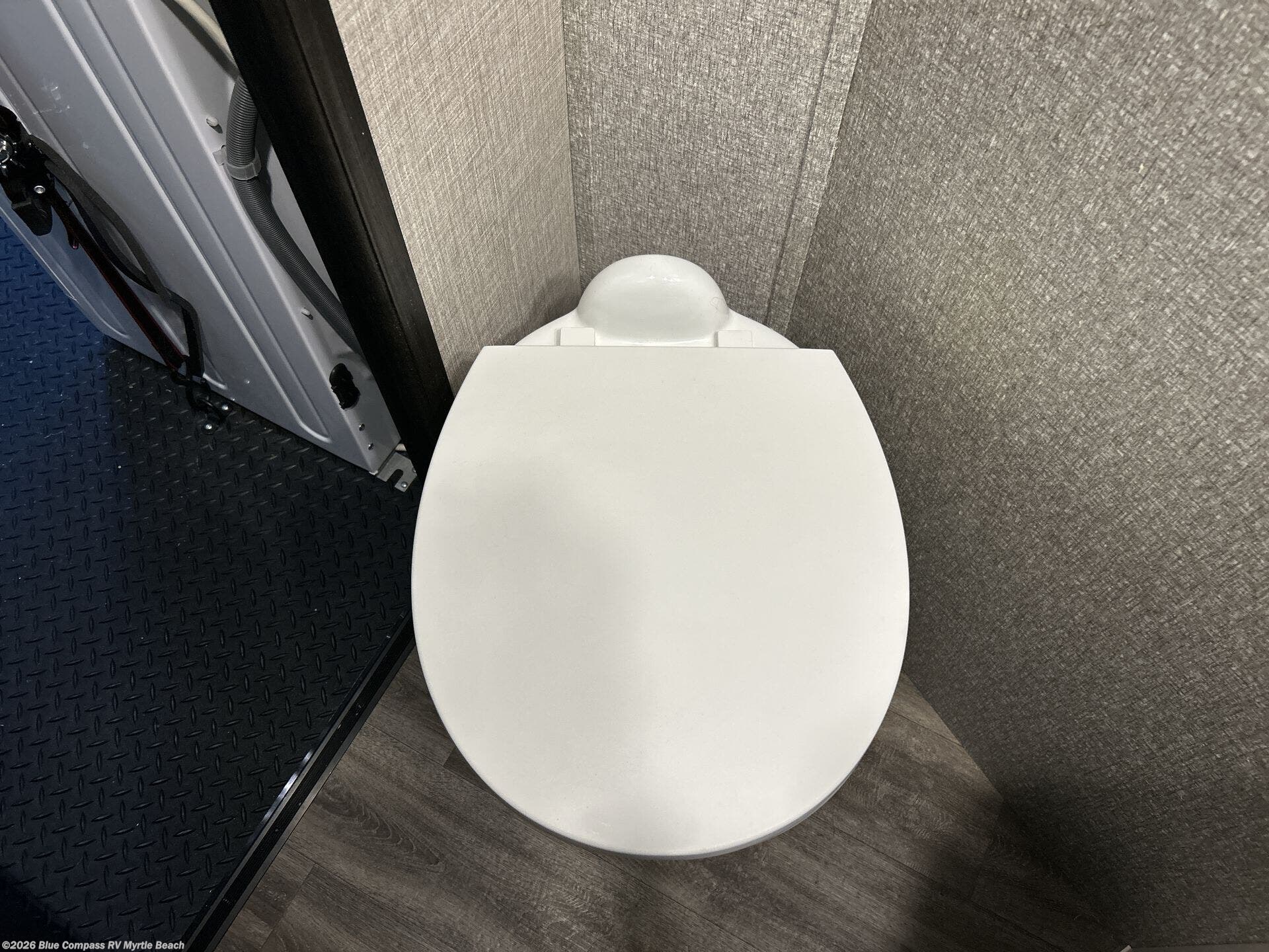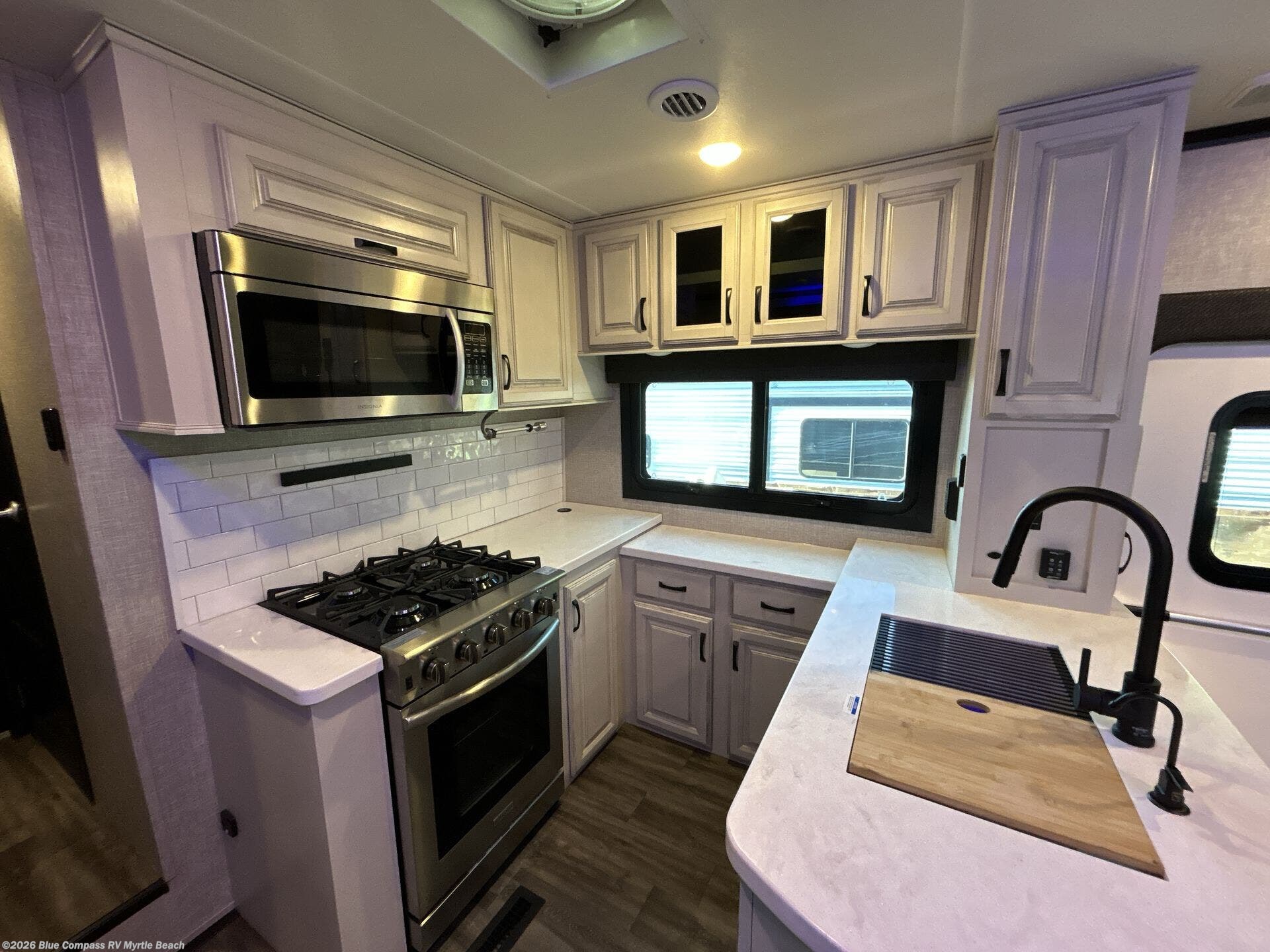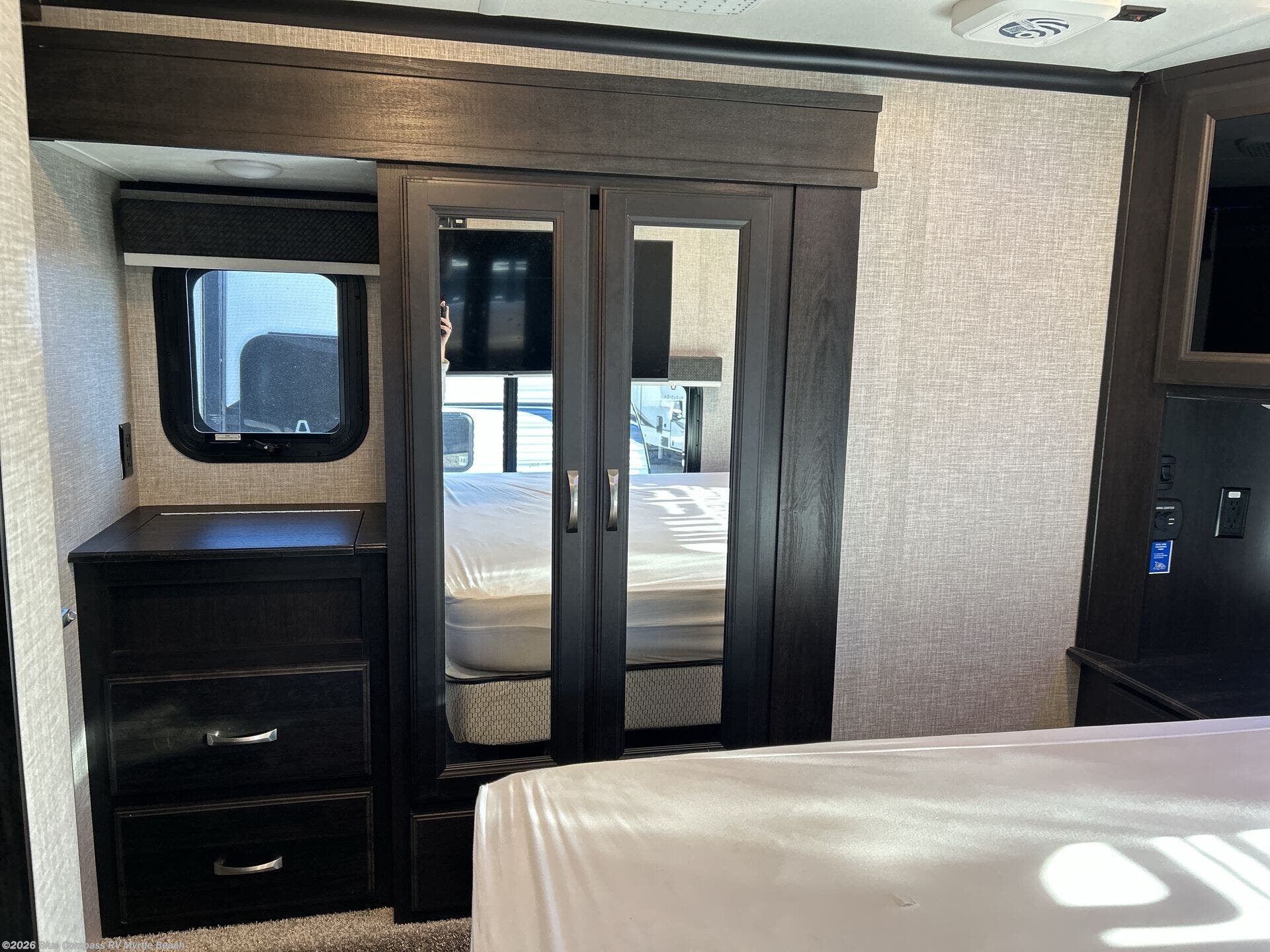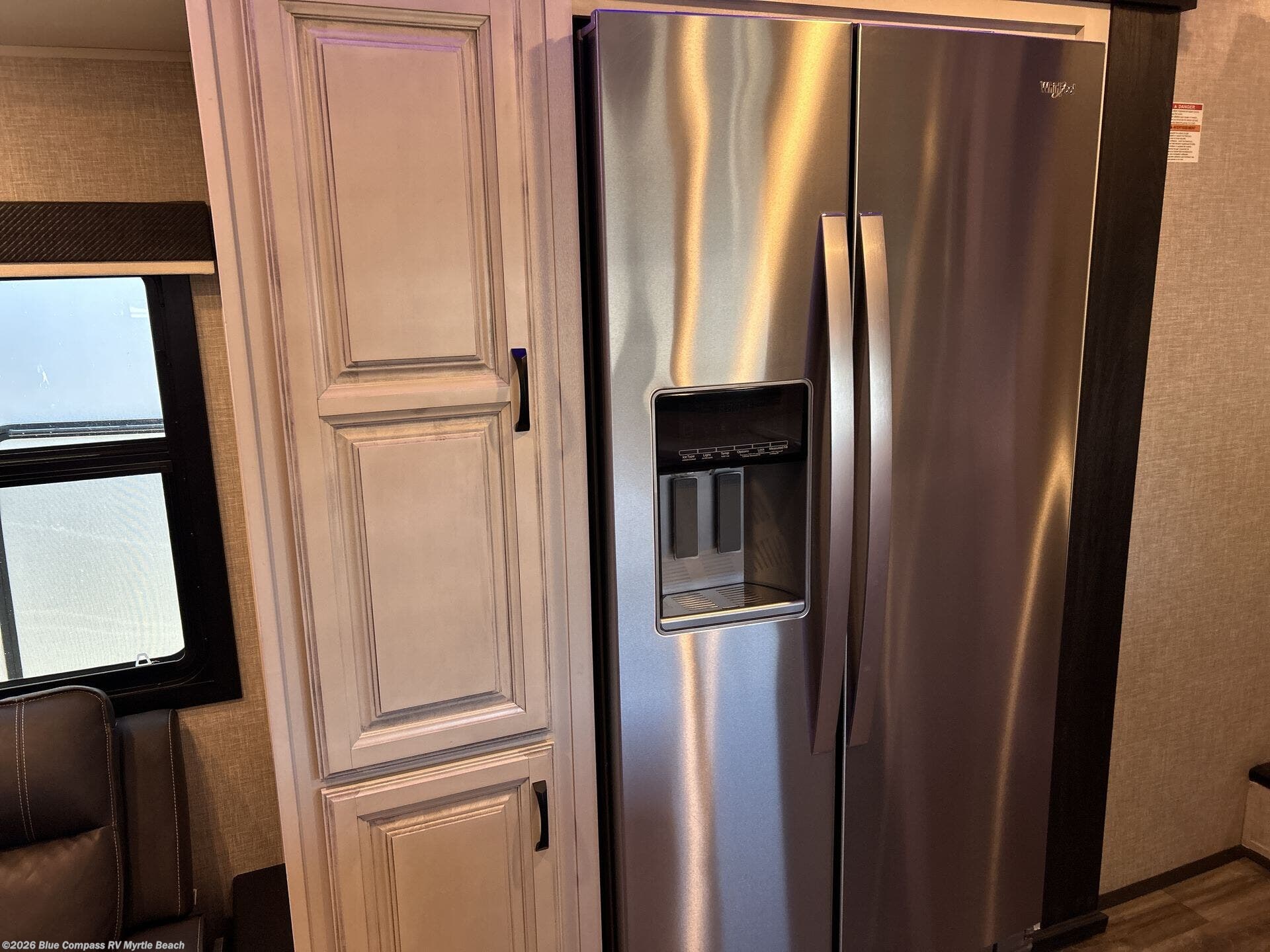 It's time to enjoy your toys and outdoor fun in this toy hauler! This separate garage offers an electric queen bed above rear convertible sofas, a second entry door, a half bath plus a place to add a washer/dryer option if you like. Your friends can have their own space when they join you. And the party deck will be a popular hangout everywhere you go! The separate living and kitchen area offers patio doors to get to the side patio party deck with an exterior TV so you can relax above ground while outdoors. Back inside you will have a SuperSofa with heat, massage, recliners, cupholders and LED lighting to enjoy while watching the Smart LED HDTV with a fireplace below. The chef will have a U-shaped countertop with all the kitchen amenities such as a 30" residential microwave, and the refrigerator is just a few steps away. Everyone can take turns getting cleaned up in the inventive side-aisle bath with a walk-in shower. The front master bedroom has a walk-around king bed for all-around comfort, plus a slide out with a dresser and two wardrobes that stretches into the hallway.