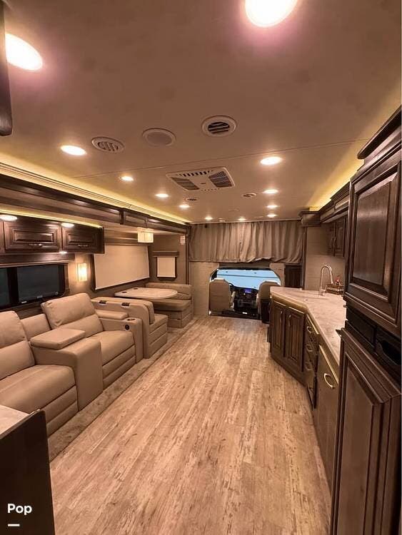 The living area is built for both relaxation and entertaining, with theater seating, a large dinette, and an impressive entertainment center.