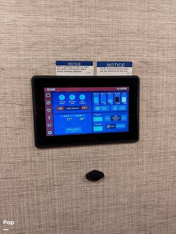 Inside, the modern, open-concept layout with three slide-outs creates a spacious, upscale living environment. You'll appreciate the premium furnishings, solid-surface countertops, hardwood cabinetry, and designer lighting throughout.