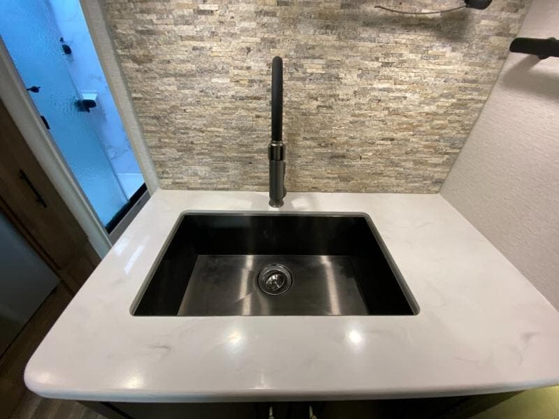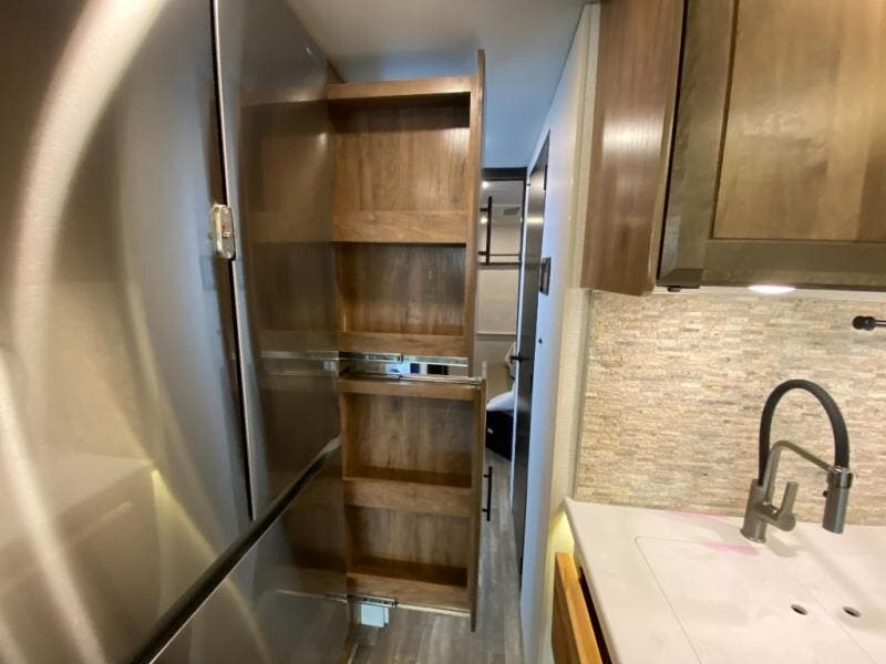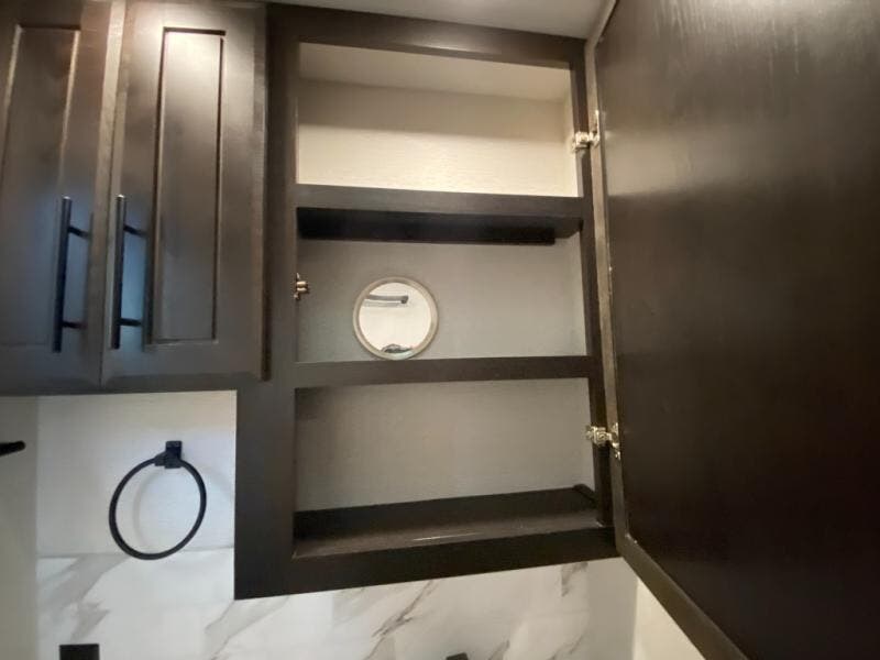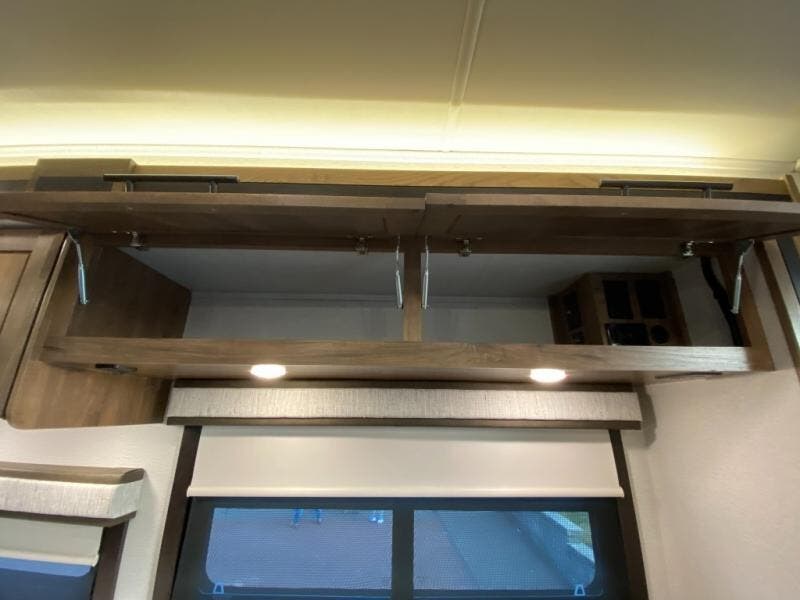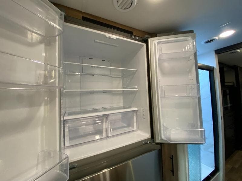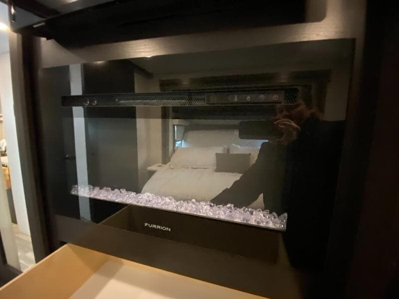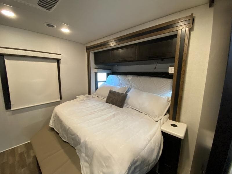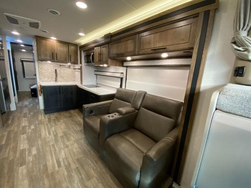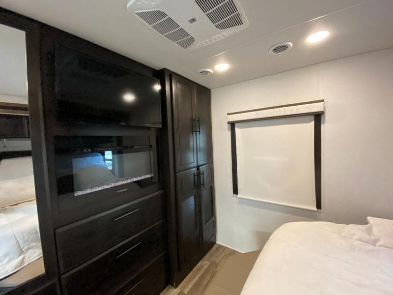 You will get a good night's rest each night in this motorhome! The rear private bedroom has a 72" x 80" king bed slide with power head lift across from a fireplace, a wardrobe, a TV cabinet, and an area prepped for an optional washer and dryer combo so you can have clean clothes throughout your entire trip. The separated bathroom makes it easy for one person to clean up in the 30" x 36" shower while another uses the private toilet and sink. Prepare your best home cooked meals with the two burner cooktop then enjoy them at the 38" x 70" booth dinette with a 50" TV lift above it. The cabover bunk provides a comfortable place to sleep and the 60" tri-fold sofa can also be a sleeping space too!
