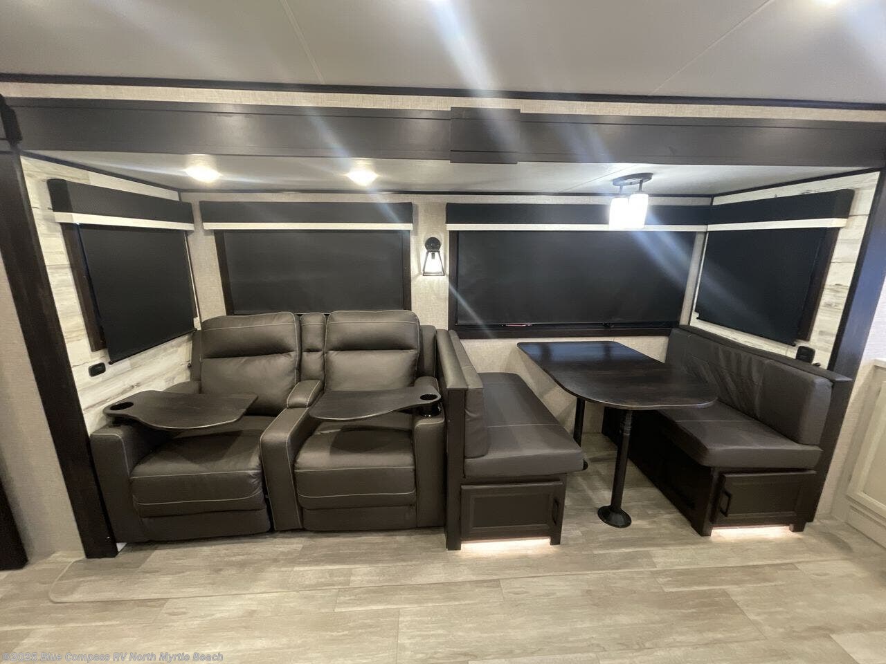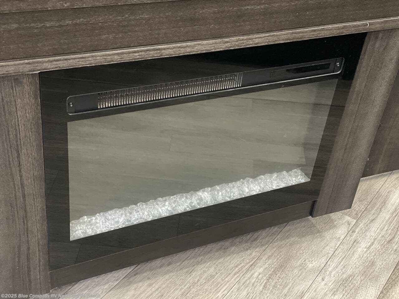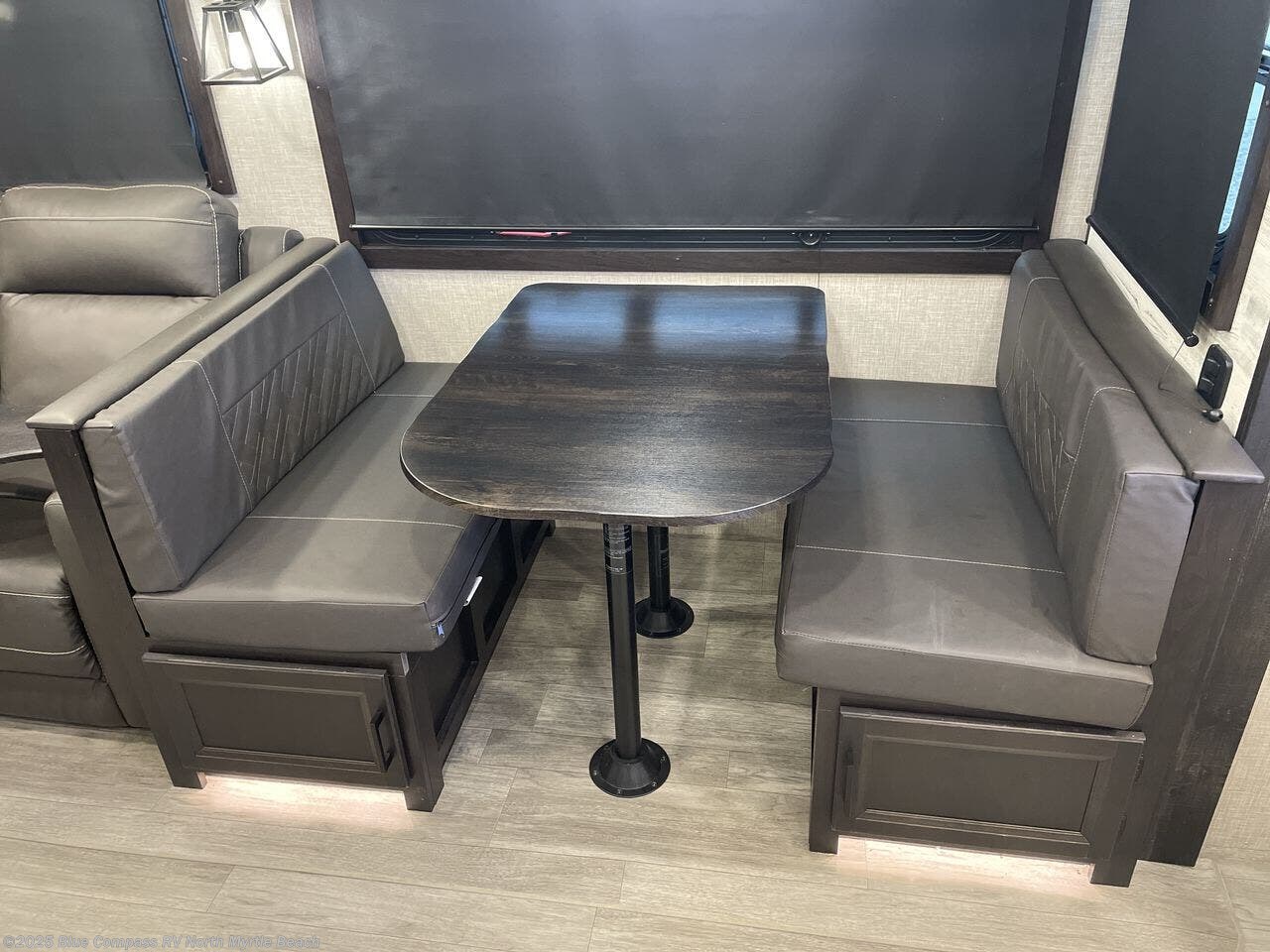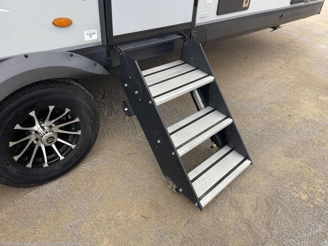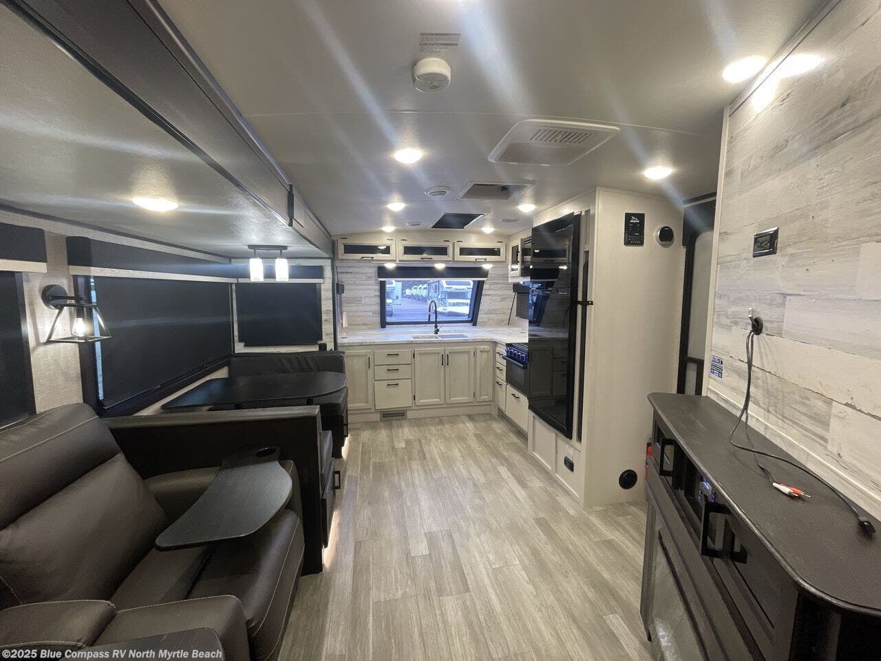 You will experience a smooth flow of traffic in and out of this travel trailer with dual entry doors! The rear private bedroom has one of the entrance/exit doors so you can sneak out for an early morning fishing trip, a queen bed slide for more space, and a wardrobe for your clothes. The full bathroom has a radius shower to clean up in and handy storage areas like a linen closet, a medicine cabinet, and a shelf. Grab a snack from one of the two pantries and head to the theater seating with swivel tables across from the entertainment center for a relaxing movie night. The chef will love cooking in the front kitchen with all of the countertop space and three burner cooktop. It comes standard with a booth dinette, but you can switch it out for the optional table and two chairs with ottoman or the optional table and four chairs.