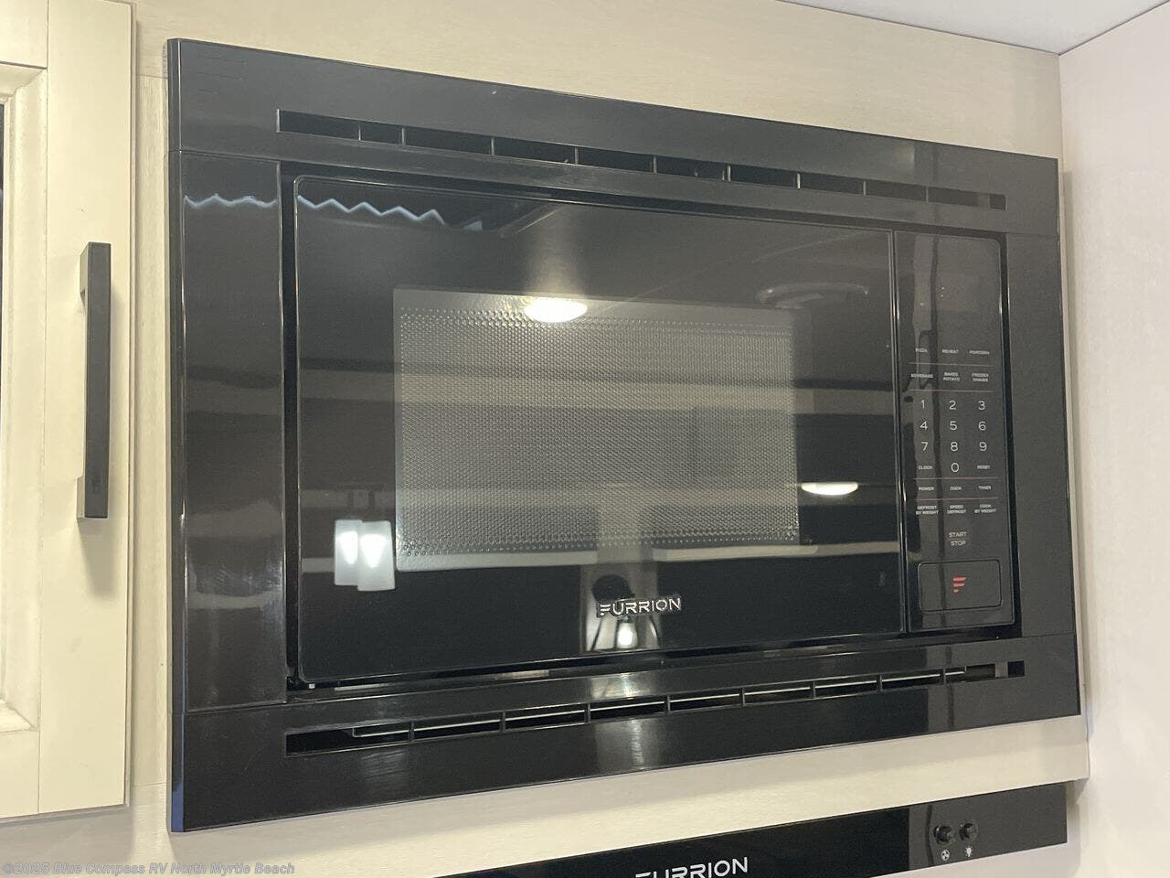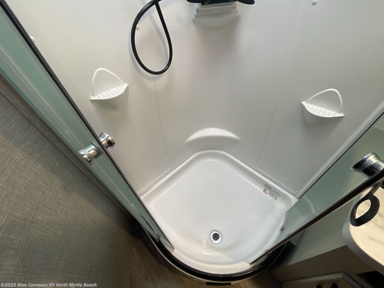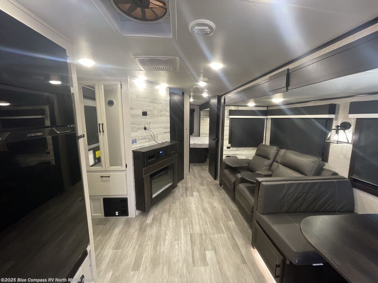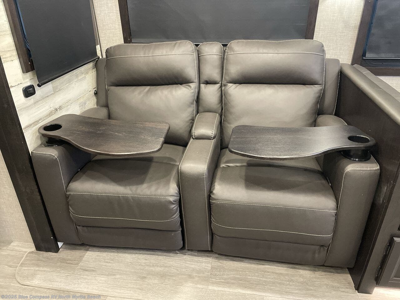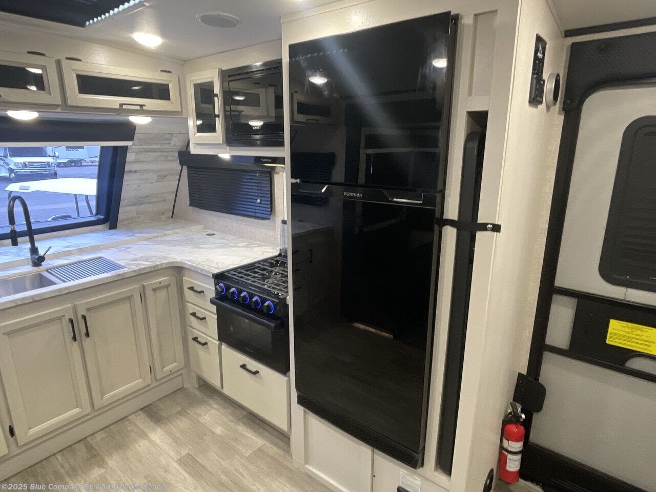 You will experience a smooth flow of traffic in and out of this travel trailer with dual entry doors! The rear private bedroom has one of the entrance/exit doors so you can sneak out for an early morning fishing trip, a queen bed slide for more space, and a wardrobe for your clothes. The full bathroom has a radius shower to clean up in and handy storage areas like a linen closet, a medicine cabinet, and a shelf. Grab a snack from one of the two pantries and head to the theater seating with swivel tables across from the entertainment center for a relaxing movie night. The chef will love cooking in the front kitchen with all of the countertop space and three burner cooktop. It comes standard with a booth dinette, but you can switch it out for the optional table and two chairs with ottoman or the optional table and four chairs.