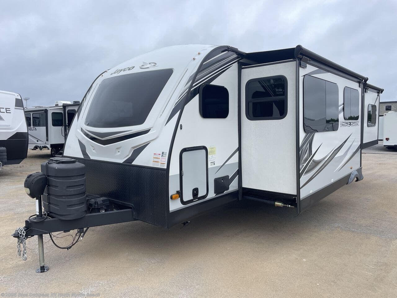 The lightweight White Hawk travel trailers by Jayco will blow you away with their roomy interiors, luxurious amenities, and durable construction. The Magnum Truss Roof System can withstand 50% more weight than the competition, and the Stronghold VBL lamination is the lightest, yet strongest in the industry. Each model includes the JAYCOMMAND "Smart RV" system with a tire pressure monitor system, plus American-made Goodyear tires for maximum durability and carrying capacity. You will love the sleek look of the front molded fiberglass cap with an automotive windshield and blue LED accent lighting, along with the frameless windows and automotive-style aluminum rims. The White Hawk travel trailers also include an arched interior ceiling, a kitchen skylight with a shade, residential vinyl flooring with cold crack resistance, and an electric fireplace.