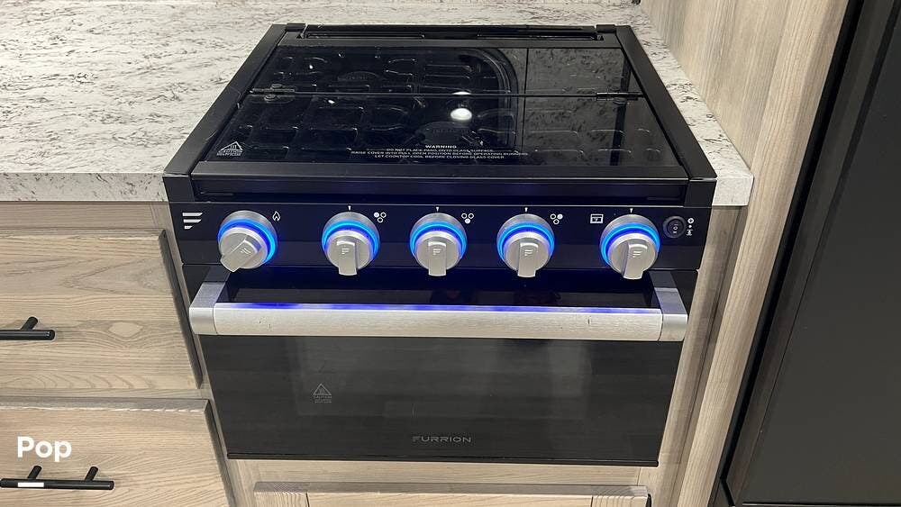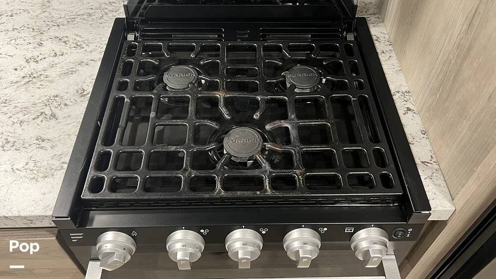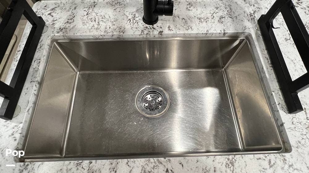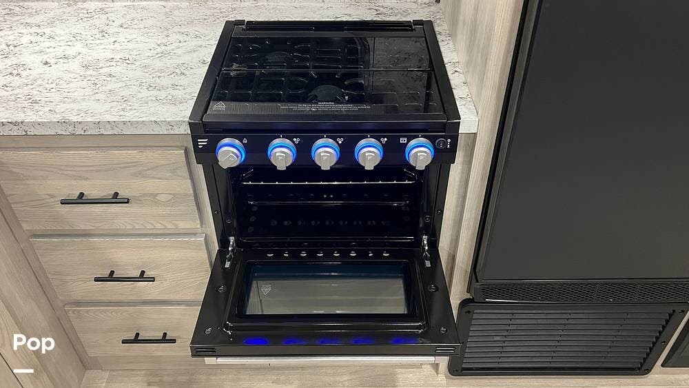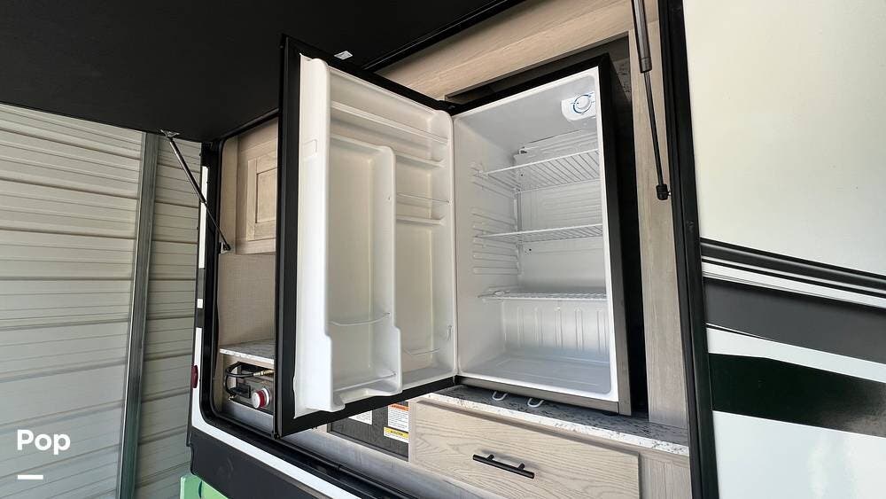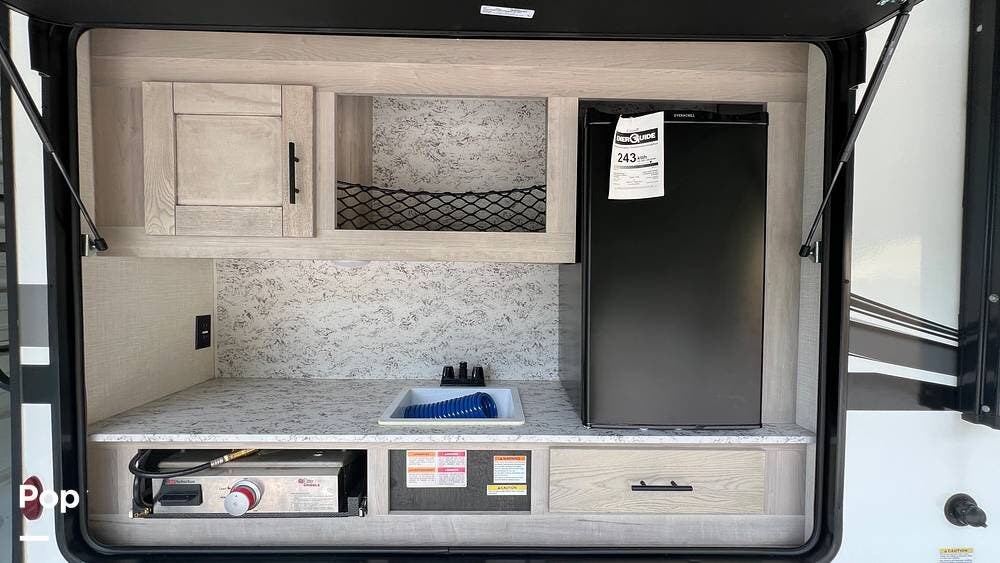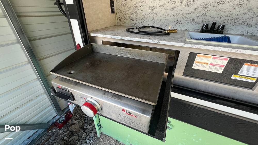 Outside, the large power patio awning allows you to take the fun outdoors when at the campsite or use this camper for tailgating at your favorite team's events. The exterior kitchen features a large refrigerator, sink, and griddle for cooking outdoors.