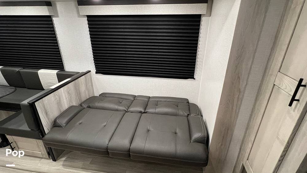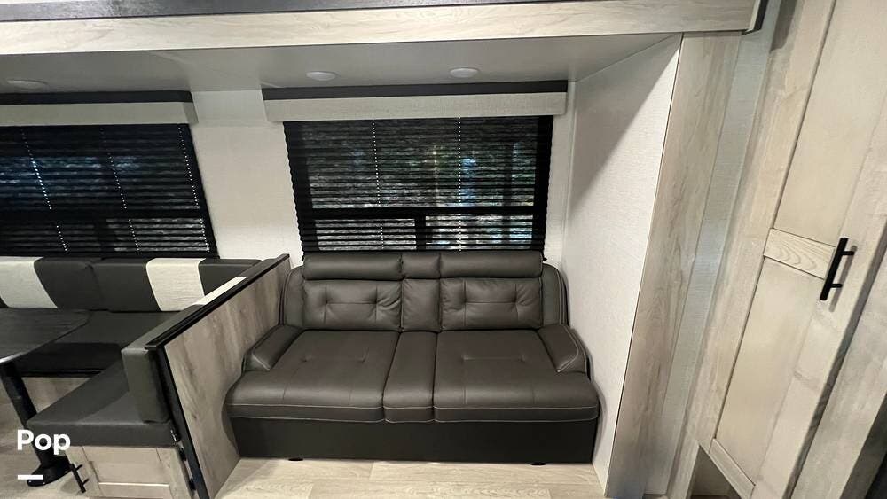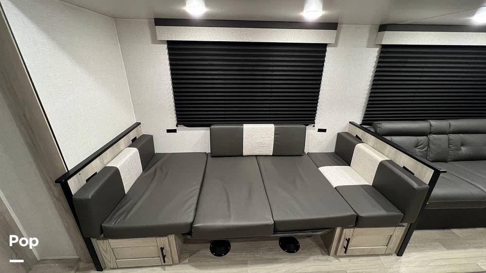 The front bedroom is private and has a queen-size pedestal bed with storage below, overhead, and on both sides, so plenty of storage space is available. The jack-knife sofa and large U-shaped dinette can both be quickly converted into additional sleeping areas if needed.