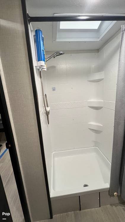 The bathroom has a second exterior entrance and features a step-in shower with a skylight overhead, a toilet, and a sink.