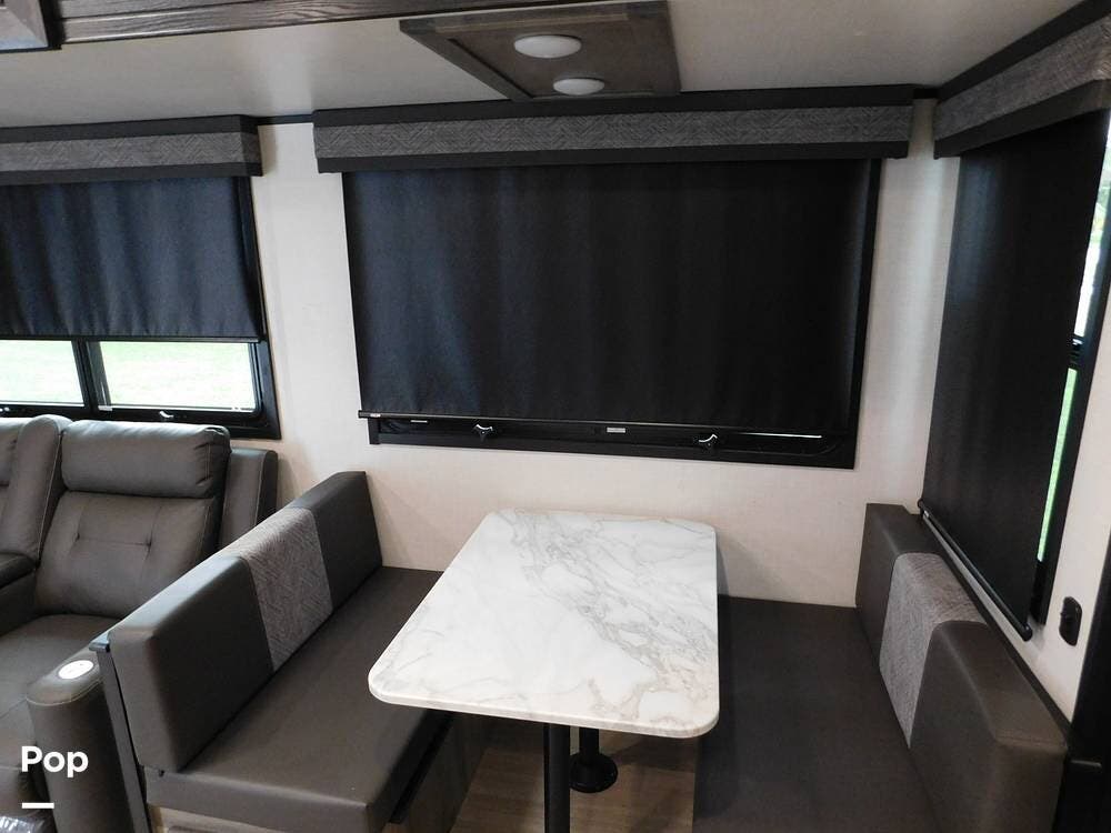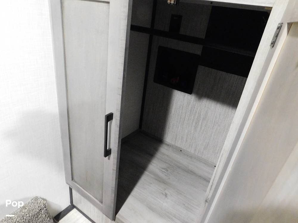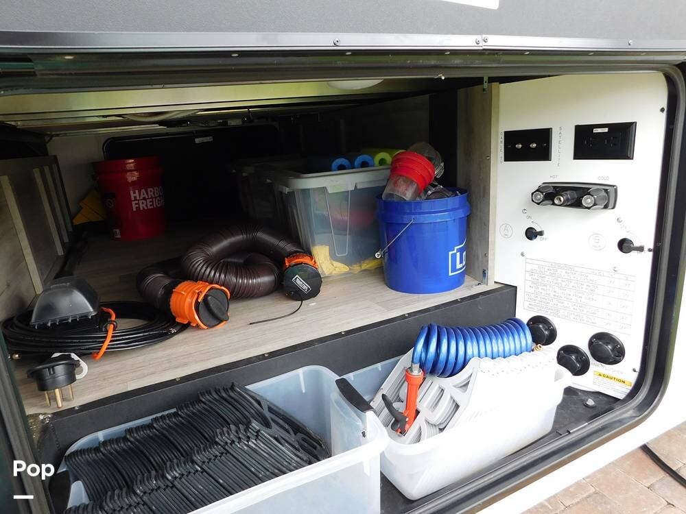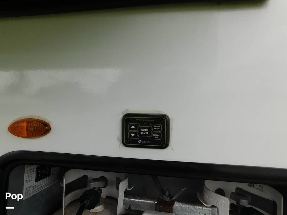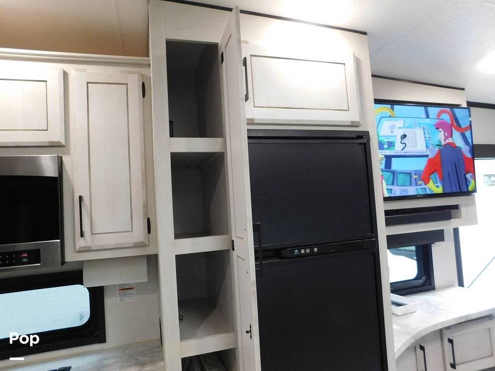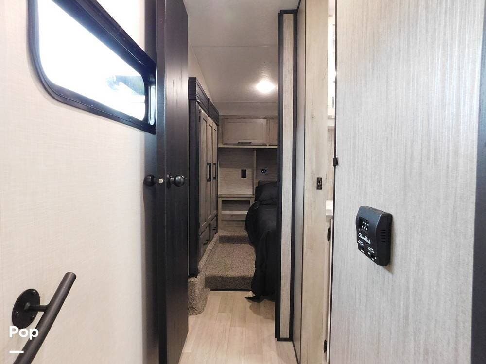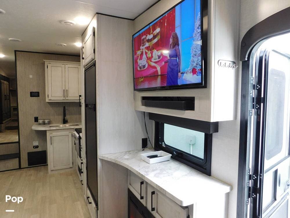 This trailer is equipped with modern amenities and features to enhance your outdoor adventures, including two slides, two awnings, and a portable outside TV with control systems featuring a Lippert control panel with cell phone capability.