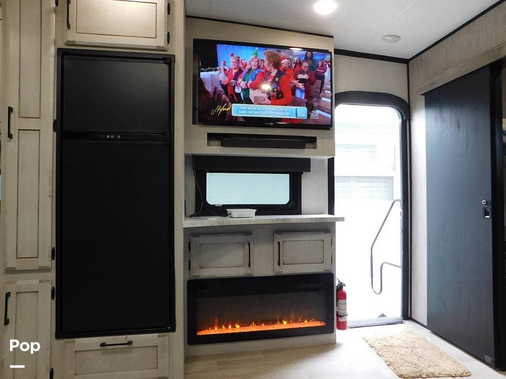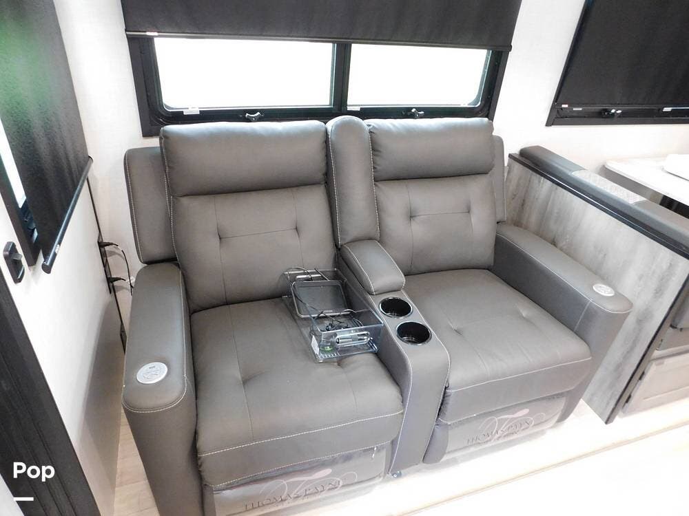 There is a loveseat with two powered recliners to enjoy the TV and fireplace from. There is a bath and a half as well - front and rear for your convenience.