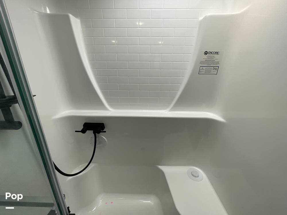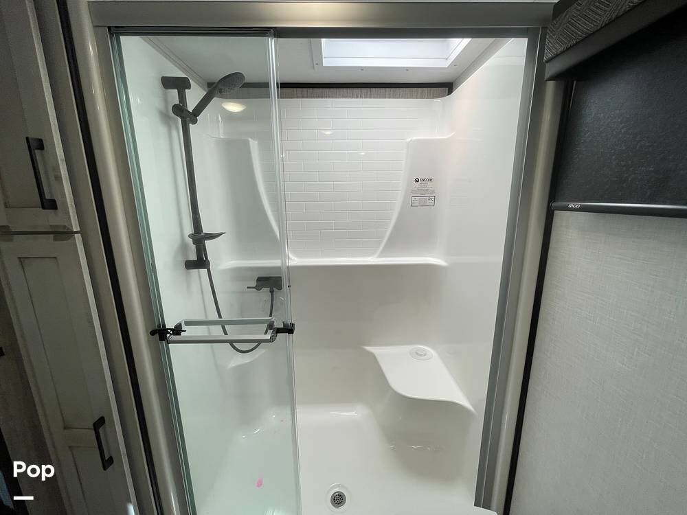 The spacious bathroom, with a double vanity and large shower, adds a residential feel, making every trip as comfortable as home.
