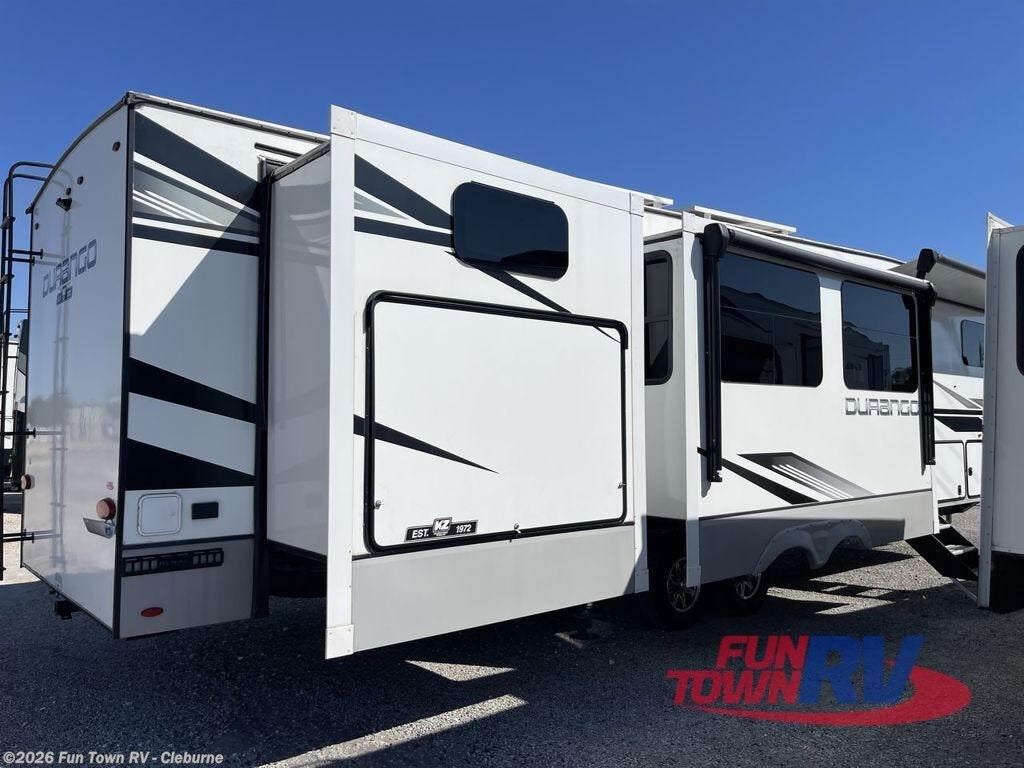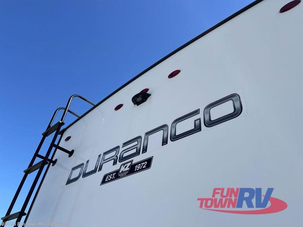 Enjoy full time living, an affordable price, and a wide body construction for more living space with every one of these KZ Durango light high-profile fifth wheels! These luxury units can be used all year round with the all-weather insulation package, the 3" x 14" foam-core in-floor straight-line heating system w/ a 35,000 BTU furnace, and the 15,000 BTU ducted roof A/C which optimizes the airflow by an average of 40% for better performance, cooling time, and reduction of noise. A few other construction features you will appreciate include a one piece, seamless walk-on Tufflex roofing material, Pex® in-floor heated waterlines, a Lamilux® gelcoat fiberglass exterior, and Dexter® axles with self adjusting brakes and height adjusting hangers. You can even head to the woods and go off-grid when you choose the optional off-the-grid solar package. Modern farmhouse cabinetry, a king size bed, and smart TVs will have you feeling like you never left home!