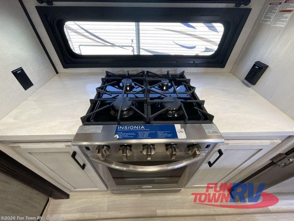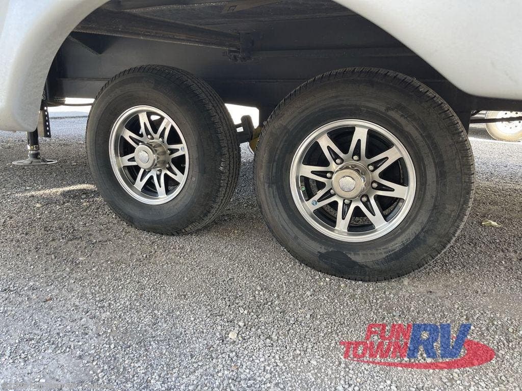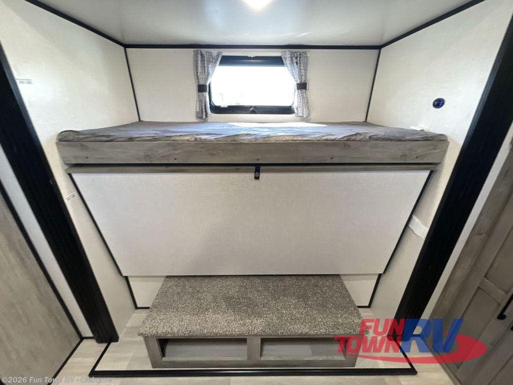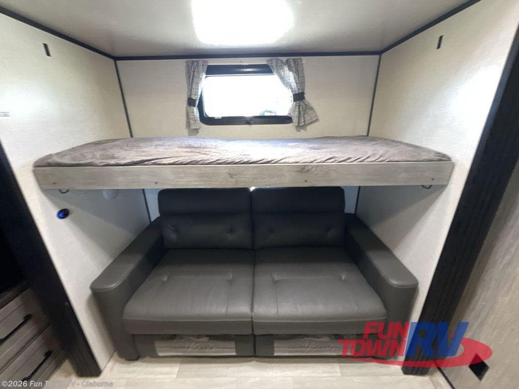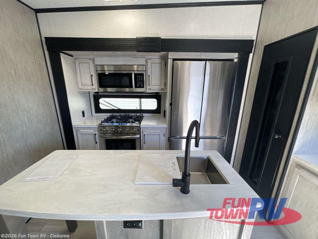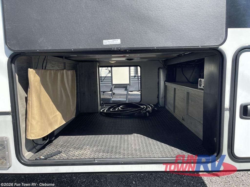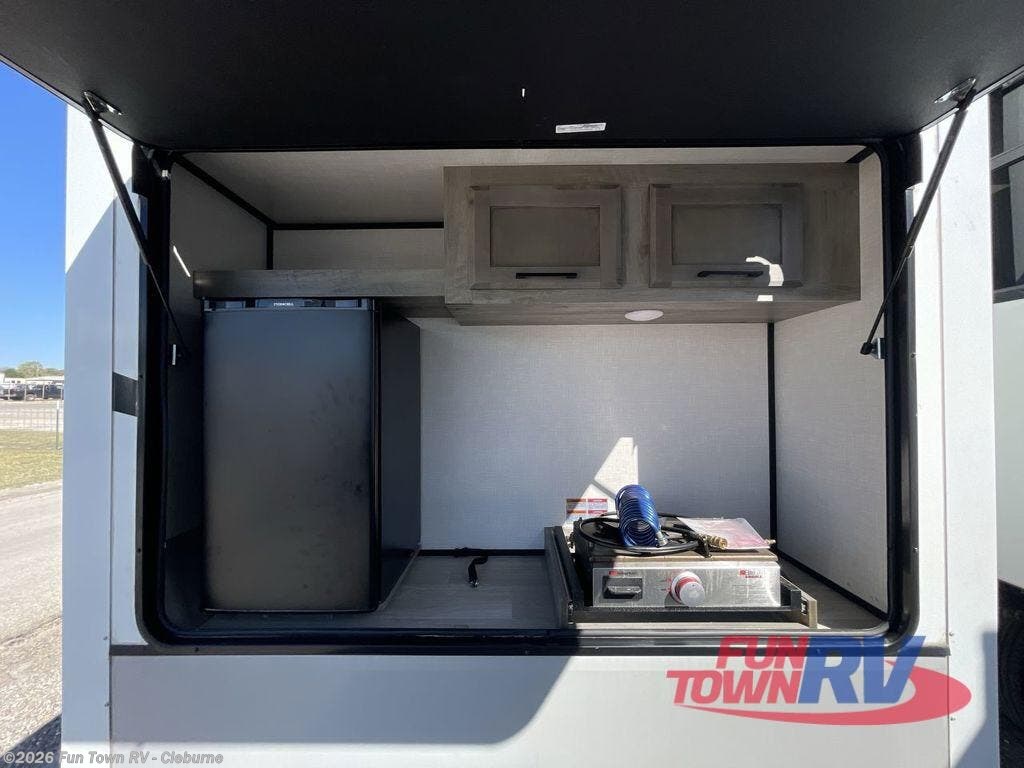 All of your friends and family can camp together in this fifth wheel! It features a rear private bunkhouse with a bunk above a hide-a-bed sofa, a full bathroom with a 30" x 36" shower, an entertainment center with wardrobes on either side, a folding bunk, and a bunk over the outside kitchen which even has a pellet smoker. Across from the hide-a-bed sofa is an entertainment center with a 40" fireplace and a 43" smart TV to watch your favorite movies at night. The kitchen island comes with two bar stools and you can prepare your best meals with the four burner range with a 24" oven. The second bathroom has a 48" x 30" residential shower with a seat and a linen closet to keep your towel close. Enjoy a good night's rest on the king bed slide in the front private bedroom which also has a dresser with a built-in hamper and a front wardrobe that is prepped to add an optional washer and dryer!