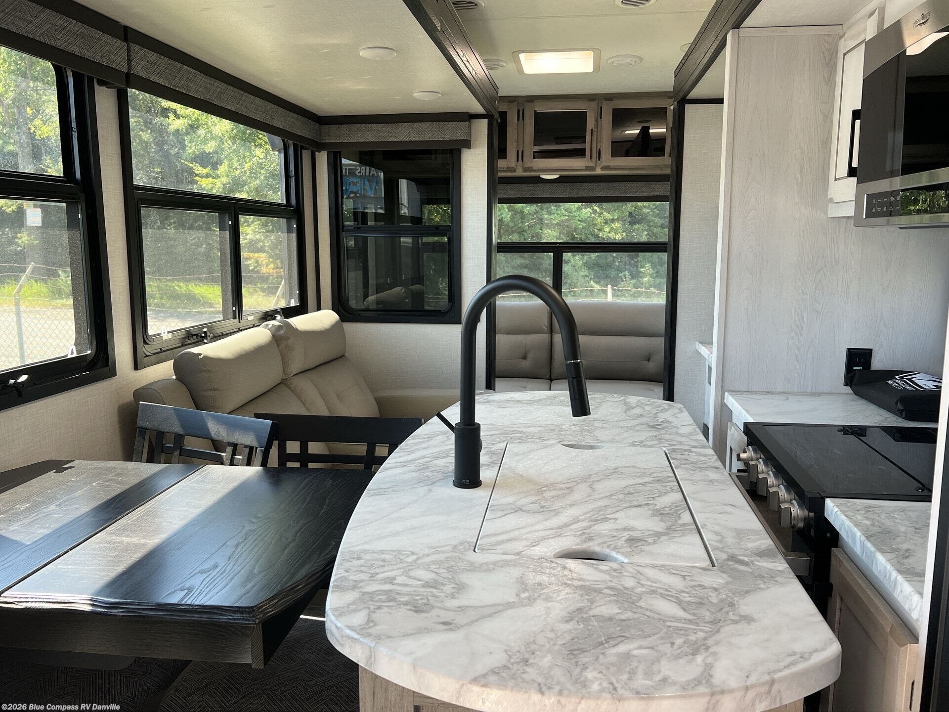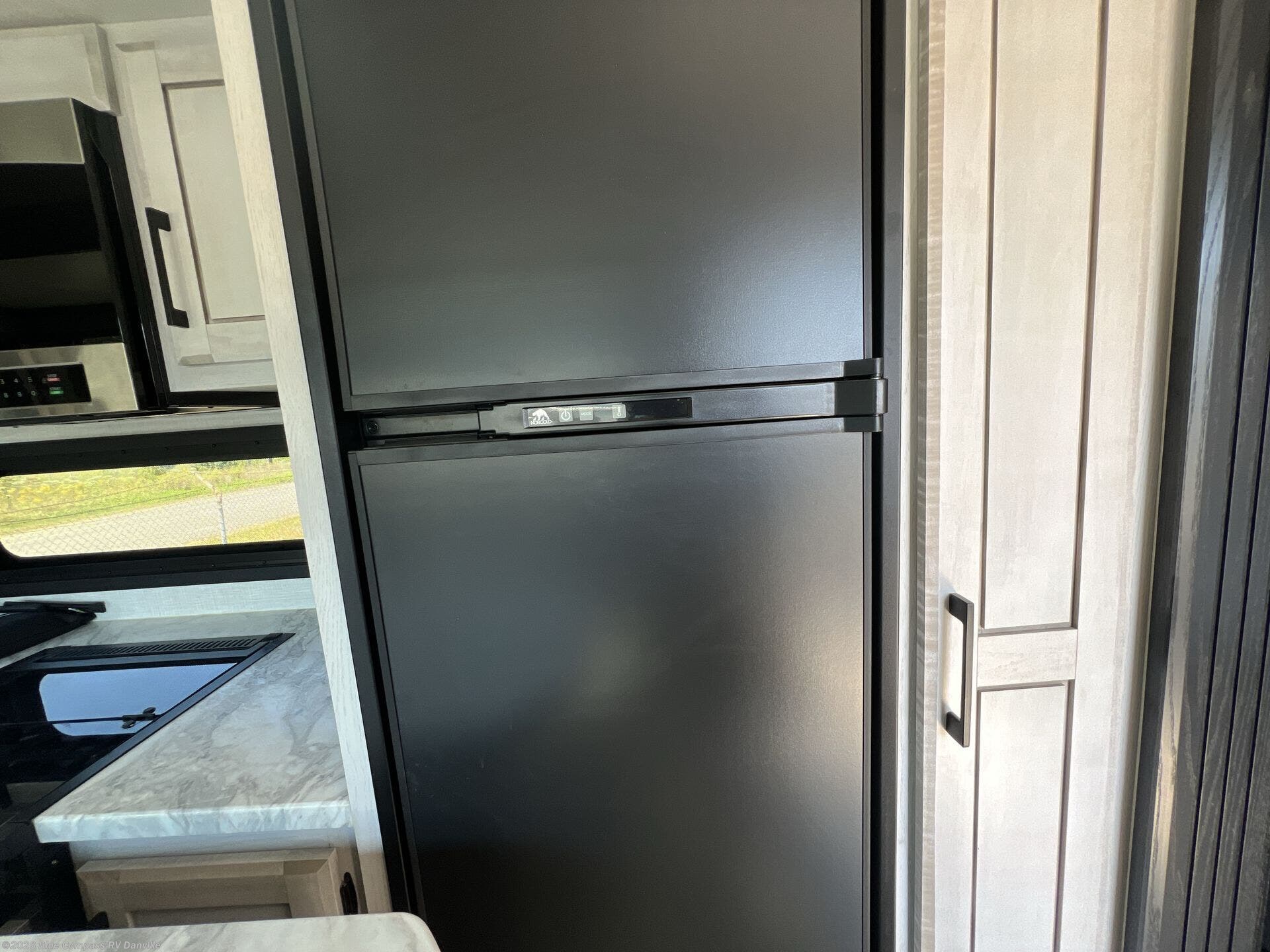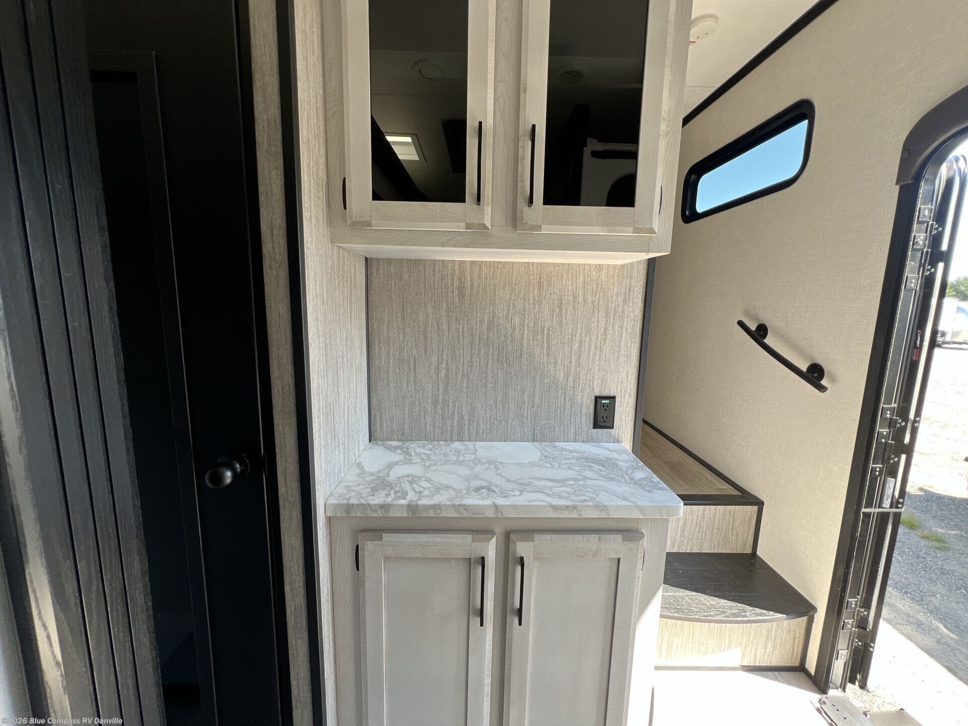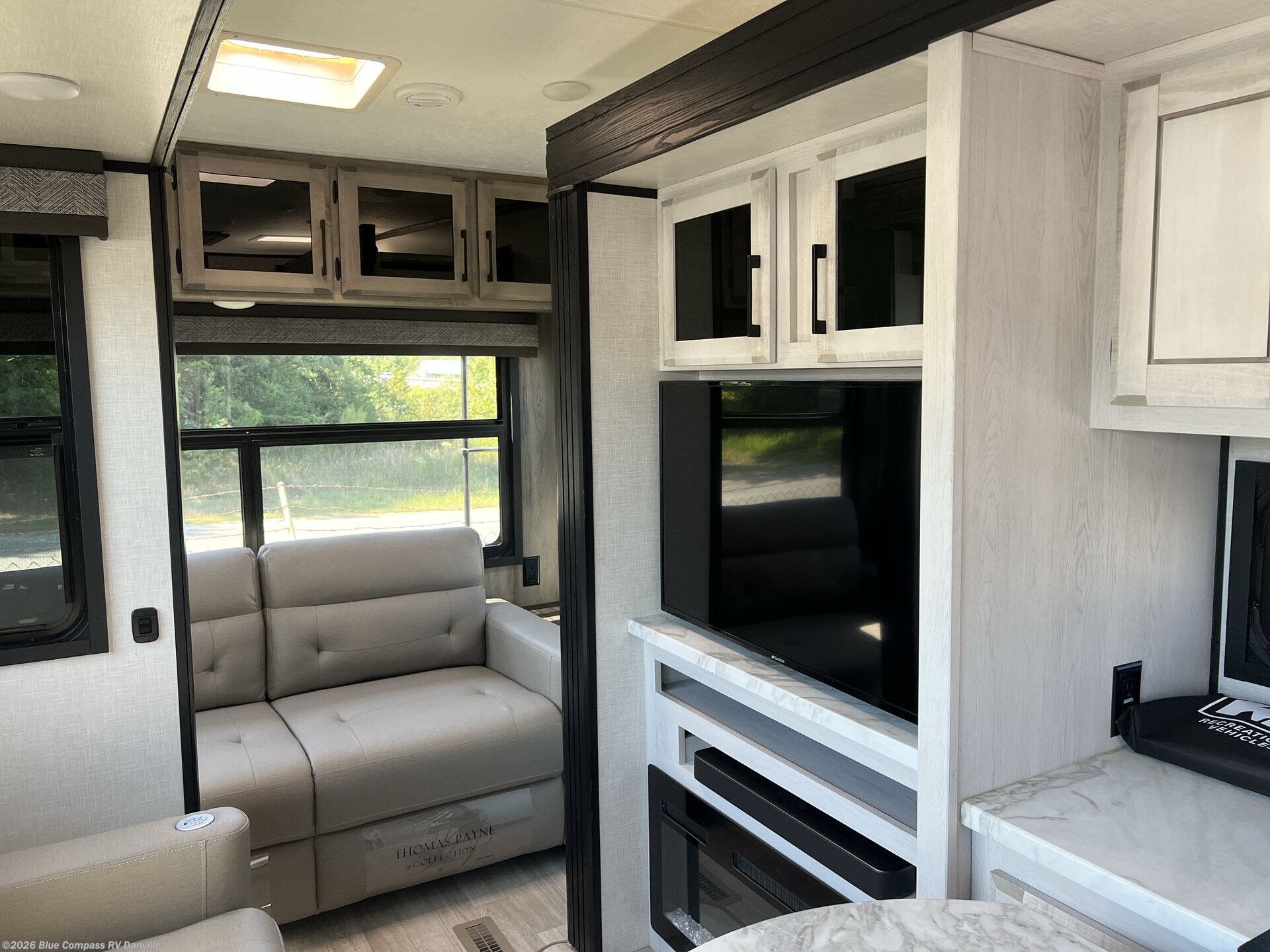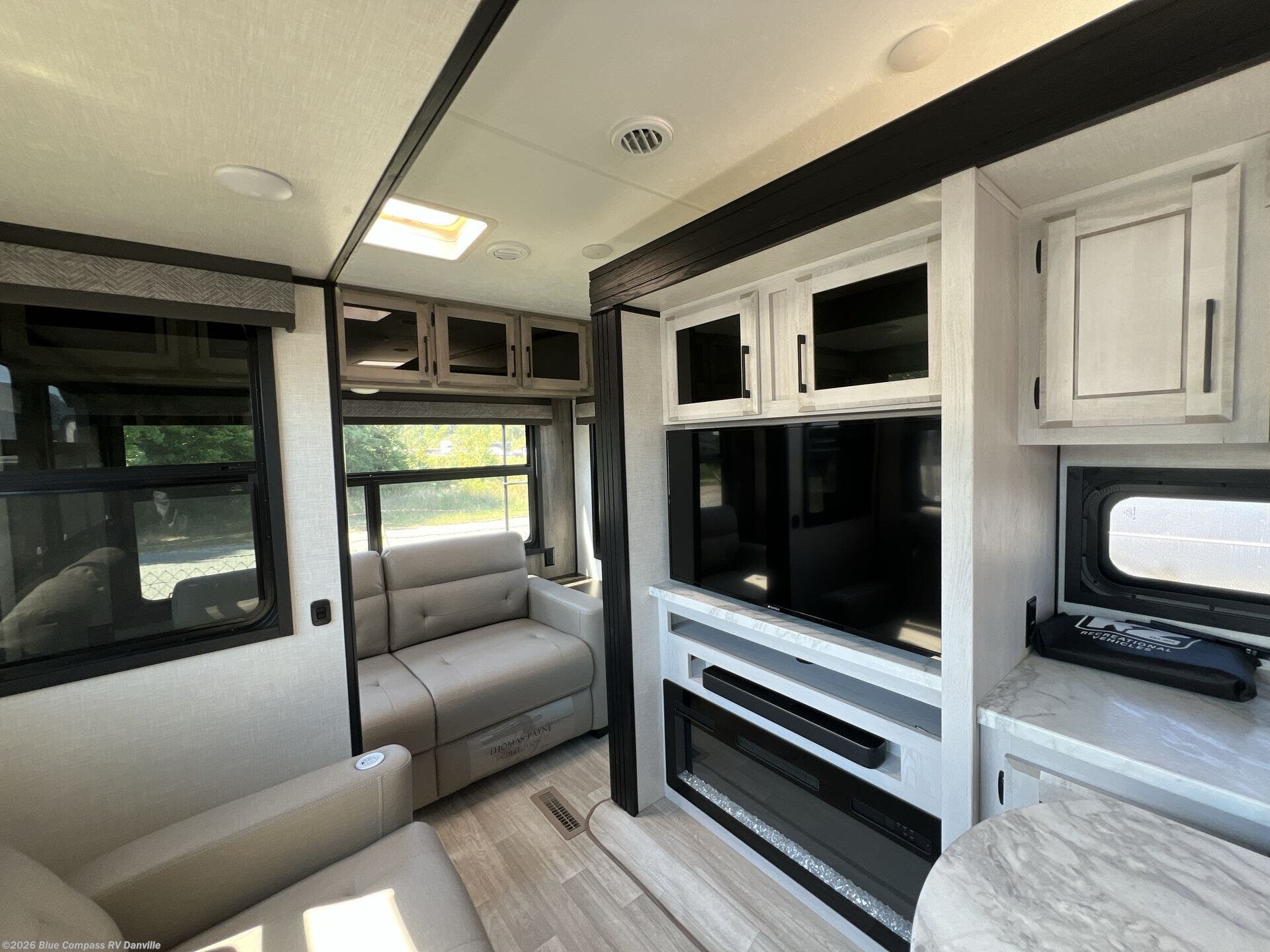 This fifth wheel will feel just like home with its kitchen island, theater seating, and front private bedroom! If you have any overnight guests, they can sleep on the rear hide-a-bed sofa or on the booth dinette. This model also includes an entertainment center with a 43" Smart LED TV and an optional 40" fireplace can be added for more comfort. You will love the extra features that have been added, like the hutch in the kitchen for extra counter and storage space, the shower skylight in the spacious full bath, and the slide out wardrobe in the front bedroom!
