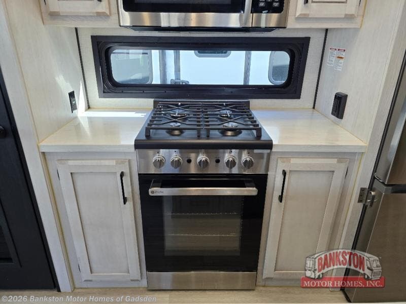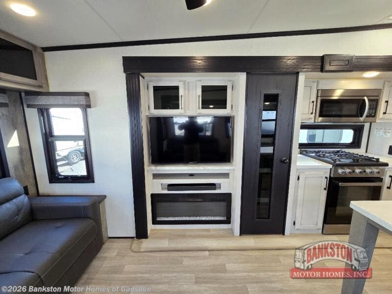 Don't pass up your chance to camp in true luxury with this fifth wheel! There is a kitchen island with two bar stools for others to help prepare dinner which can be either cooked on the four burner range or inside the 24" oven. The hutch can store your dishes and the large pantry can store your favorite snacks/canned goods. After a fun day at the beach, rinse the sand out in the 48" x 30" residential shower with a seat in the full bathroom, plus it has a dual sink vanity for two to get ready at once in the morning. When it's time to relax either lay down on the king bed slide in the front private bedroom or head to the rear living area where you can lay on the hide-a-bed sofa or sit in the theater seating with USB charging across from the entertainment center with a 40" fireplace and 43" smart LED TV to watch a movie!