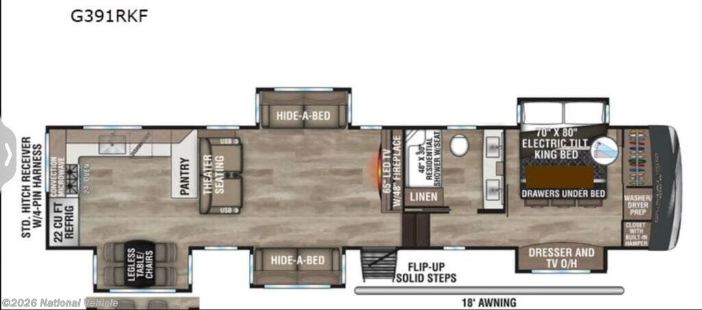 Adjacent to the kitchen, the entertainment area boasts a 65" LED TV and sound bar complemented by an electric fireplace, creating a cozy ambiance for relaxation. The living space is further enhanced with theater seating featuring heat, massage, and powered recline functions, ensuring maximum comfort.