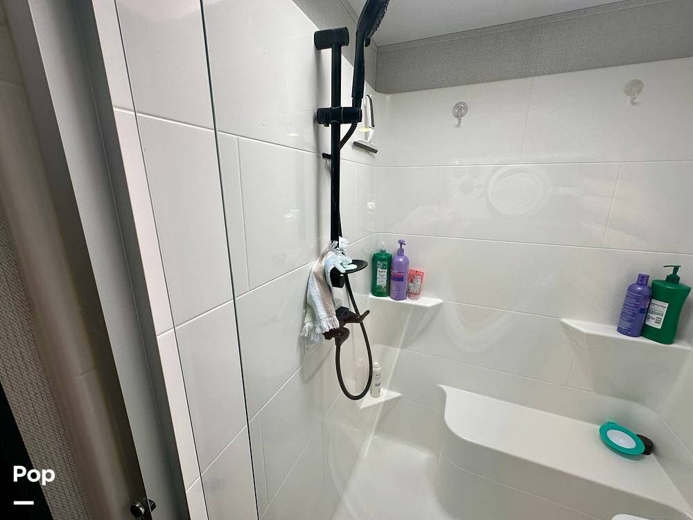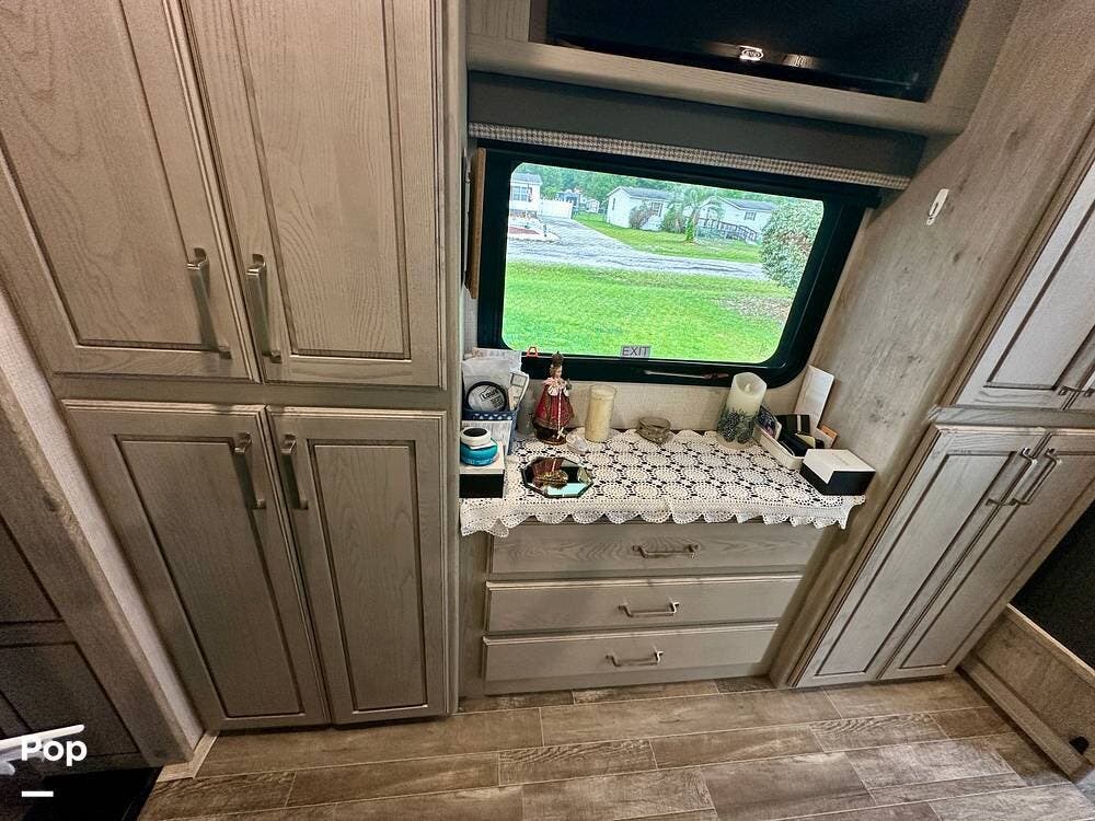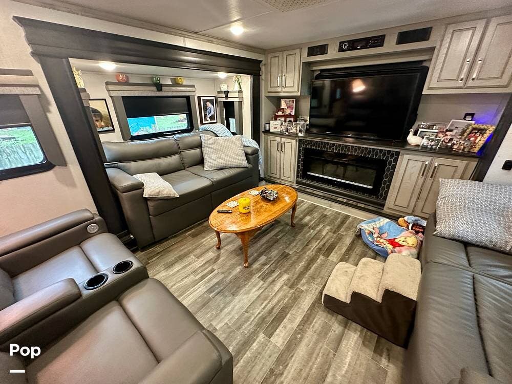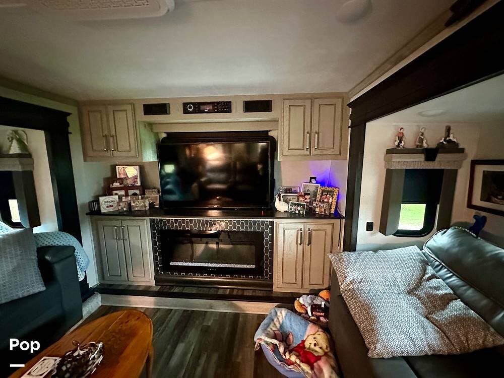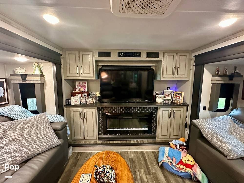 This beauty has tons of outside storage. When the evening chill rolls in, you enter your luxury retreat. The fireplace flickers, casting a warm glow over the spacious front living area.