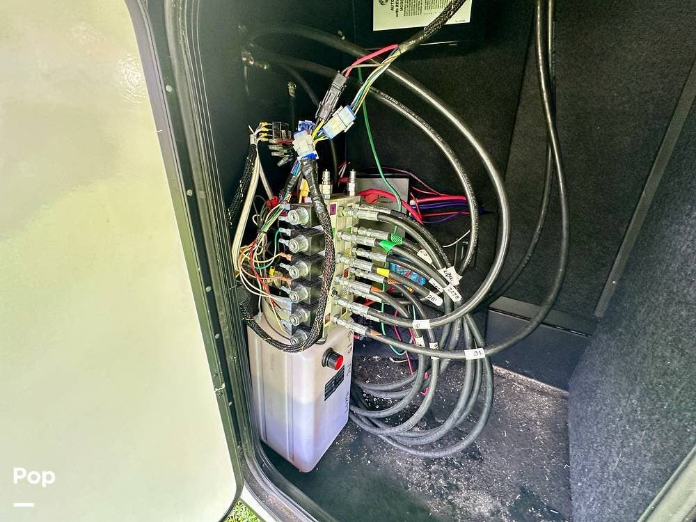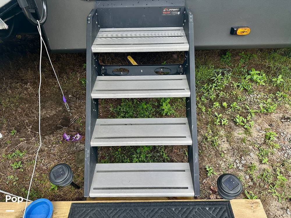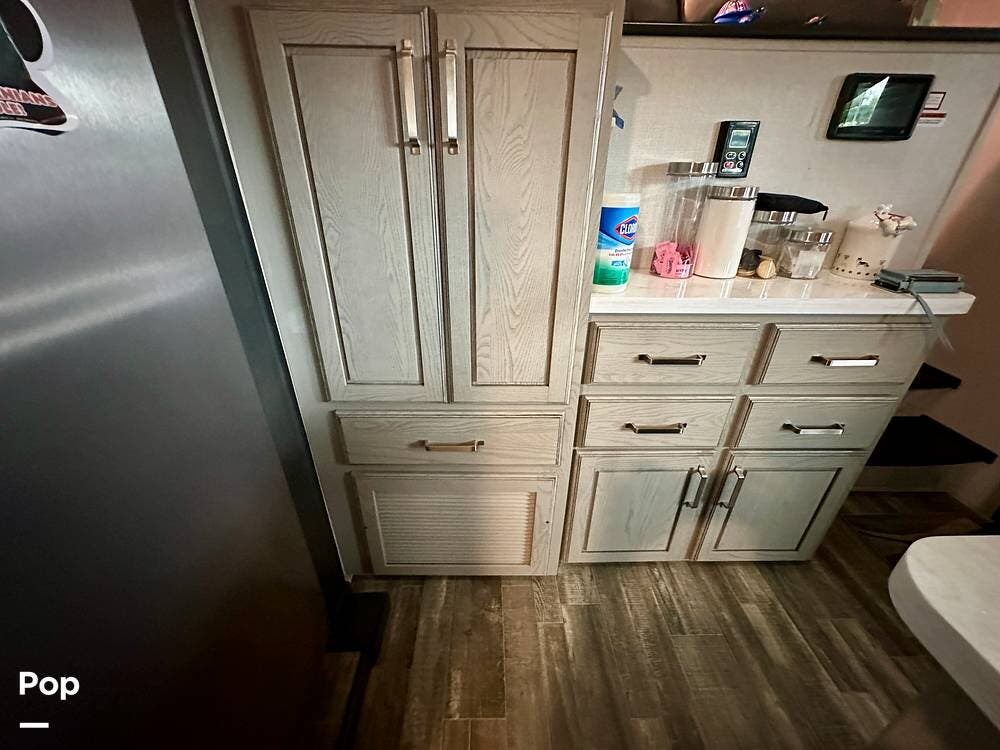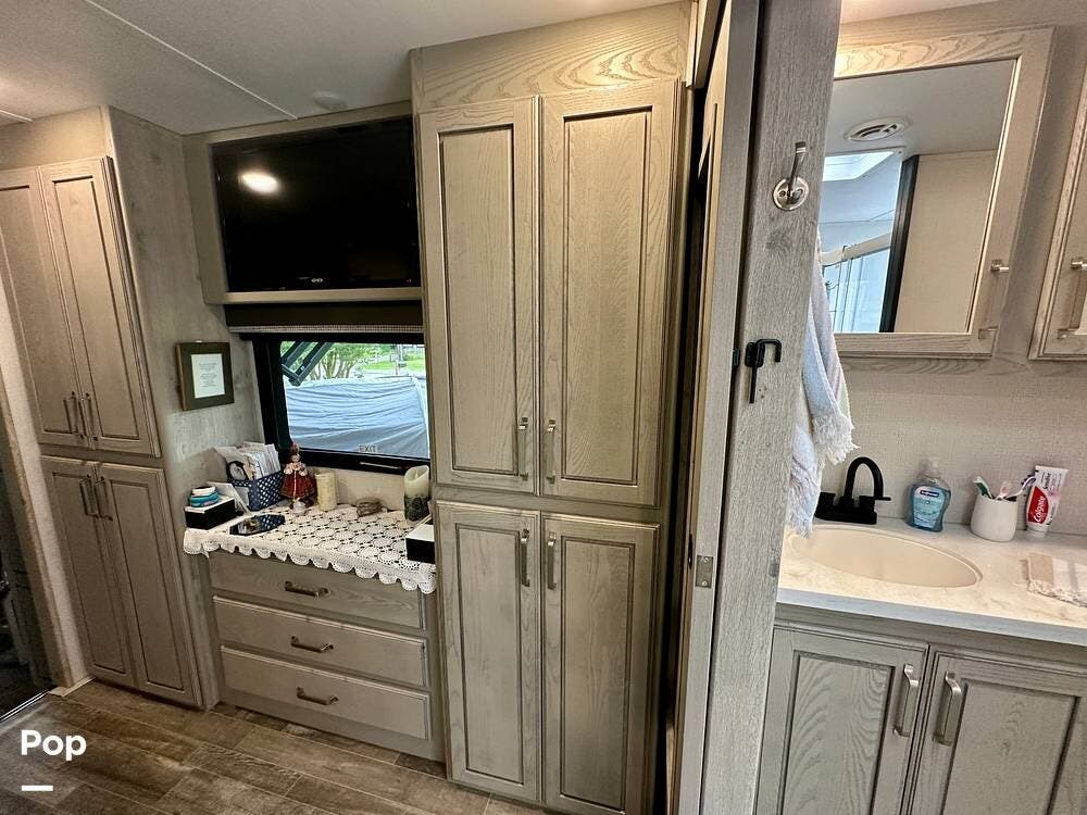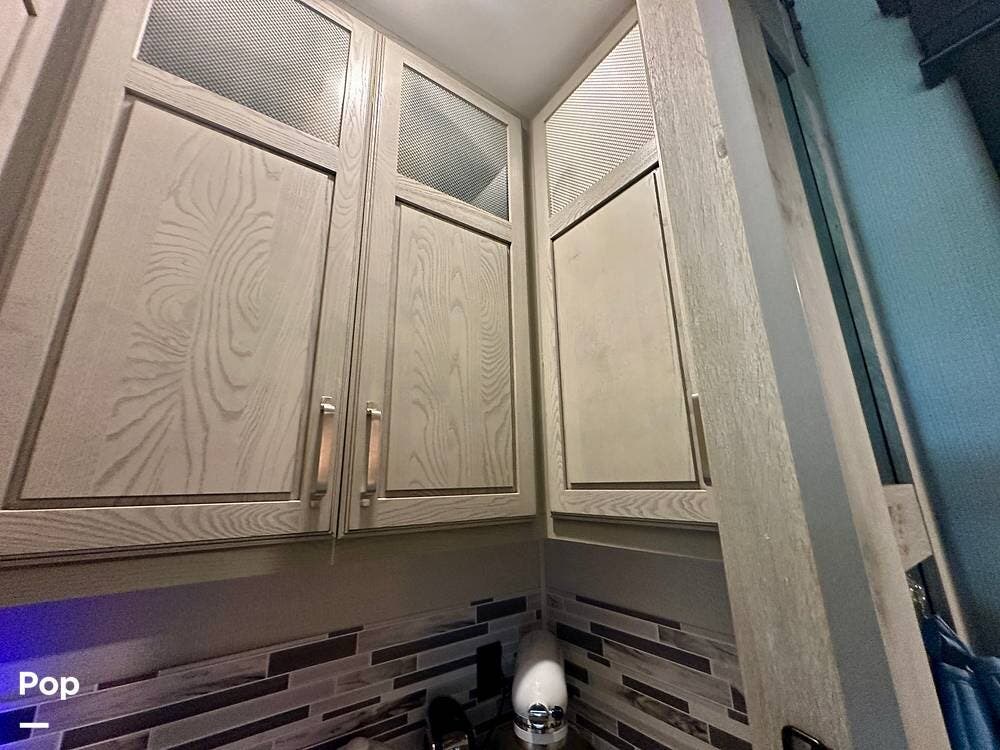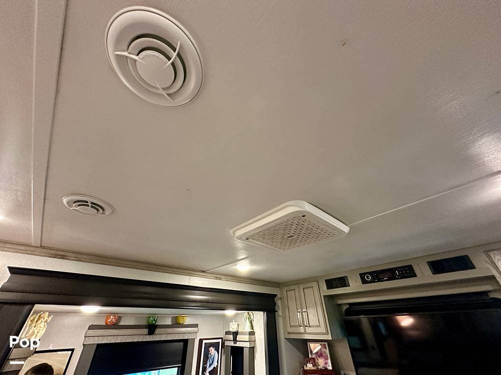 This beauty has tons of outside storage. When the evening chill rolls in, you enter your luxury retreat. The fireplace flickers, casting a warm glow over the spacious front living area.