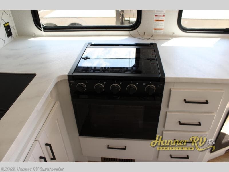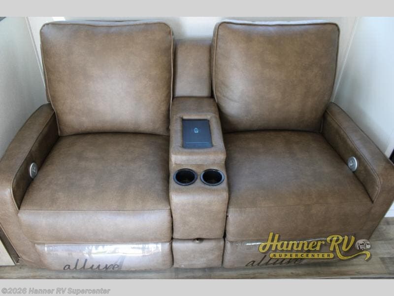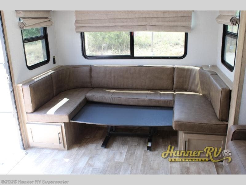 This fifth wheel is both spacious and easy to tow; so come take a look! When you arrive at the campground you can set up the 20' electric awning, then stretch your legs on a trail or two. The full bath will be waiting for you when you return, and you'll enjoy a large shower here with a glass door and a skylight for added light. Head to the full kitchen to prepare dinner on the three burner cooktop, or use the microwave oven here. There is also a high-rise chef's faucet and sprayer here and a 10 cu. ft. 12V "solar friendly" refrigerator with dent resistant doors. Your crew can dine around the U-shaped dinette with the fireplace close by, plus this model includes theater seating for all-around comfort! After a long day, the queen bed in the front bedroom will be calling your name, while your guests sleep on the rear dinette.