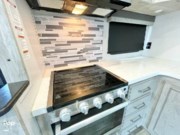 This RV is designed in popular white, gray, and tan colors, with farmhouse wood-style floors and solid-surface countertops. Cabinet and closet space abound in this model, and the fireplace, hide-away large-screen TV, and large slide-out space create a true great room feel. Great for entertaining!