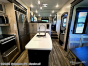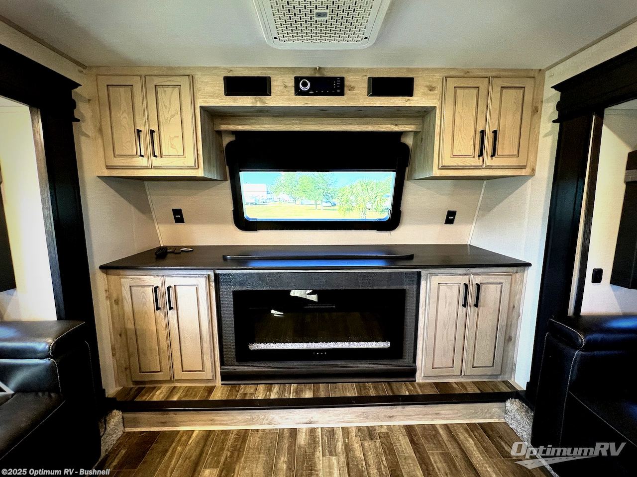 Enjoy traveling with your family and friends in this fifth wheel featuring FIVE slides providing space for everyone! The front living area offers two of those slides each with a tri-fold sleeper sofa for family or overnight guests. A full wall entertainment area and fireplace, plus a theater seat sets this space up as a great gathering place for all to enjoy. Step down to the spacious double slide kitchen and dining area with free standing dinette, a kitchen island, and coffee station, plus 18 cu. ft. refrigerator and range slide with residential microwave overhead. You can easily prepare and enjoy meals while you travel just like at home. At the rear of this amazing coach, you will find a private bed/bath suite featuring a large shower, a king bed slide with storage beneath for extra blankets, plus a wardrobe with bench/workstation and separate space that has been prepped for an optional stackable washer and dryer to provide even more at-home conveniences.