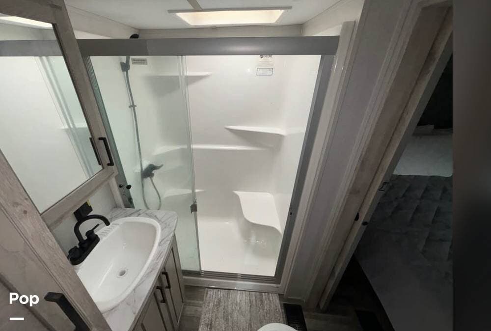 The master suite is located at the opposite end of the RV (Front) and features a private entrance into the bathroom from the bedroom, as well as an entrance from the hallway. The bathroom features a large step-in shower with a corner seat, a skylight overhead for ample natural lighting, a sink with a medicine cabinet and a linen cabinet, and, of course, the toilet.