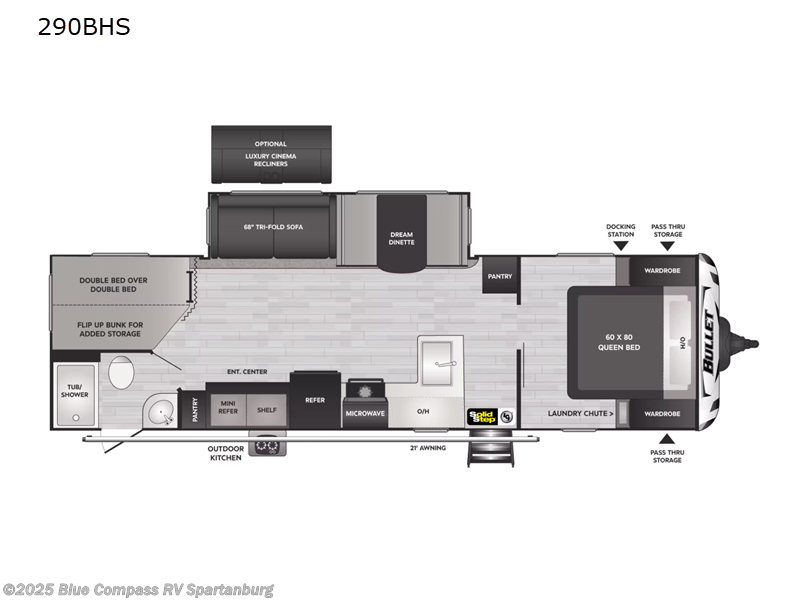 Indoor full kitchen amenities, an outside kitchen, an exterior and interior entry into the full bathroom and a space saving sliding door into the front bedroom are a few reasons you will love this trailer that accommodates nine at night. Yet the double-size bunks with privacy curtain and ladder, plus the slide out with a tri-fold sofa and Dream dinette might be the reason you choose this RV. The cook will love the Furrion appliances, the 8 cu. ft. refrigerator and the single basin stainless steel sink to make meals for everyone, plus the outside kitchen gives them more choices. And you can sleep like a queen in the bedroom which also includes dual wardrobes and a laundry chute.