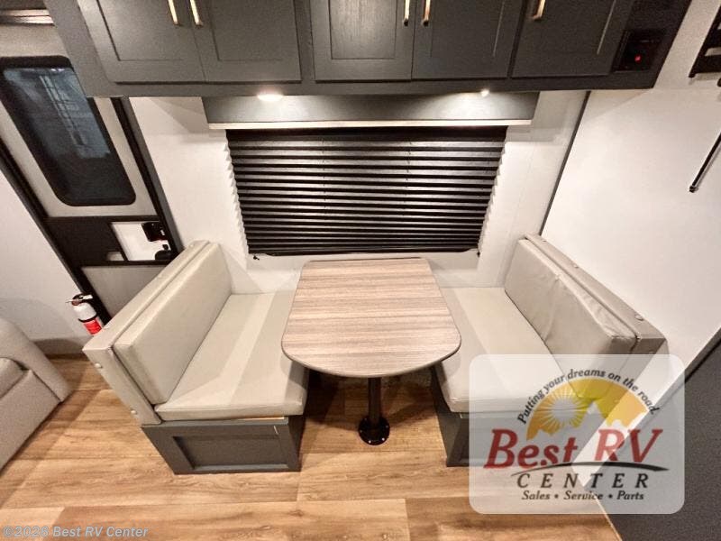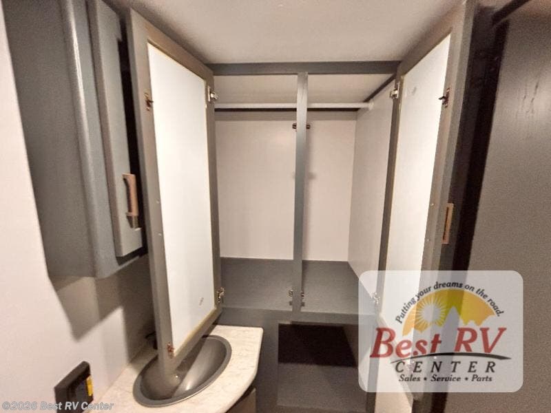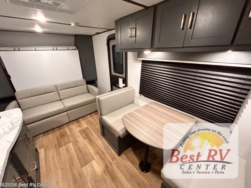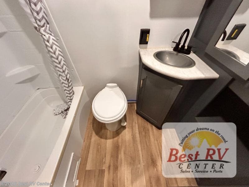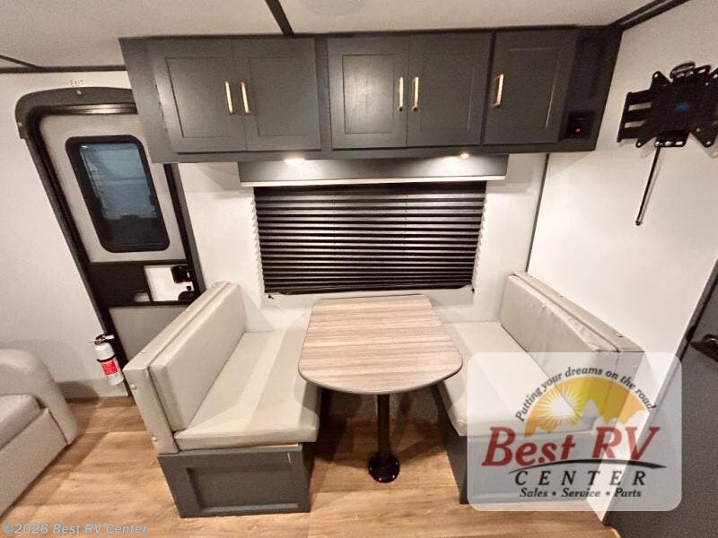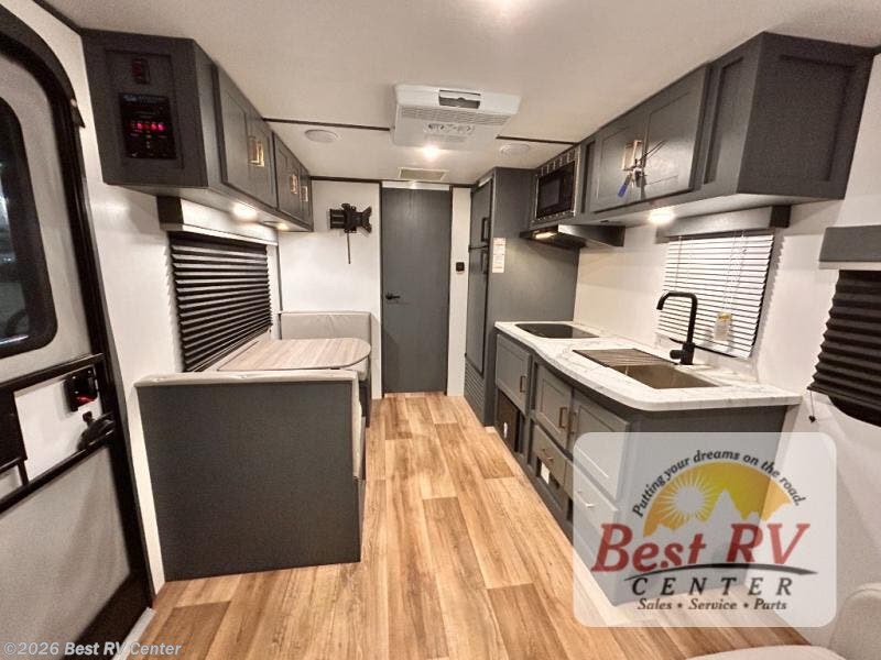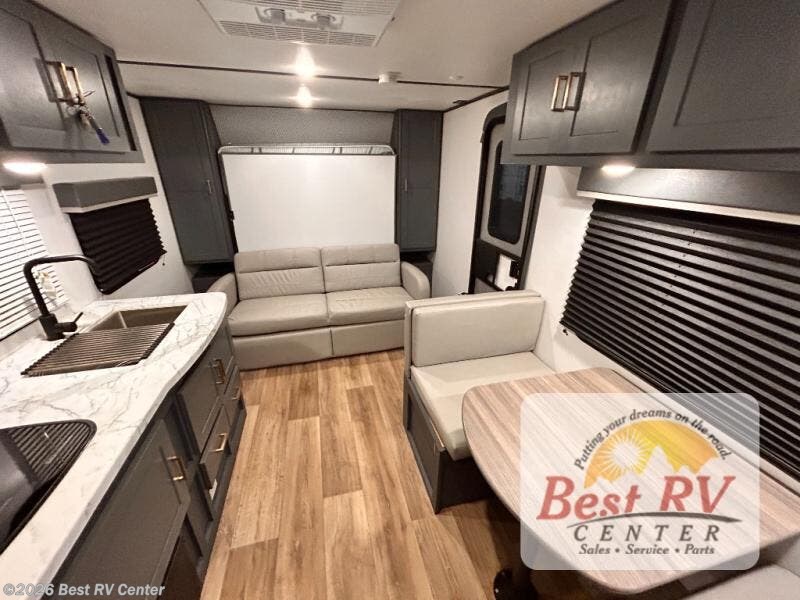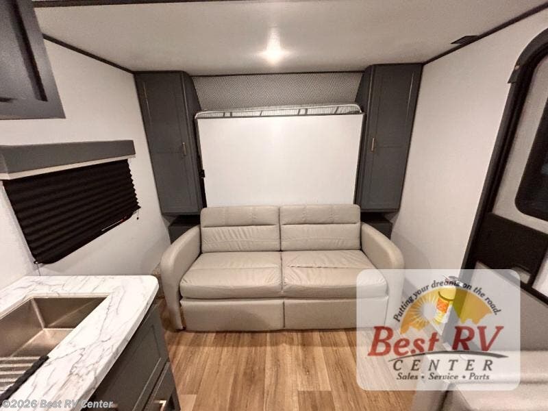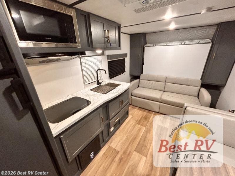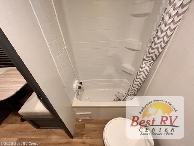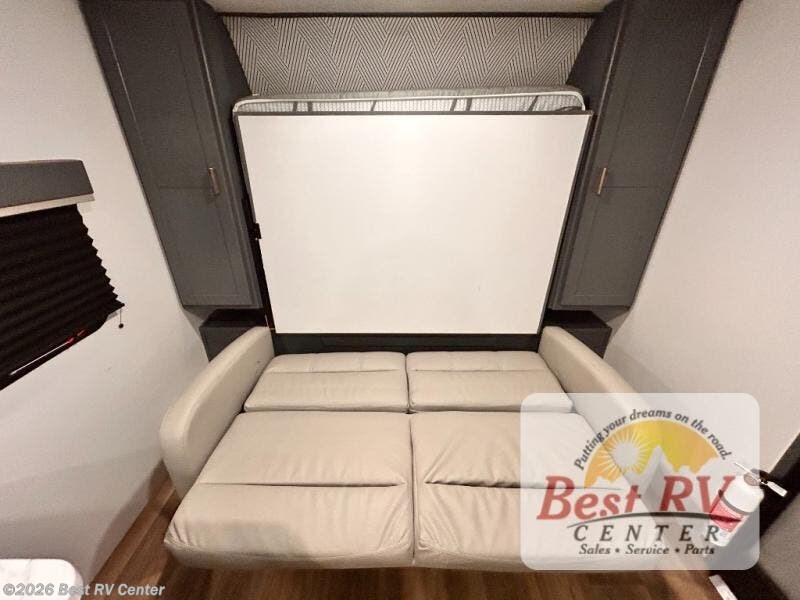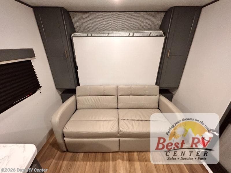 If you're looking for a versatile travel trailer, your search is over! This model includes a front Murphy bed that can be folded away in the morning so you can relax on the sofa. There is a booth dinette where you can dine, relax, and even sleep an extra guest or two small children. The spacious full rear bath includes a wardrobe/linen closet to clean up each day, and a tub/shower that will be perfect for little ones. You'll find plenty of storage space for all your belongings, including overhead compartments, dual bedroom wardrobes, and an exterior pass-through storage for fishing poles!