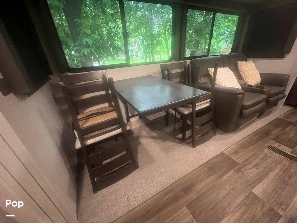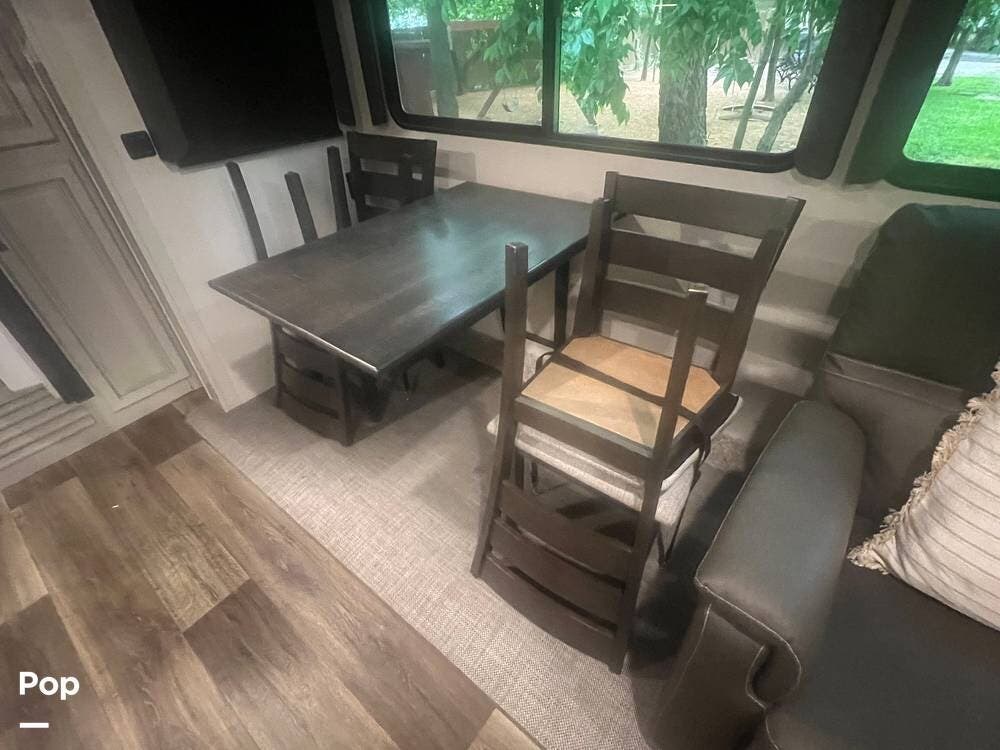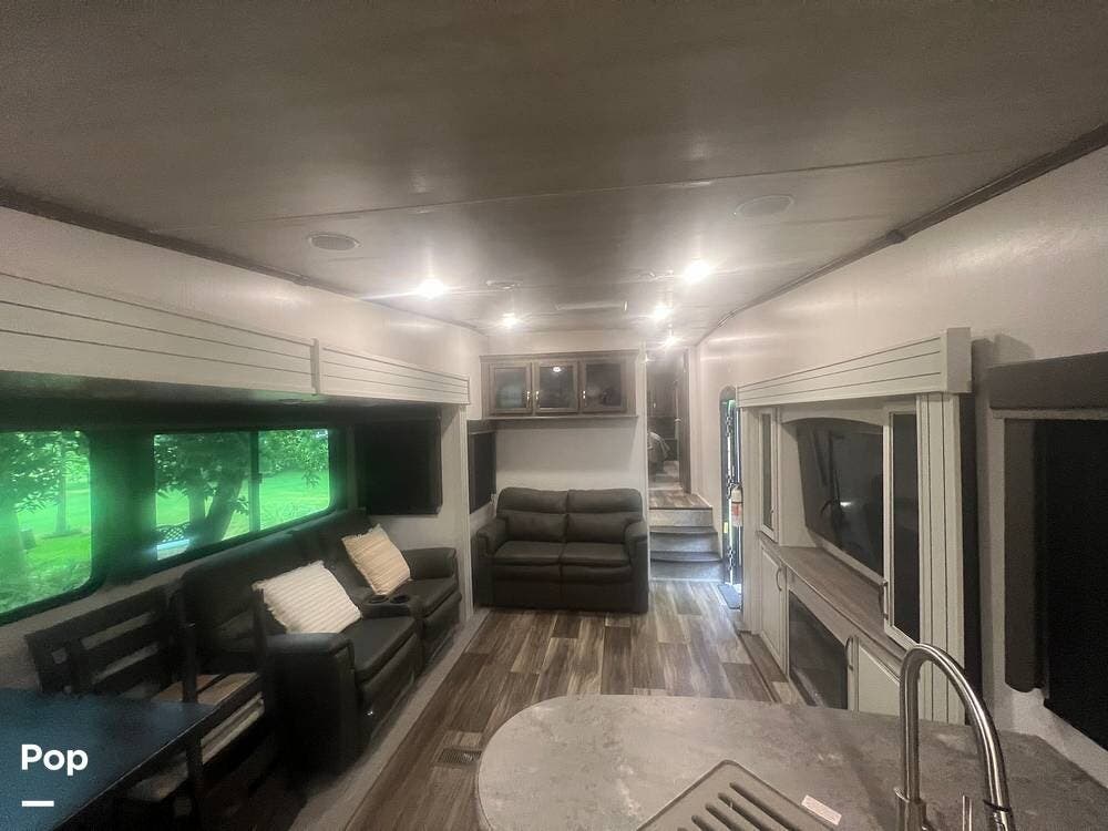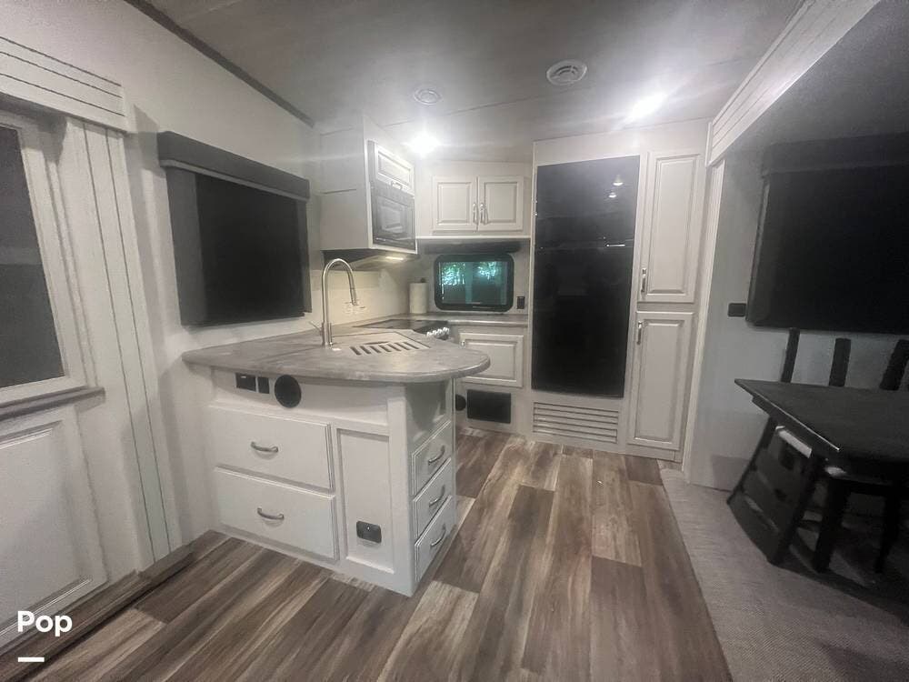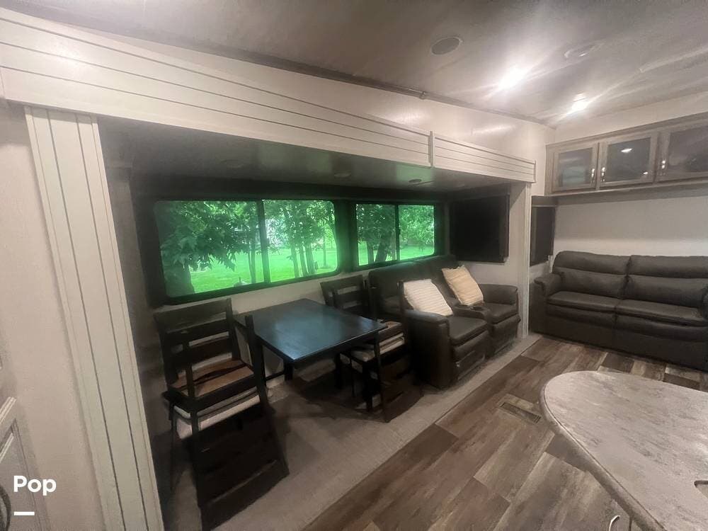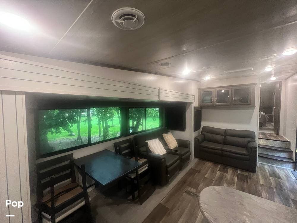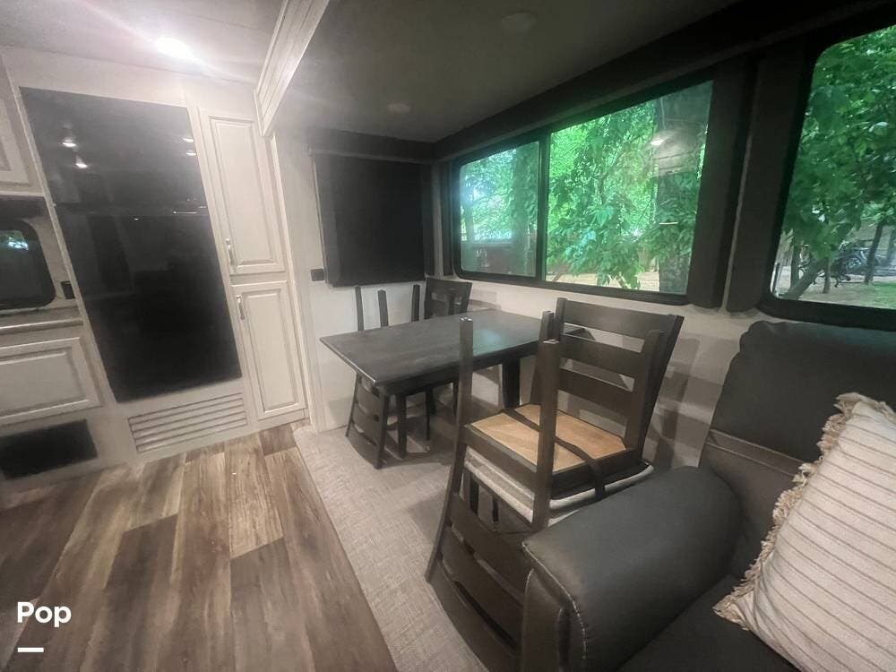 Inside, the Keystone Cougar 1/2 Ton 29RKS exudes comfort and sophistication with its modern design and upscale amenities. The living area features a cozy sofa sleeper and dining room table and chairs, providing ample seating space for relaxing and dining.