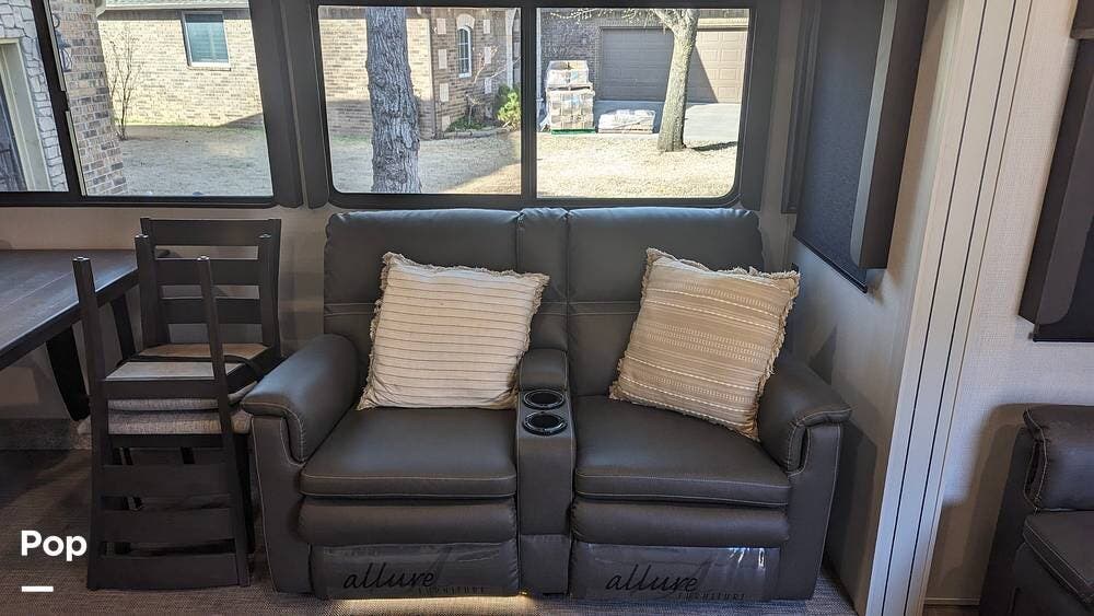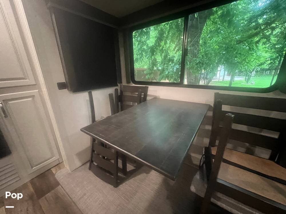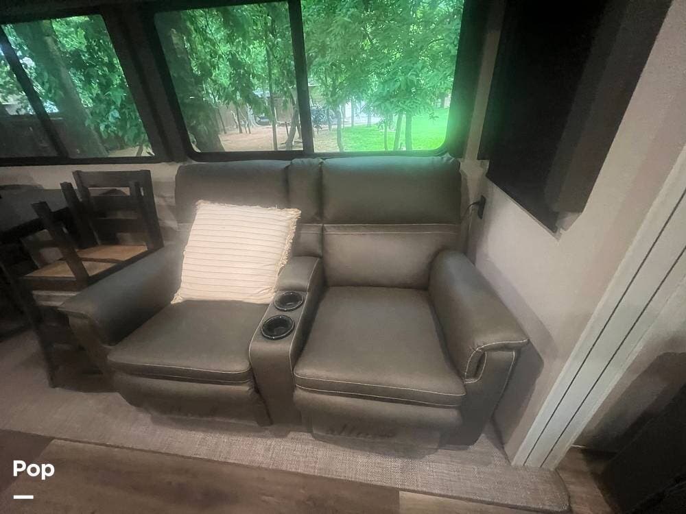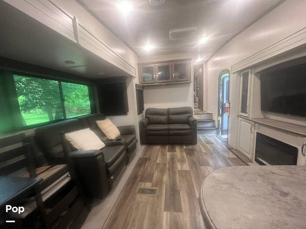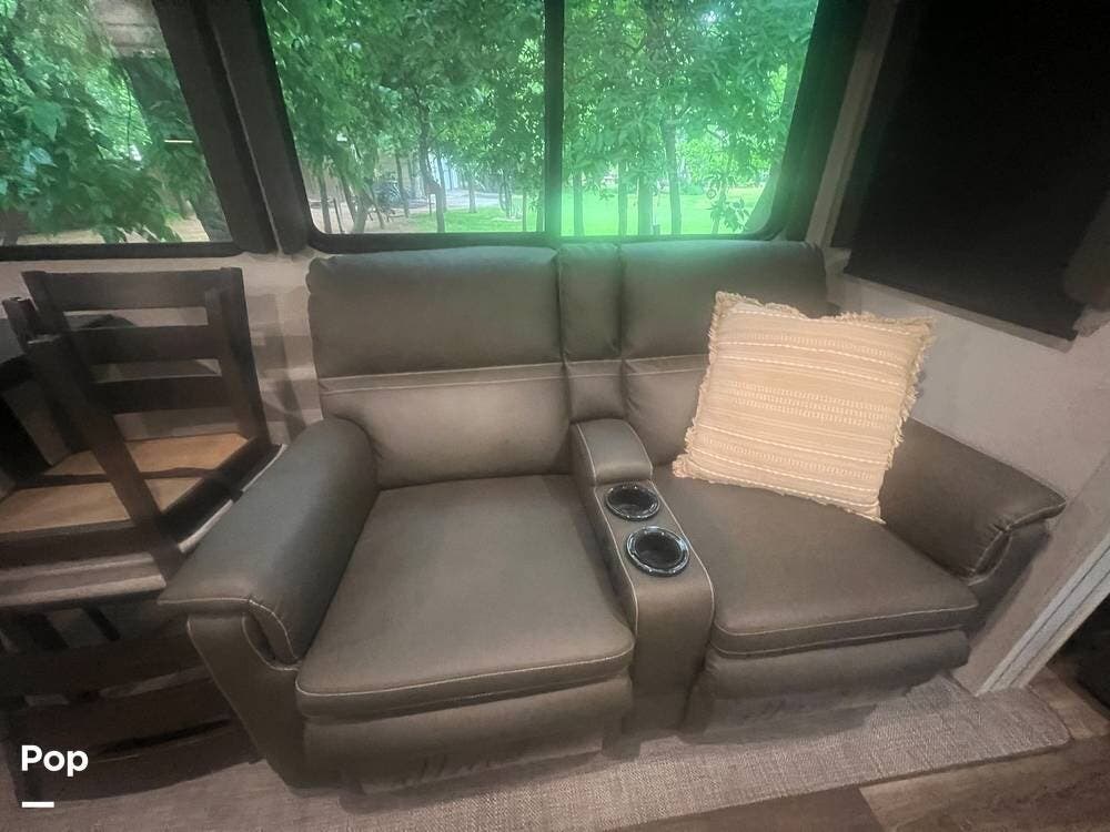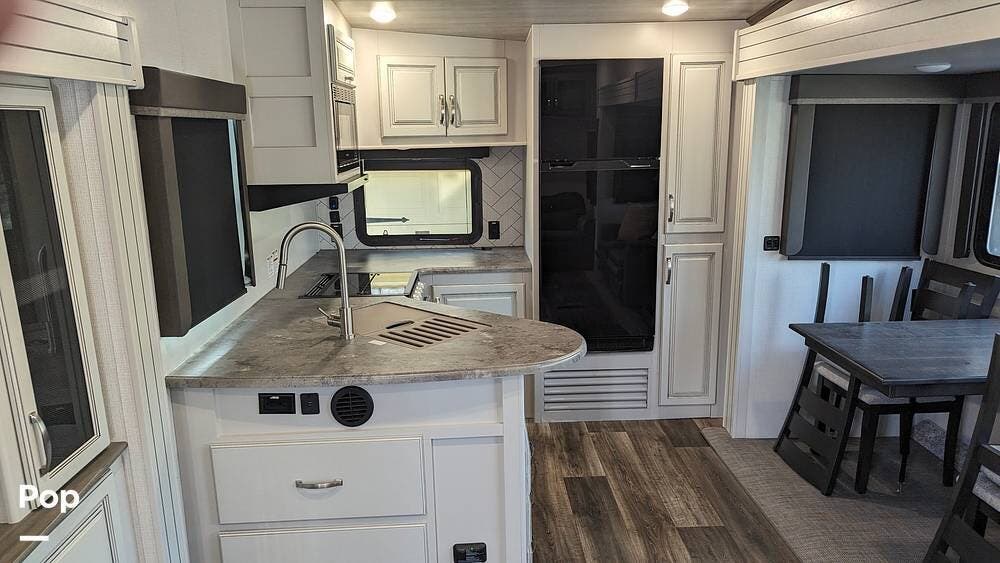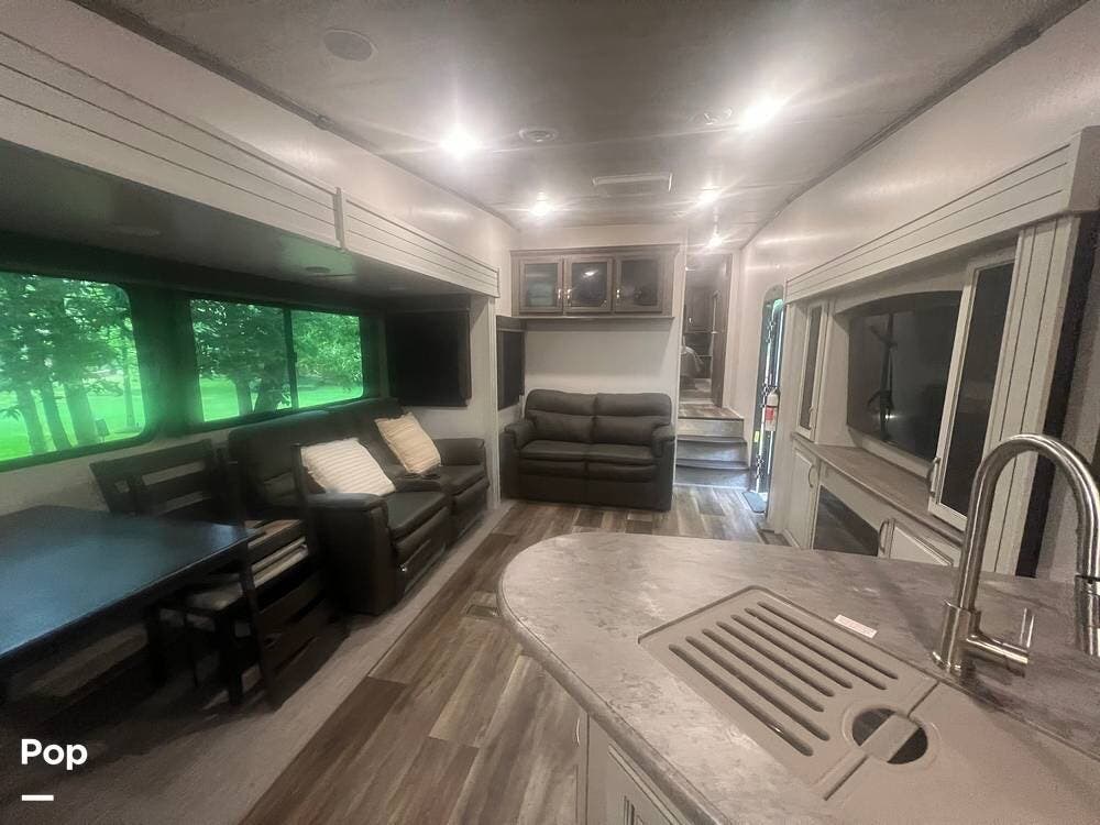 Inside, the Keystone Cougar 1/2 Ton 29RKS exudes comfort and sophistication with its modern design and upscale amenities. The living area features a cozy sofa sleeper and dining room table and chairs, providing ample seating space for relaxing and dining.
