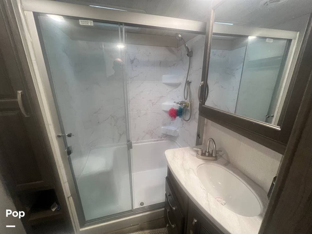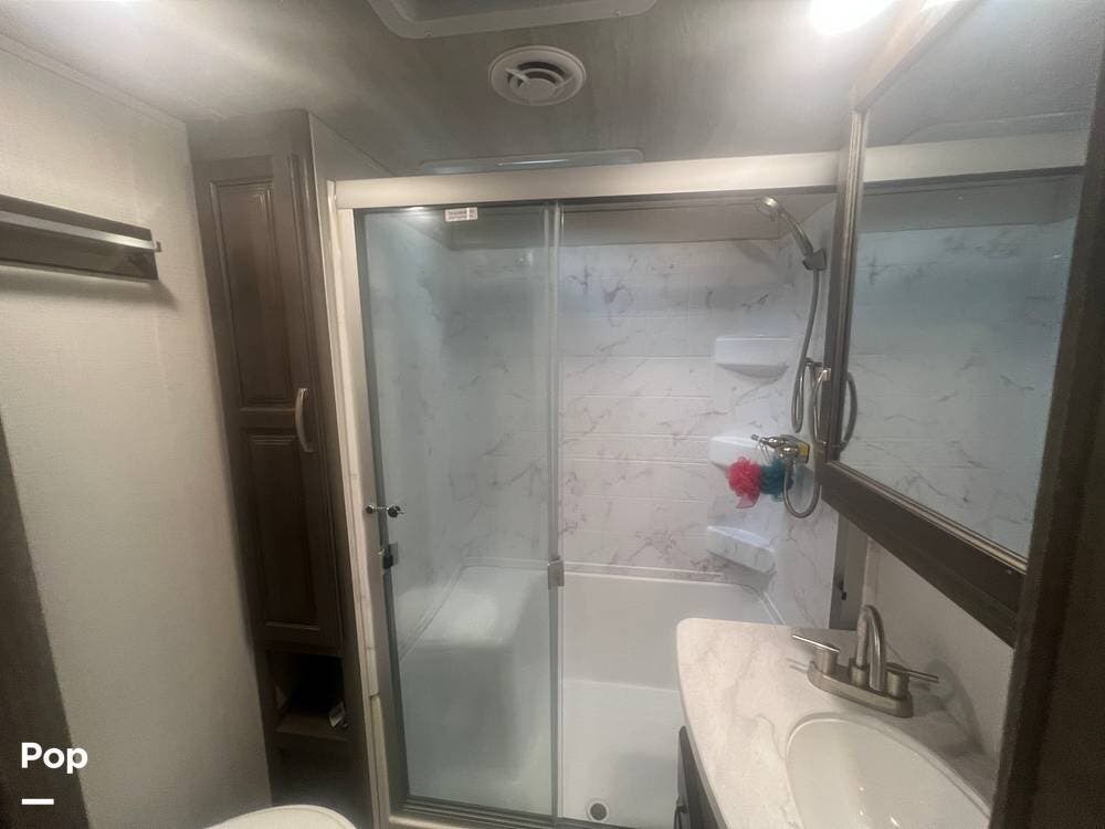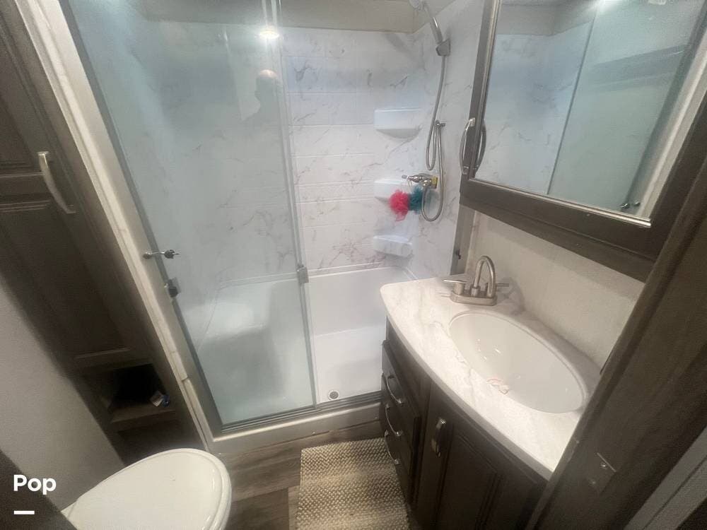 The bathroom features a spacious shower, toilet, sink, and storage space for toiletries and linens.