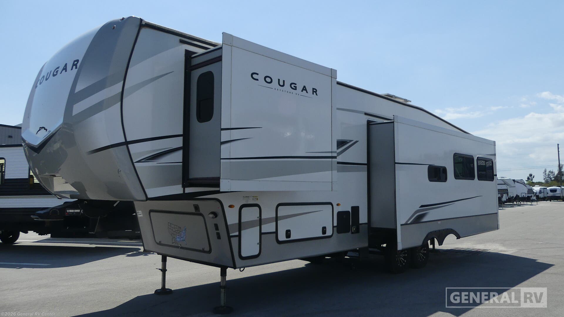 **Keystone Cougar fifth wheel 320RDS highlights:** - Triple Slide Outs - Rear Den/Living Area - 16 Cu. Ft. 12V Refrigerator - Front Private Bedroom - Spacious Full Bath Time at the campground will be spent in comfort thanks to this fifth wheel that can sleep four to six people comfortably. The rear living area/den includes a huge L-shaped sofa with theater seats and a king tri-fold sofa, a fireplace, and an LED HDTV for movie nights. The chef of your group will love the additional counter space in the kitchen, along with a 21" Furrion range, a pantry, plus bar stool seating. The full bath allows you to clean up each day and the front private bedroom will provide you with your own space at night. Here, you'll find a king bed, plus a full height wardrobe, a second wardrobe with washer and dryer prep, and a dresser for tons of storage space! And don't overlook the exterior with its LCI solid steps and 17' electric awning! Spend more time having fun and less time worrying about your RV with the Keystone Cougar fifth wheel! These units have all that you will need for excellent vacations. The interior comes with 5/8" one-piece DynaSpan® flooring, tall slide outs for added comfort and head room, night roller shades throughout, and residential, raised-panel hardwood cabinet doors and drawers. You will also enjoy decorative crown molding, a 5,500 BTU electric fireplace with thermostat control and remote, and a Max Air exhaust fan with rain sensor. The exterior is also fully outfitted with a convenience center, friction-hinge entry door, electric four-point auto leveling system, and LCI® SolidStep® on the main entry. There is a full pass-through storage with slam-latch baggage doors, an industry-best 80-gallon fresh tank capacity, a 2" accessory hitch with 300-LB storage capacity, and an outside shower.