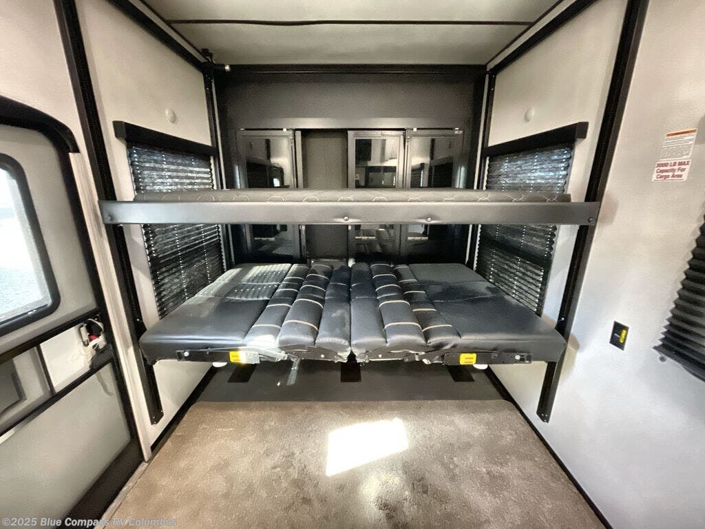 You will have everything you need and then some with this toy hauler! From the outdoor entertainment center with an LED TV and a refrigerator to the 14' 6" garage area with dual opposing sofas with a queen bed above them, an LED TV, and a loft with bunk mat. The garage also has a half bathroom, an Adjust-A-Track system with the tie downs welded to the frame, and a 8' MORryde zero gravity ramp door to easily load an unload your toys. The center table has swing-out stools to enjoy your morning coffee before freshening up in the dual entry bathroom with a residential shower with a seat. The bathroom even leads directly into the front private bedroom which has a residential king bed slide, a dresser with an LED TV, and a front master closet that is prepped to add an optional washer and dryer. A few other features you will appreciate include dual entry doors to the unit, a front exterior Fuzion front stor/more box, a rear exterior Fuzion utility storage, and dual 30 gallon fuel tanks for your toys!