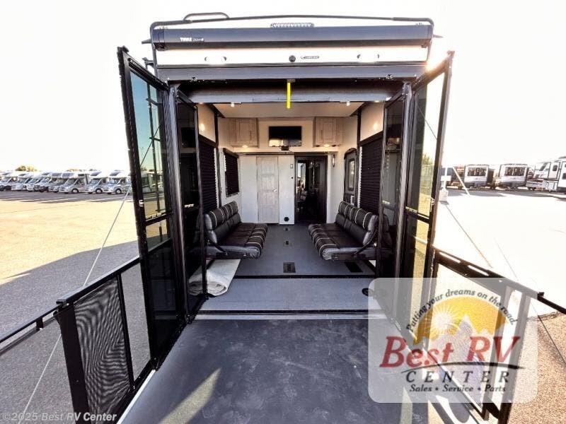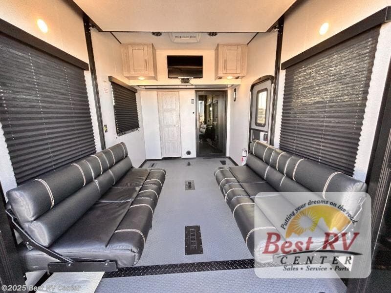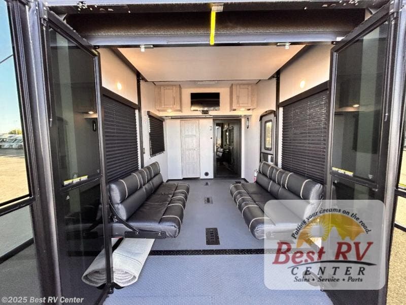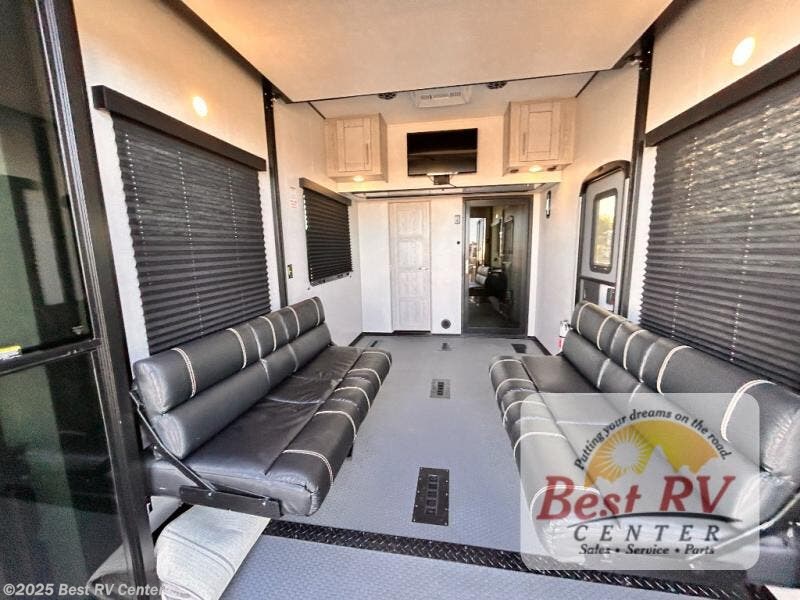 It's a clean decision to take this toy hauler on your next adventure with two full bathrooms! Everyone will have a comfortable place to lay their head at night between the residential king bed in the front private bedroom and in the 13' garage area there are dual opposing sofas with a queen bed above them and a loft with a bunk mat. The chef can prepare their best meals in the kitchen with the three burner cooktop and if you chose the to add the optional dinette slide in place of the sofa then you can enjoy your meals there and play a card game afterwards. The L-shaped sofa and two-person sofa offer a comfortable place to watch your favorite movies on the LED TV with fireplace below. There is plenty of storage throughout the inside between the front master closet and overhead cabinets, as well as the exterior with the rear Fuzion utility storage and the front Fuzion stor/mor box!