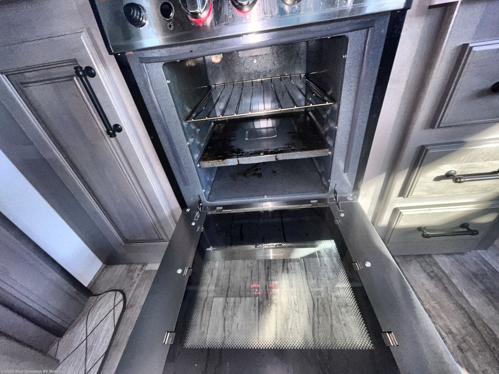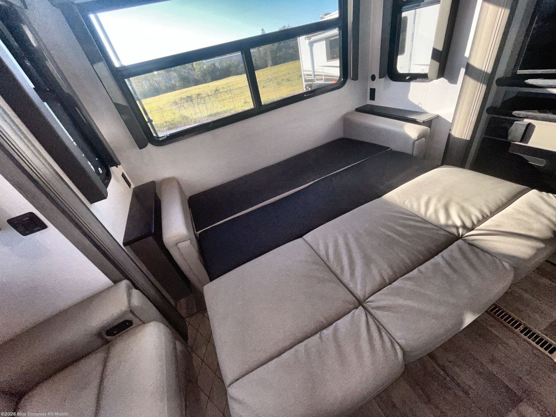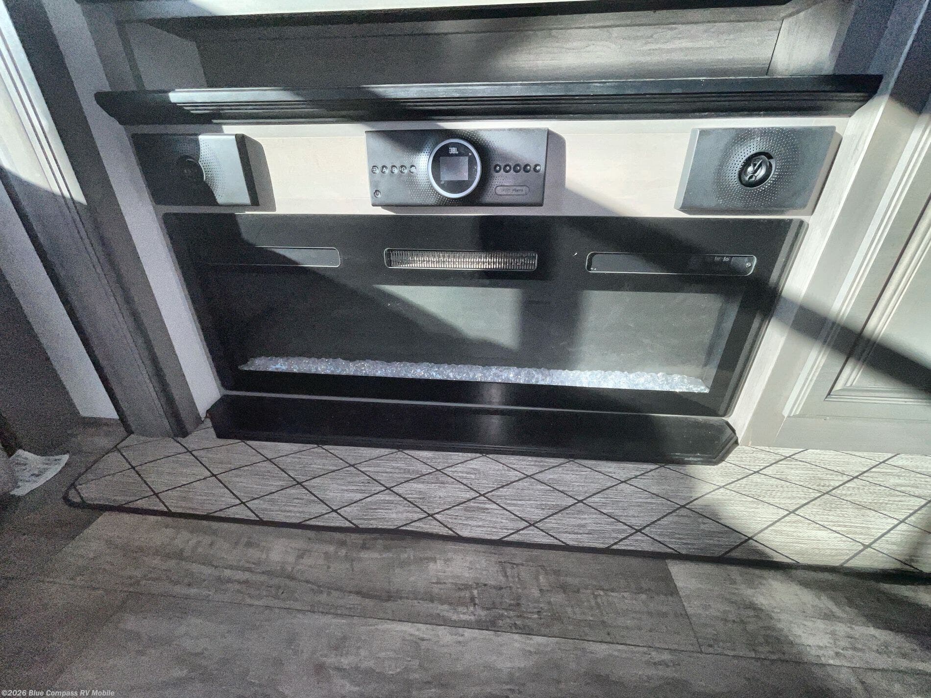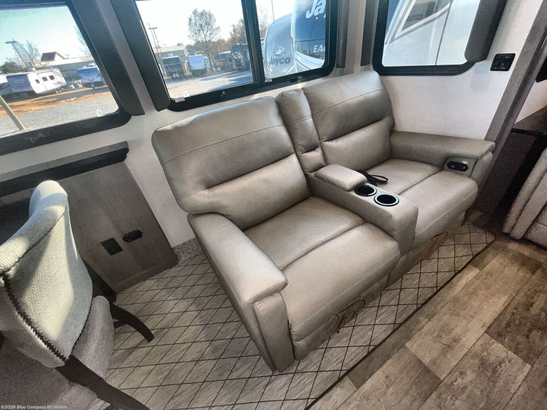 Luxury abounds throughout this fifth wheel! Starting in the kitchen with the island, two pull out pantries with extra countertop space above it, a glass top range with a pull-down spice rack in the range hood, and a pull out countertop for more prepping space. The full bathroom has a 48" x 30" fiberglass shower with a seat, decorative glass enclosure, and skylight above it for more natural lighting as two get ready at once with the dual sink vanity. Sleep like a baby in the front private bedroom on the king bed slide with storage underneath and keep your clothes looking their best with the front closet that has a clothing hamper and an area prepped to add the optional stackable washer and dryer. The rear living area offers true relaxation with a hide-a-bed sofa and power Thomas Payne theater seating across from the entertainment center with a 5,000 BTU decorative fireplace heater and 50" Smart TV to watch your favorite movies!